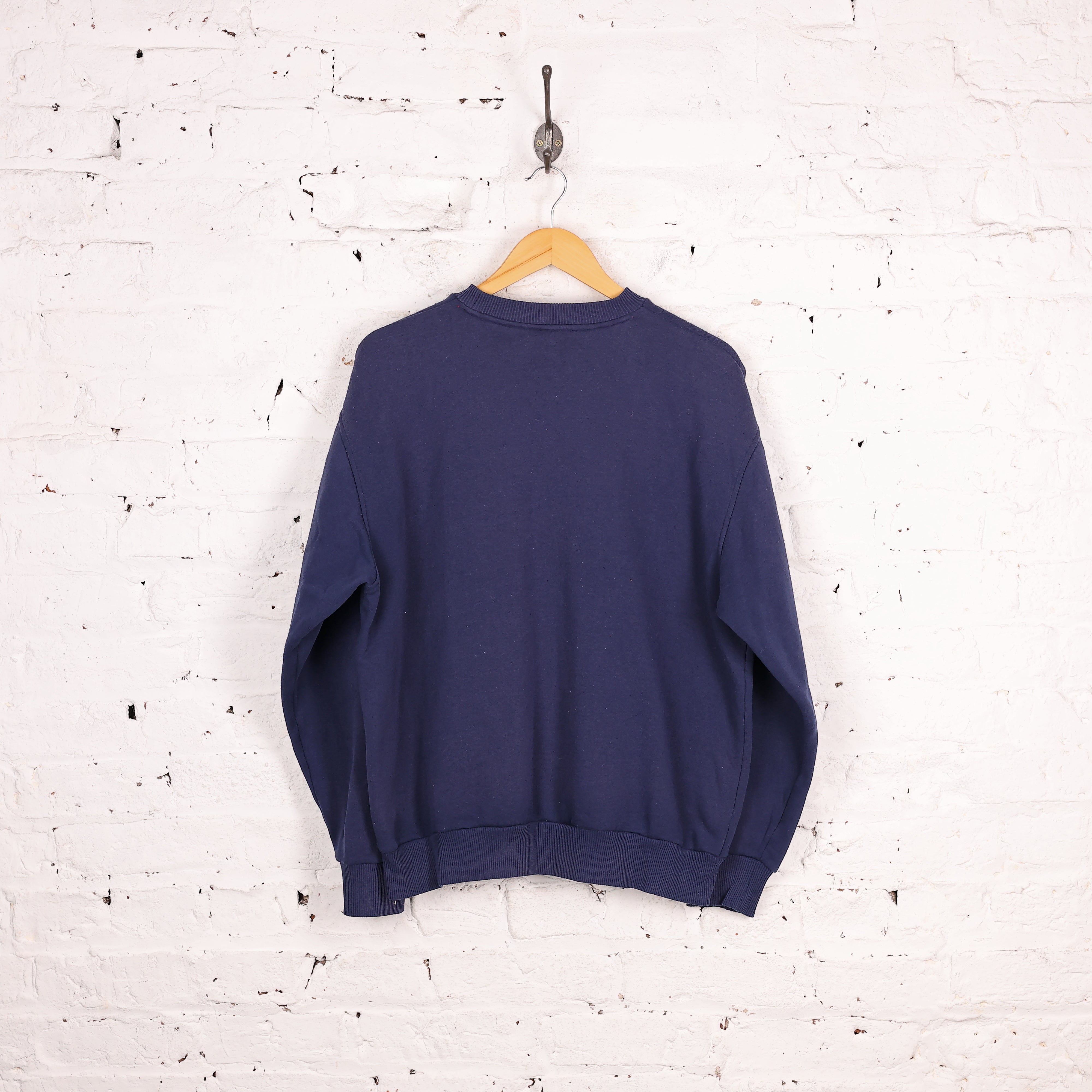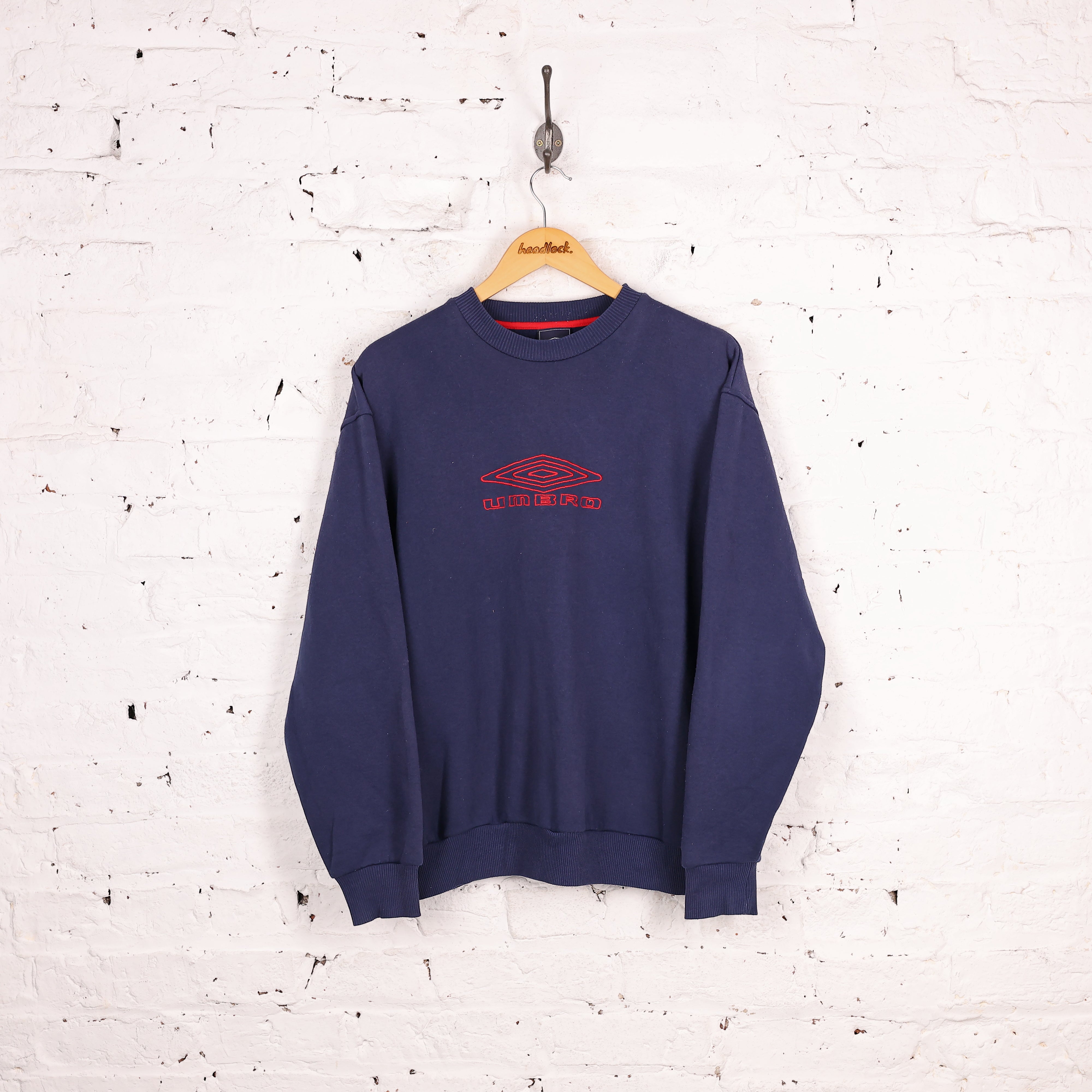 Good condition, slightly bobbled fabric. Umbro sweatshirt in blue with stitched red logo across the chest.