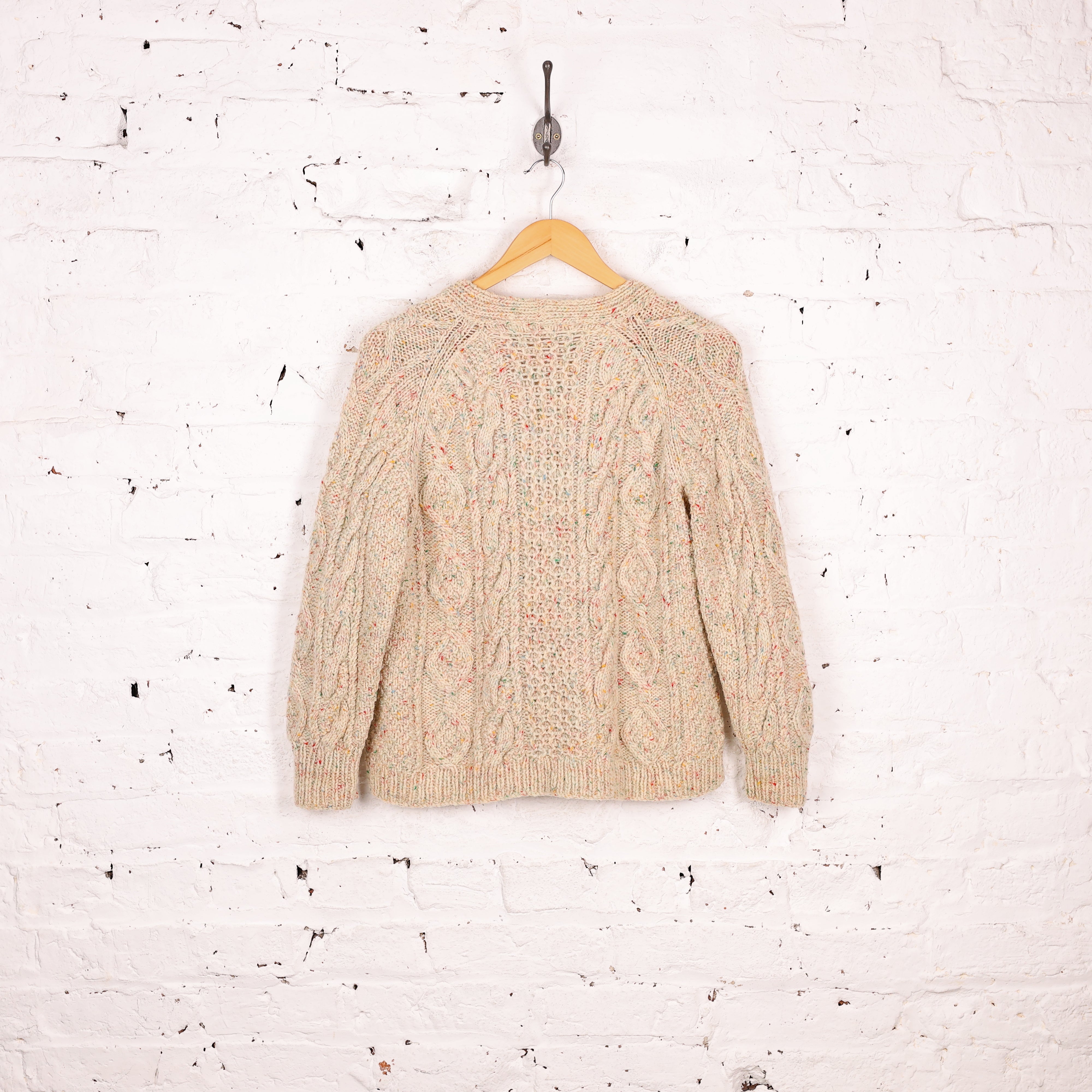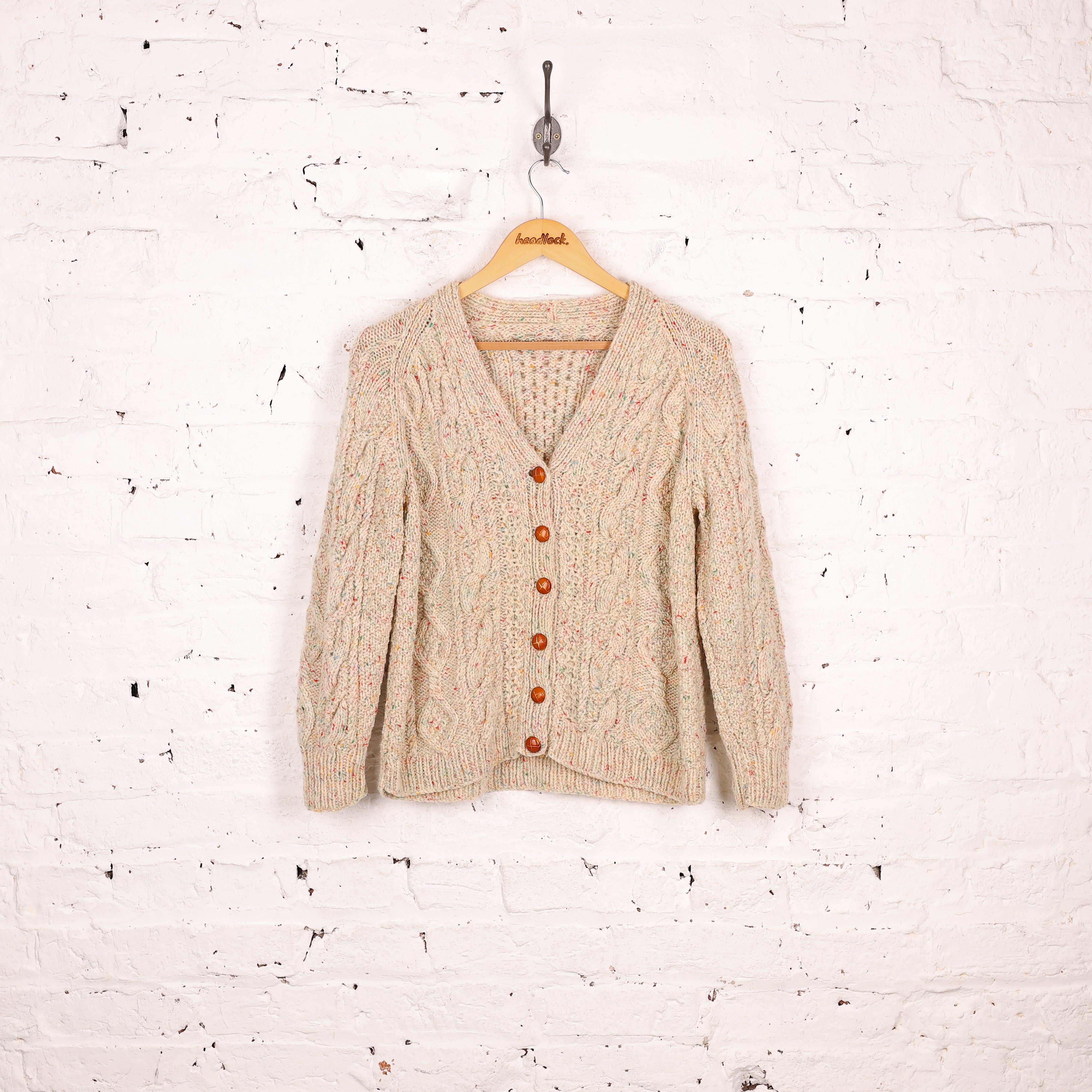 Good condition. Aran cable knit cardigan in beige colour with fleck colourful wool yarn, football buttoning fasten and crop fitting.