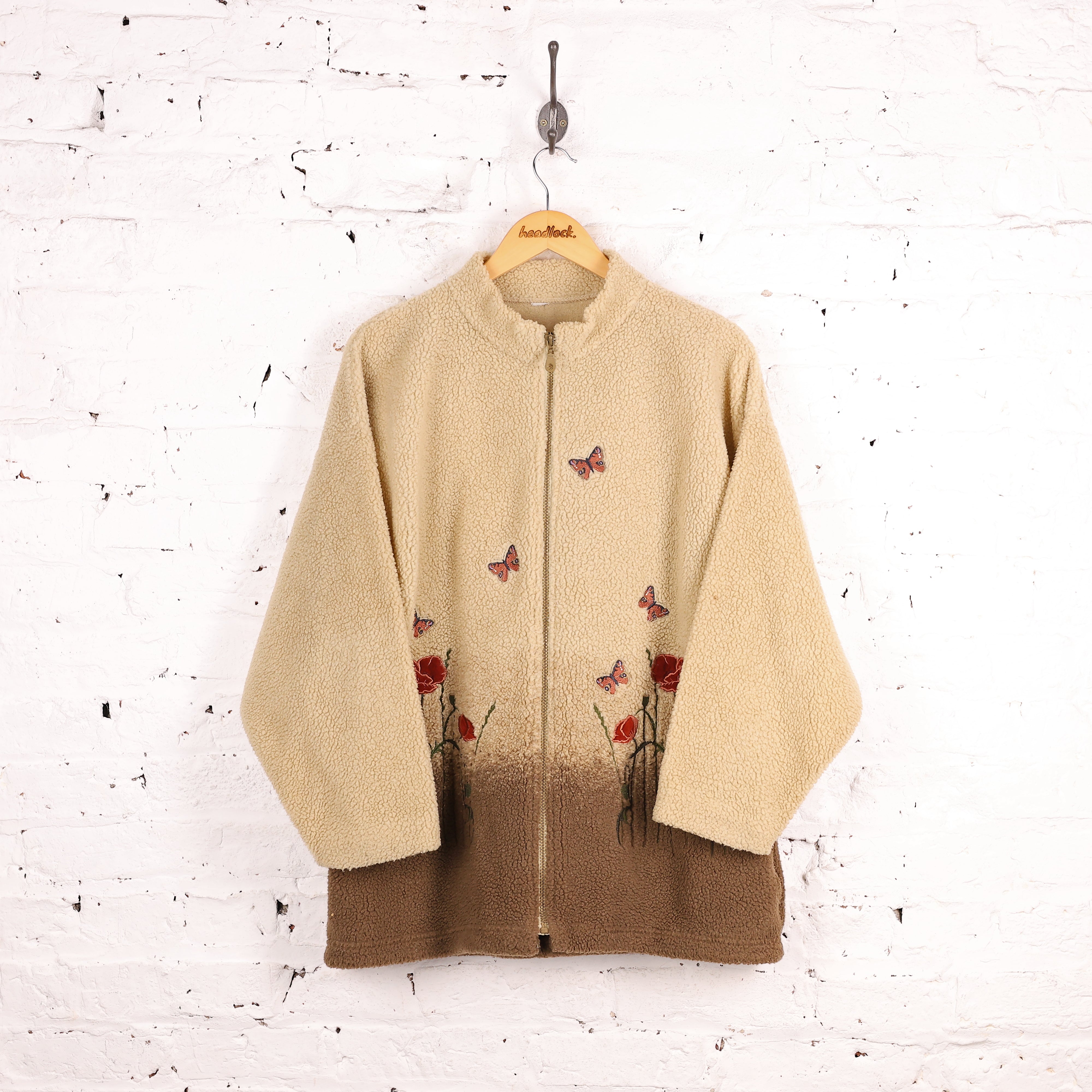 Good condition. Beige fleece with stitched flowers and butterflies on the front, Two pockets and full zip fasten