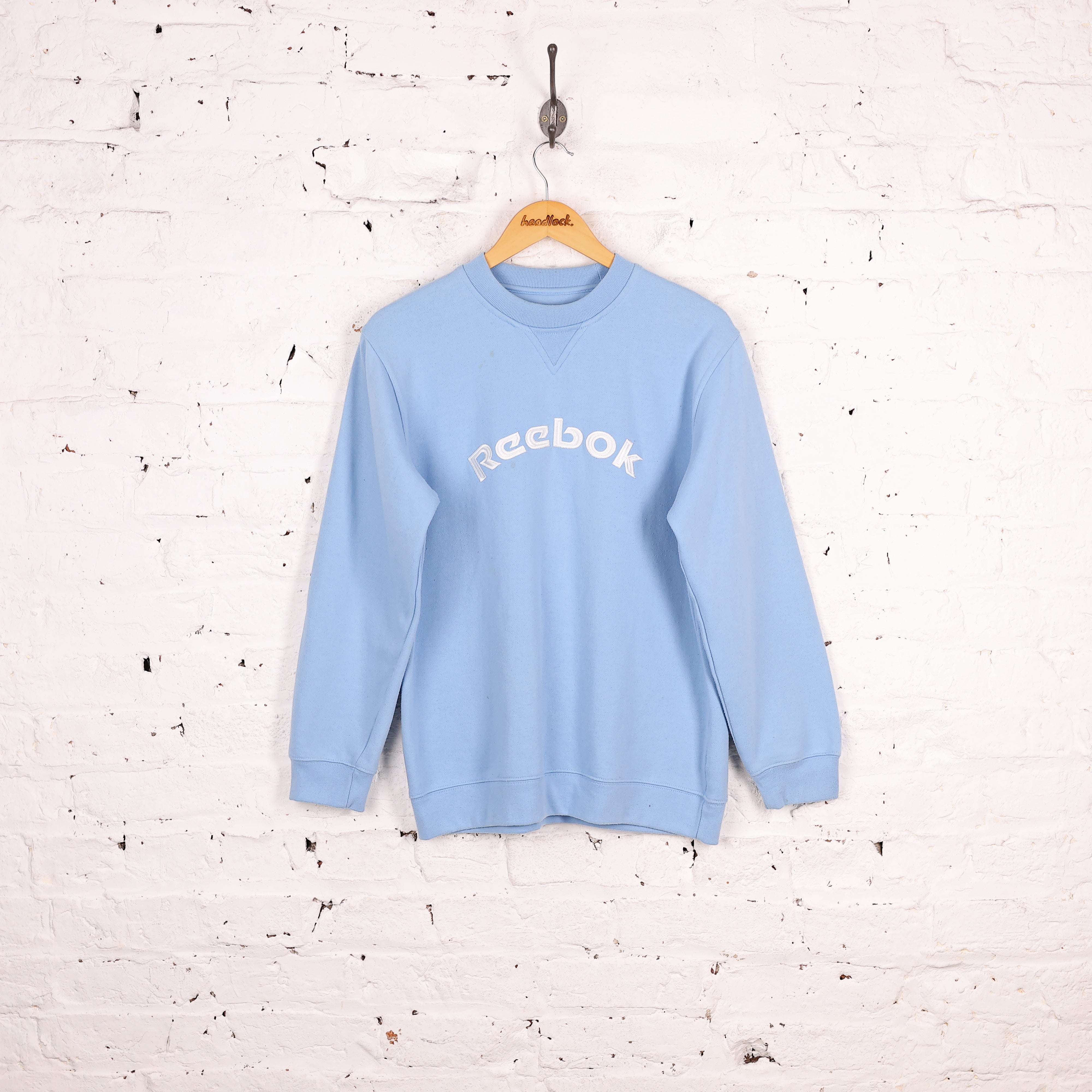 Fair condition, some pulls and small yellow marks to the front. Reebok Essentials sweatshirt in blue with stitched white lettering across the chest.