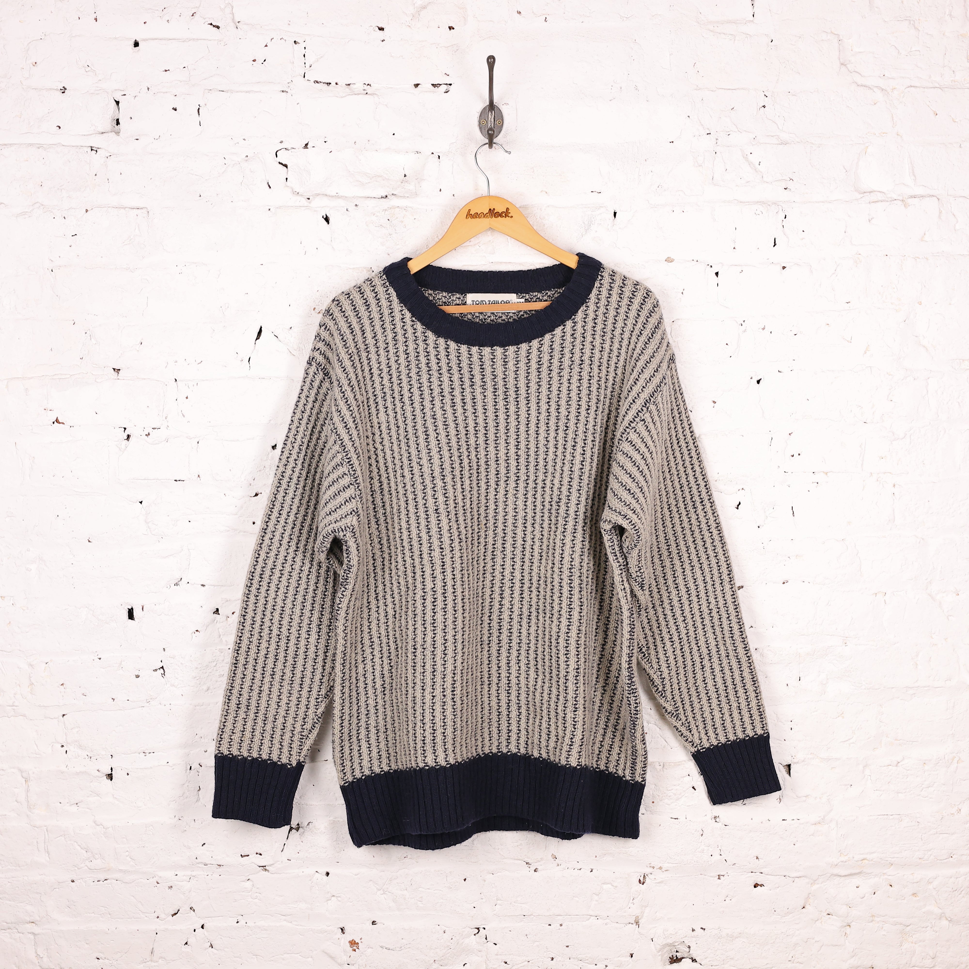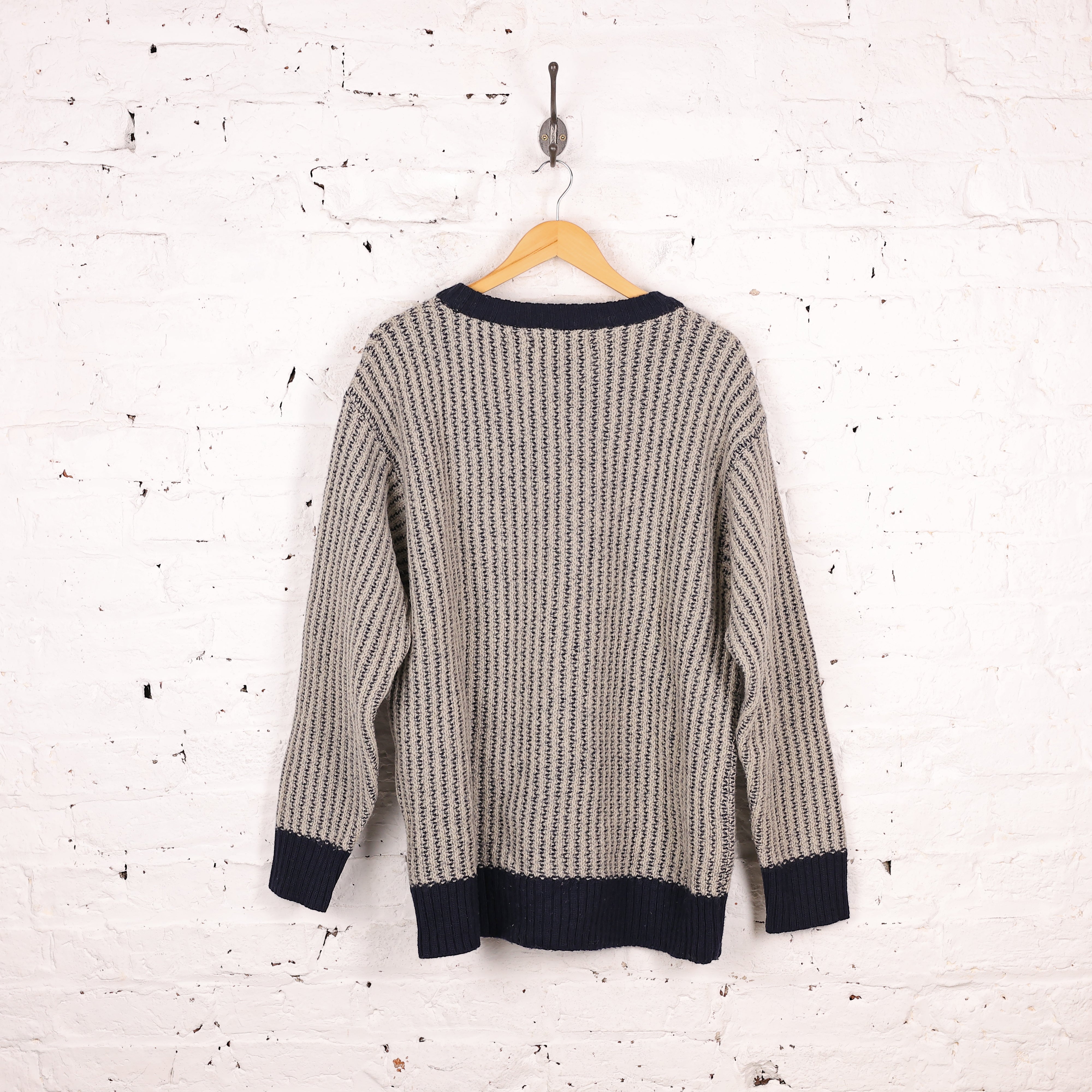 Good condition, very small mark to the front. 100% Pure wool fisherman knit jumper in grey and blue colours