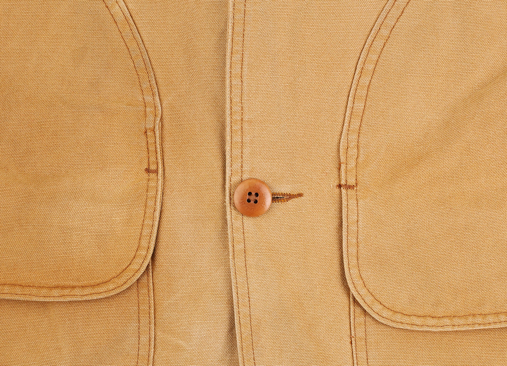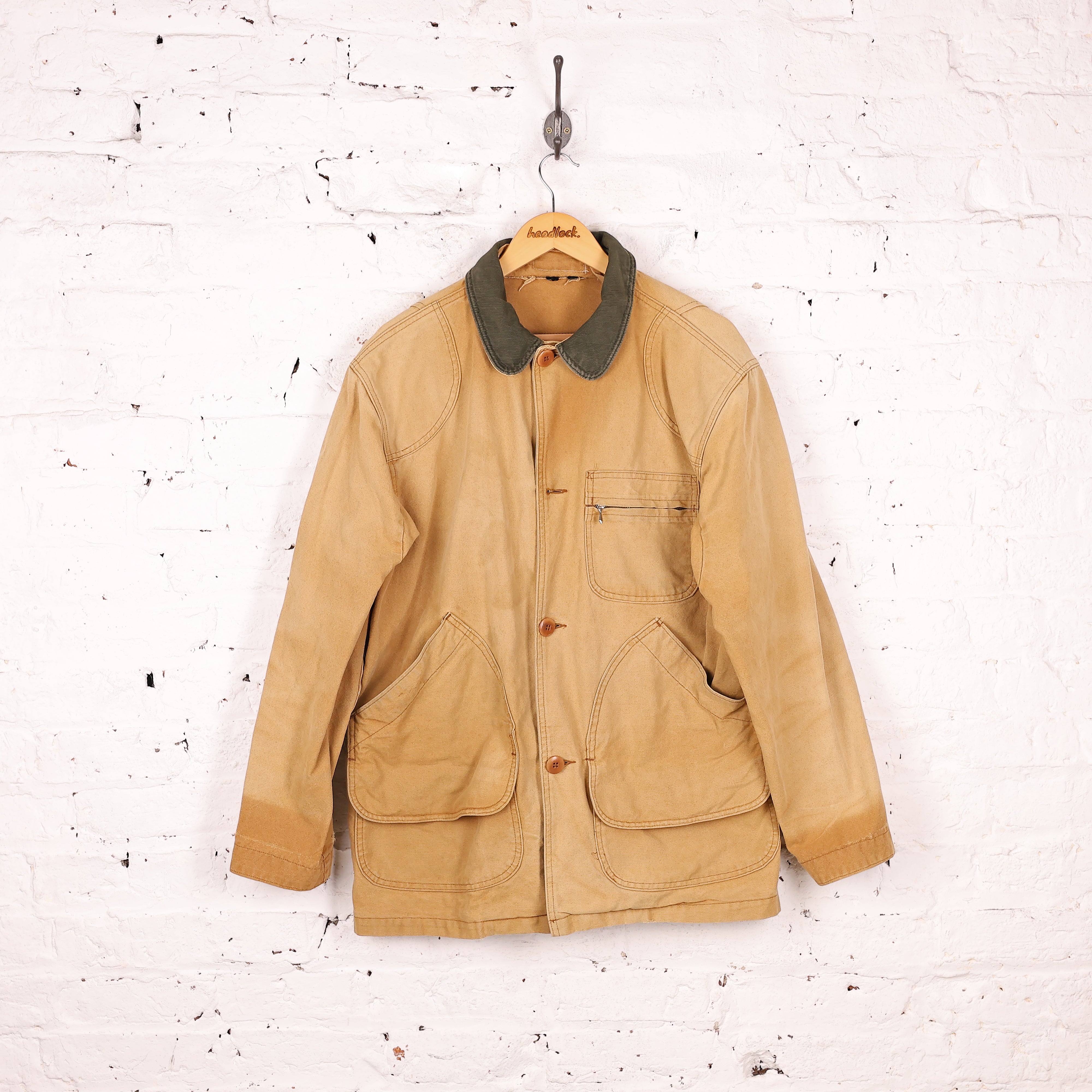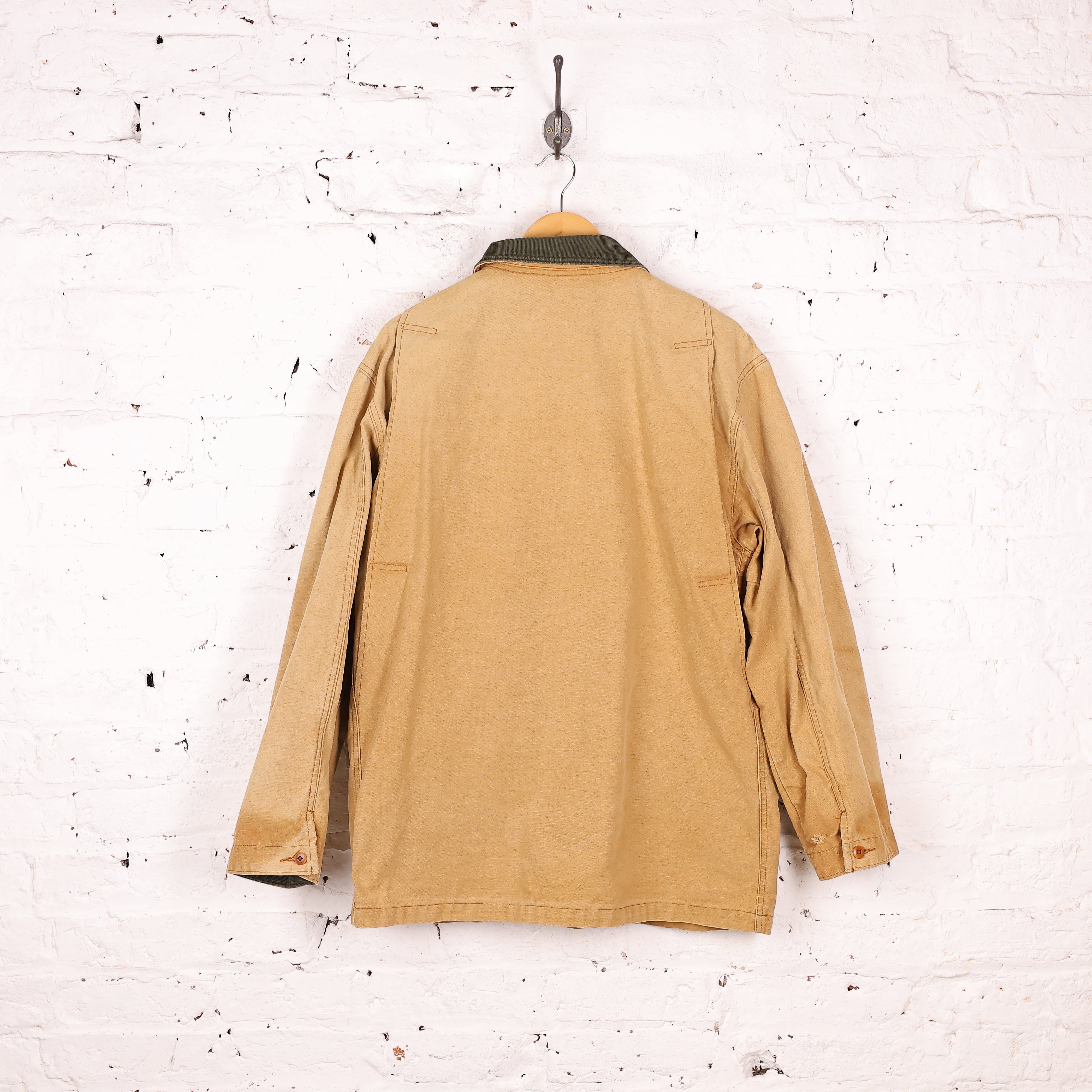 Good condition but missing the second button. LL Bean barn jacket in sand with green cord collar and double pockets.