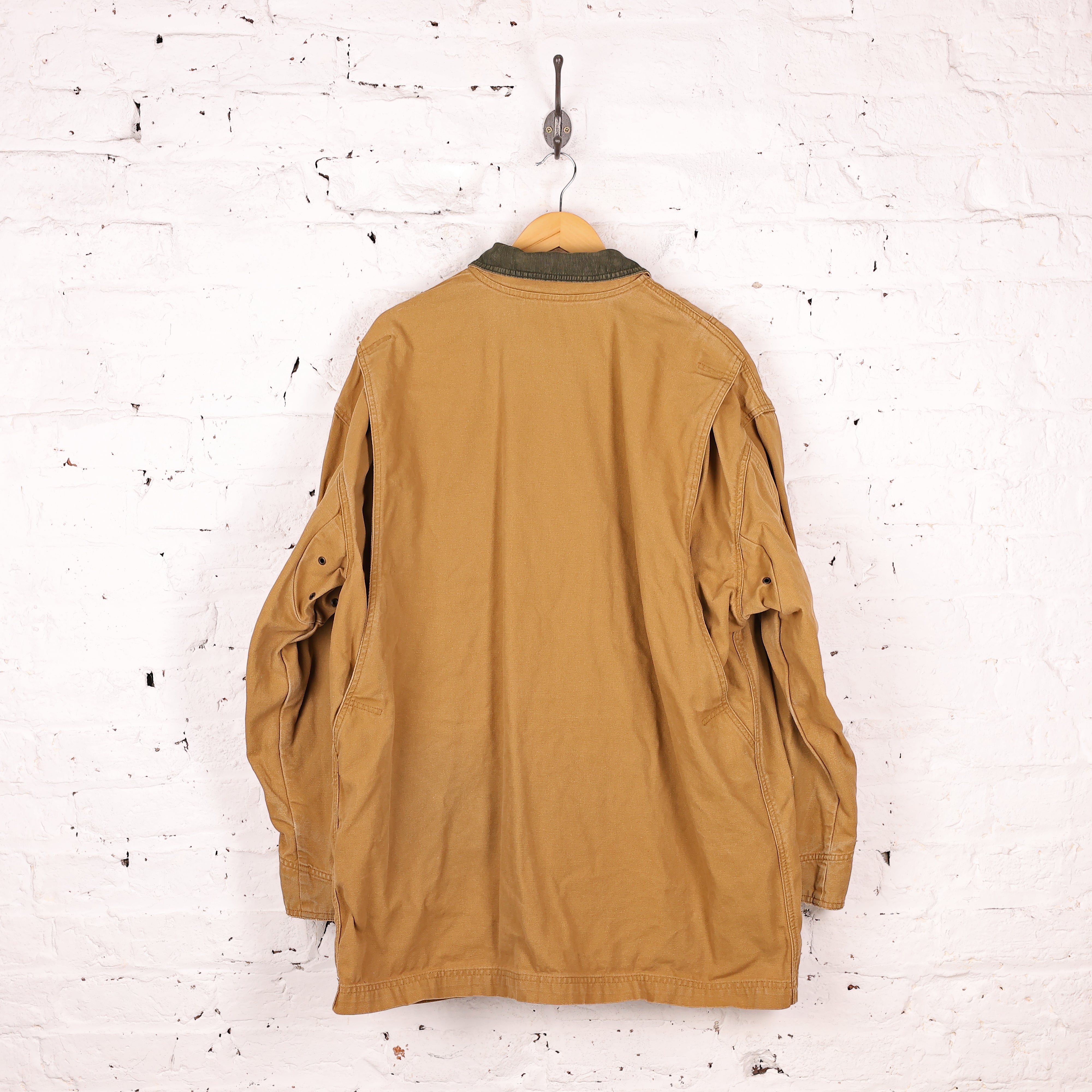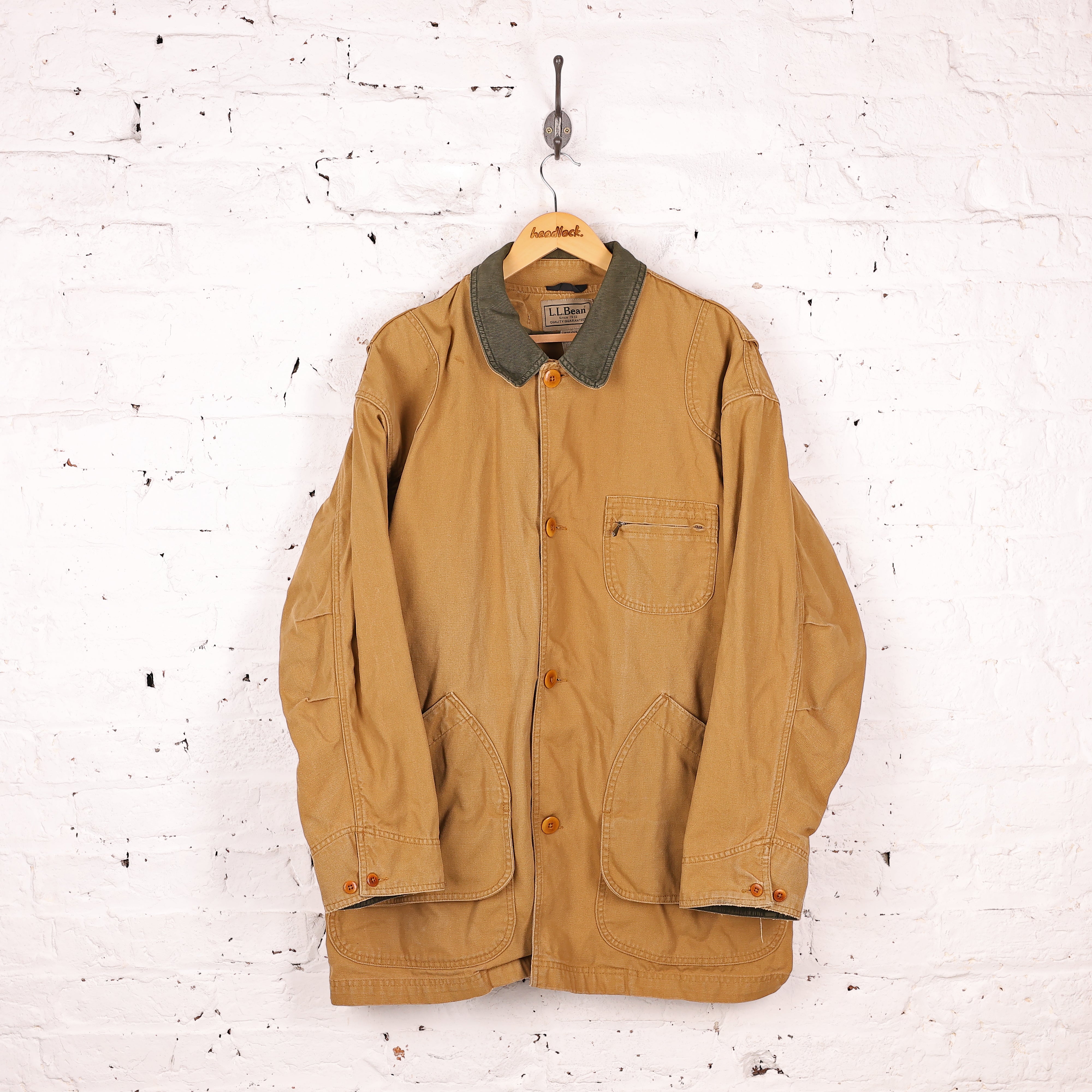 Excellent condition. LL Bean barn jacket in brown/sand colour, green cord collar and double outer pockets.