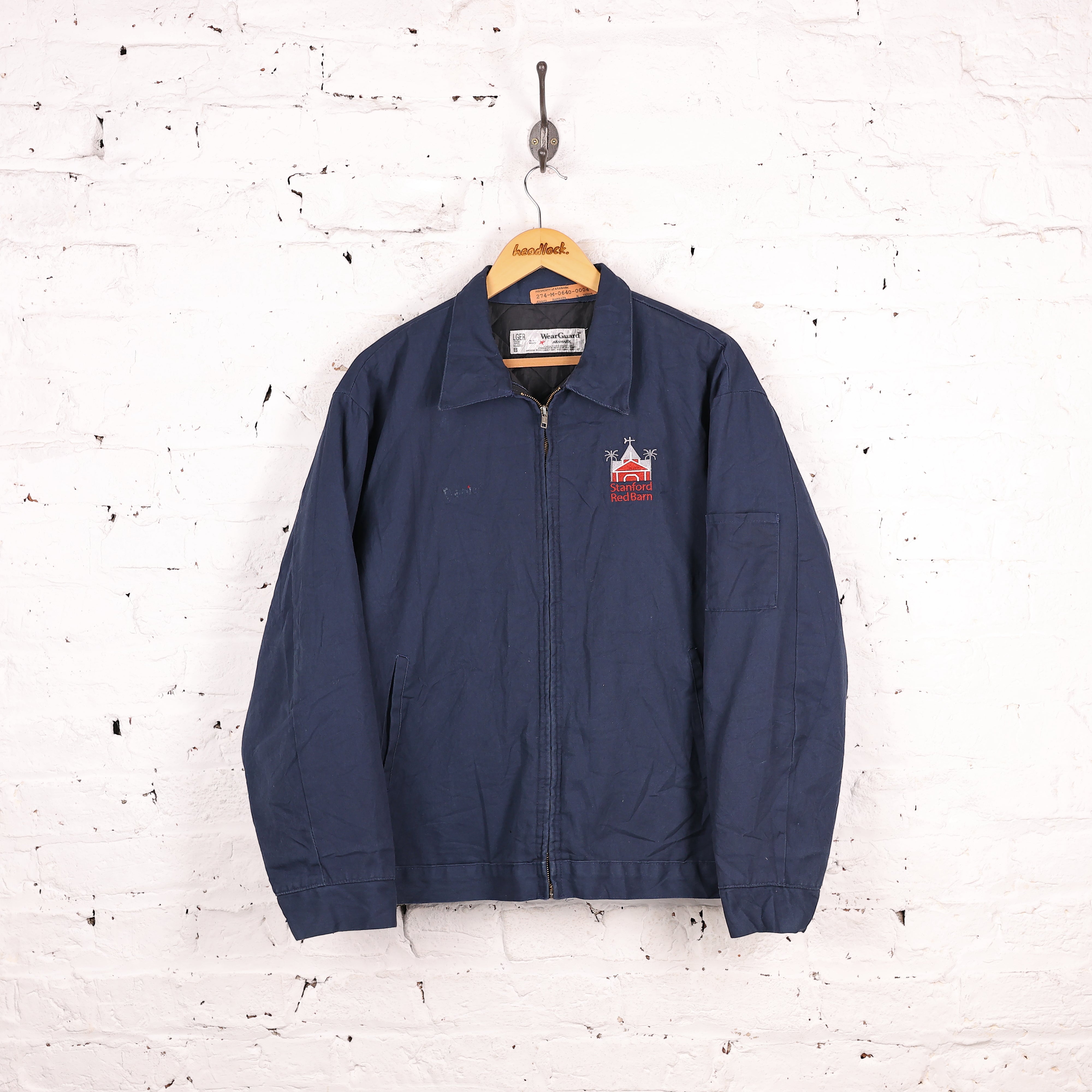 Good condition but slight mark to the front where a badge has been removed. American worker jacket with Stanford Red Barn on the front, zip fasten, two pockets and quilted inner lining.
