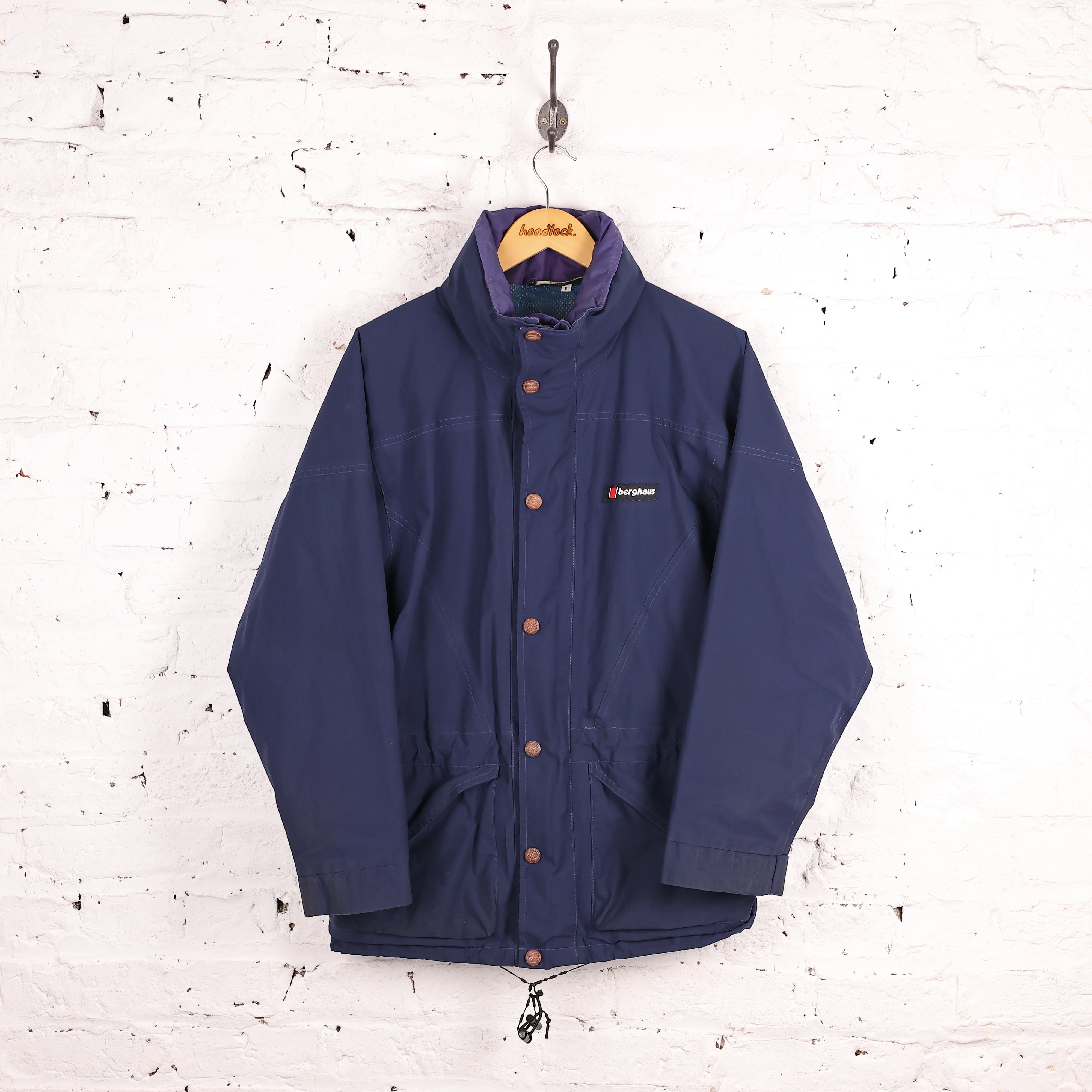 Good condition, some small wear. Berghaus Cornice I.A jacket in blue with stitched logo, zip fastens and hood in the collar.