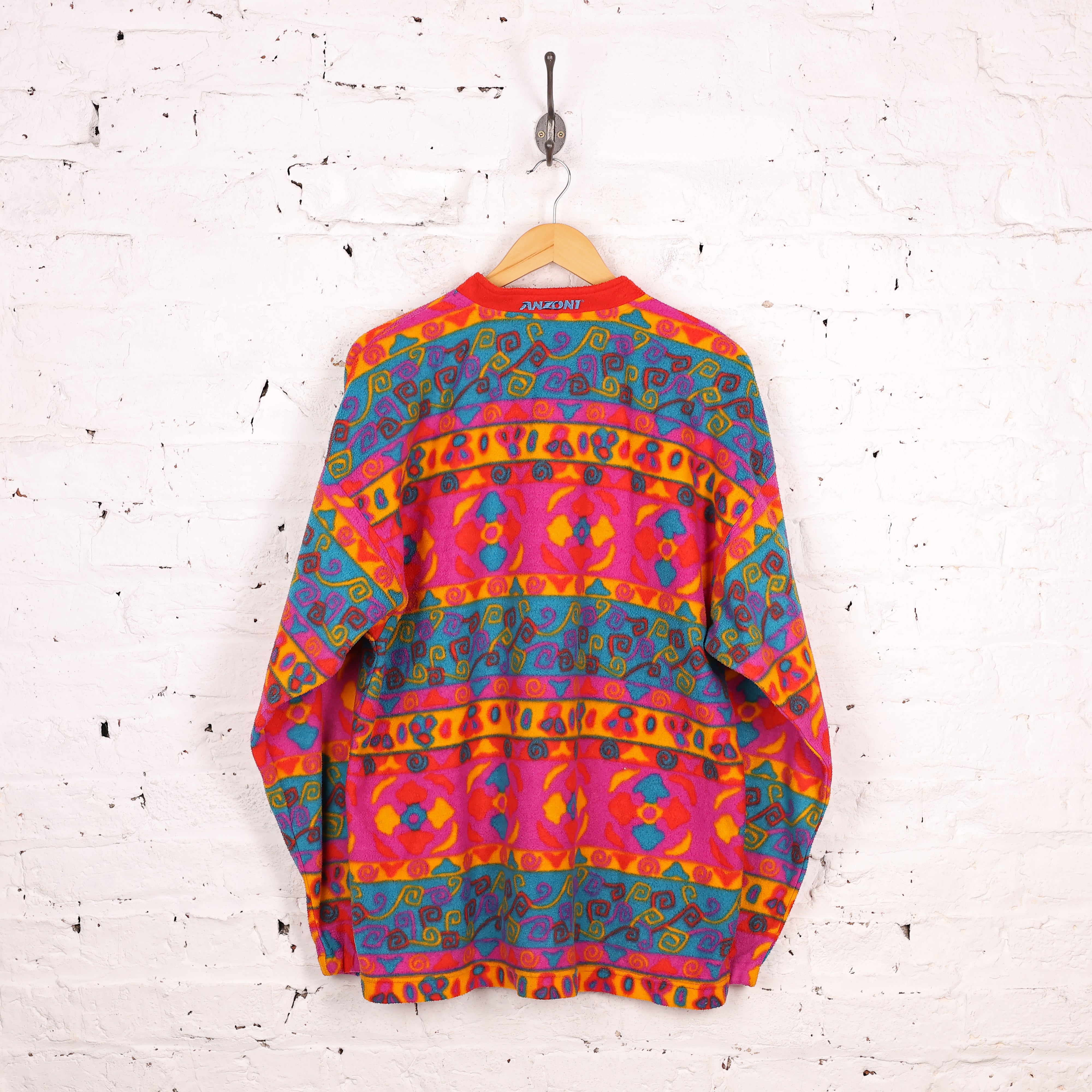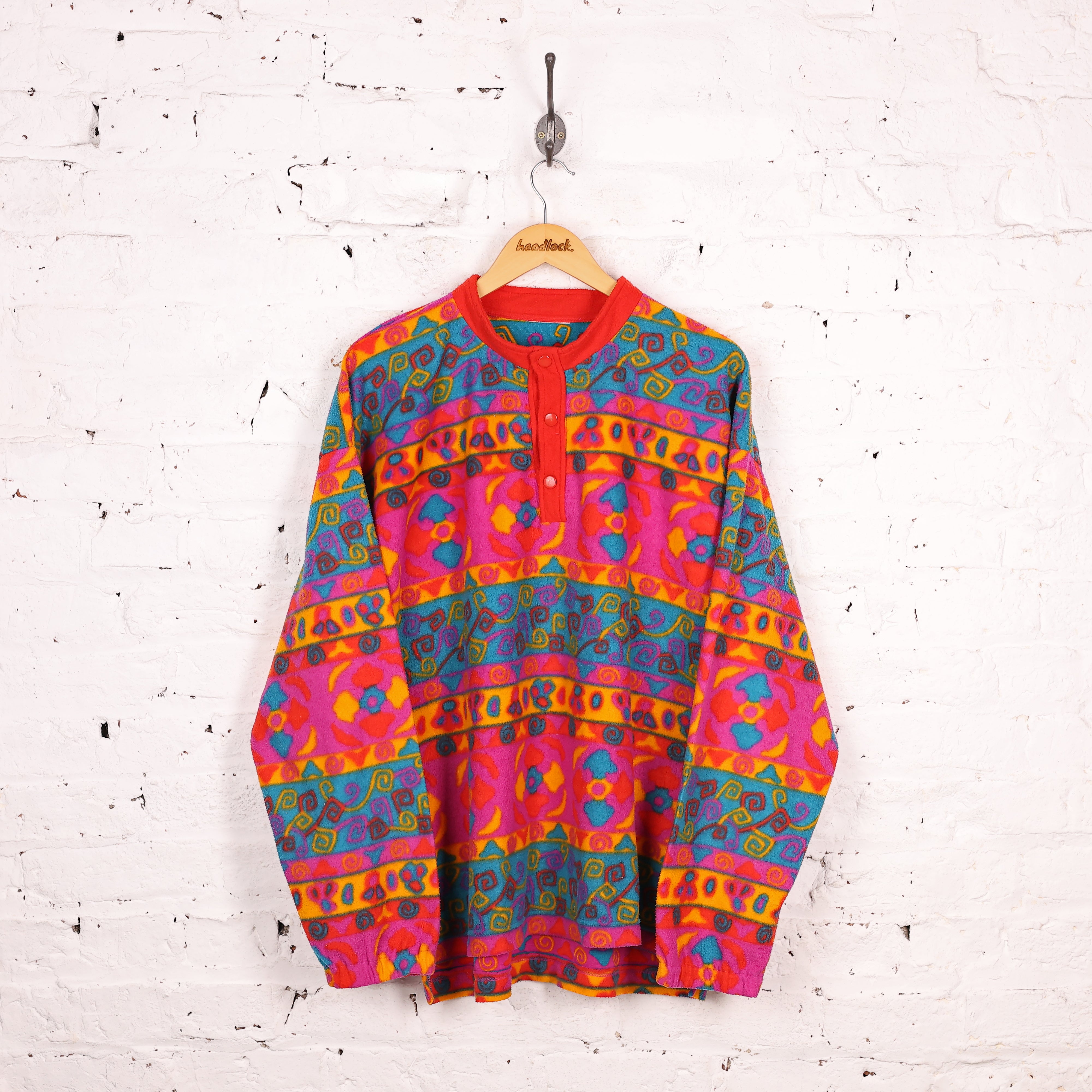 Good condition. 90s pattern fleece with button collar and round neck. In red, purple, green colours.