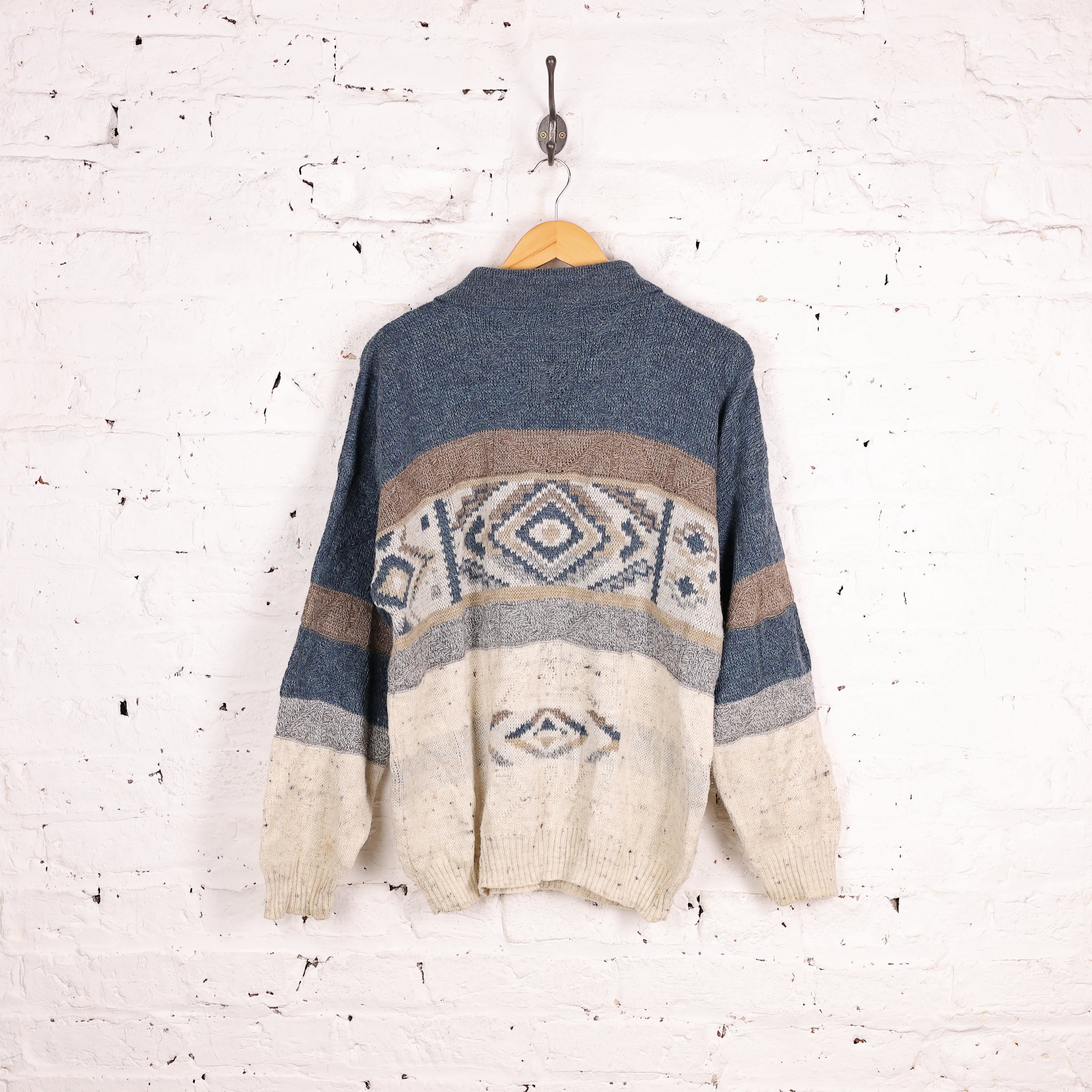 Good condition. Beige and blue pattern knit jumper with button collar.