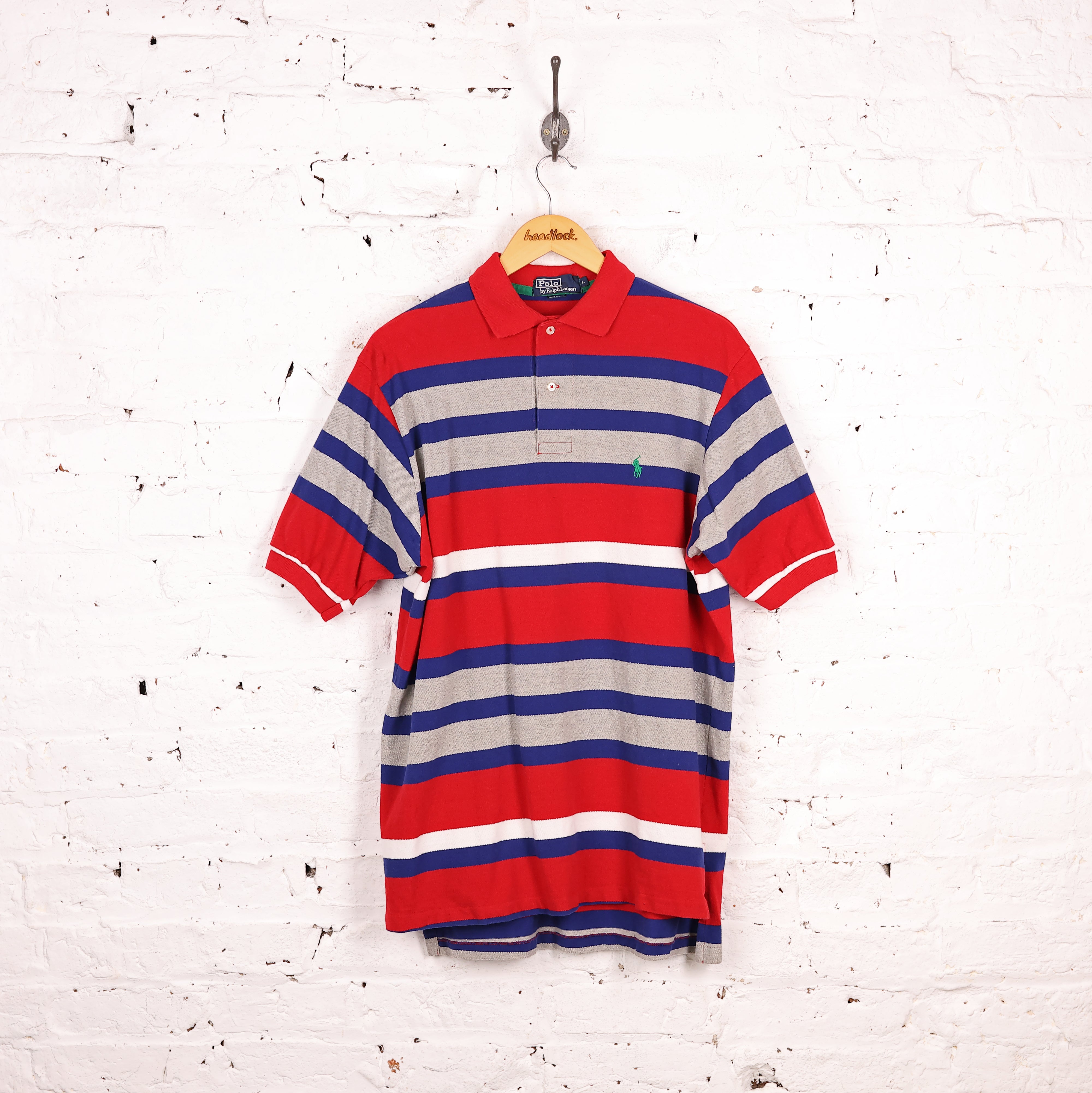 Good condition. Ralph Lauren short sleeve striped polo shirt in red, blue, grey and white with stitched logo on the chest.