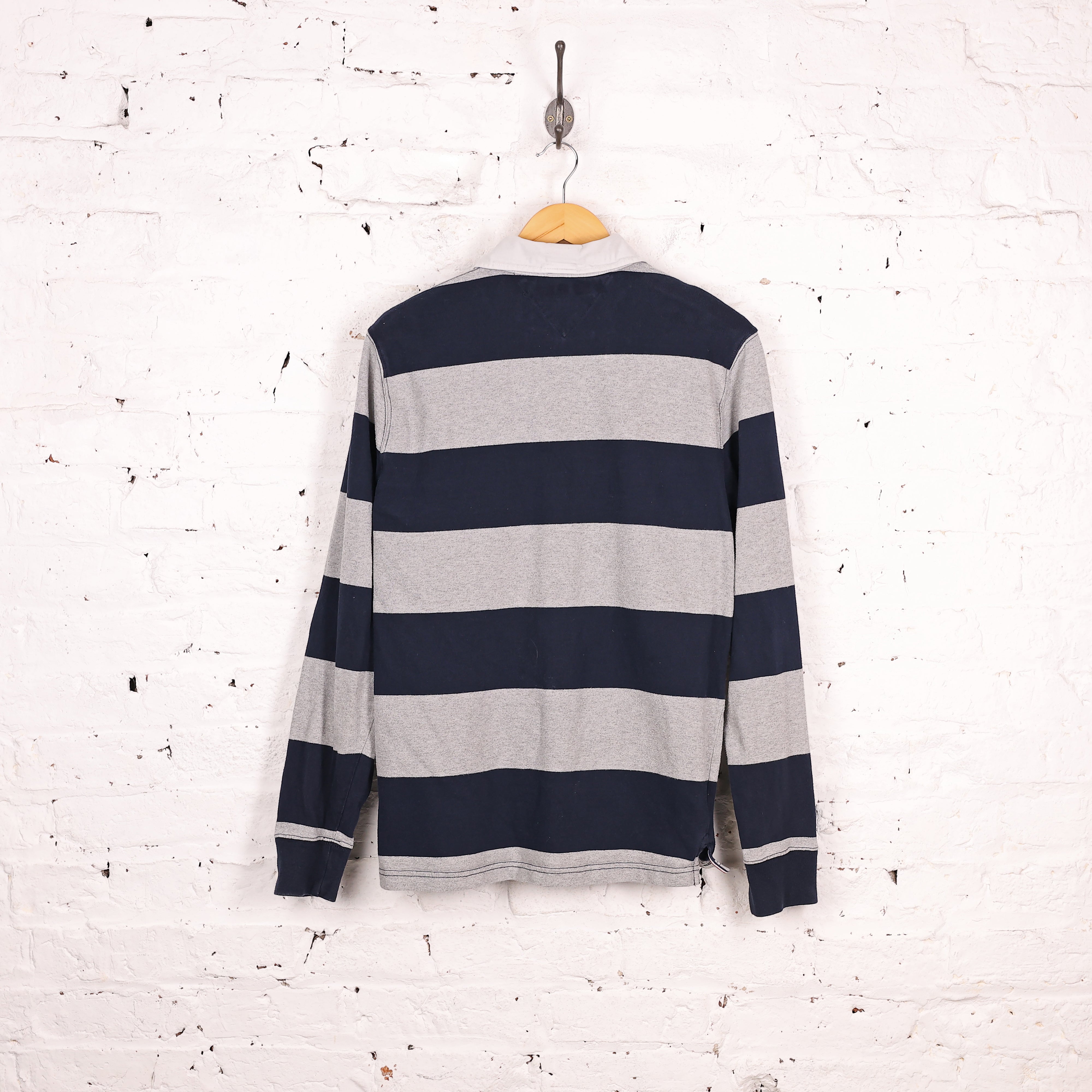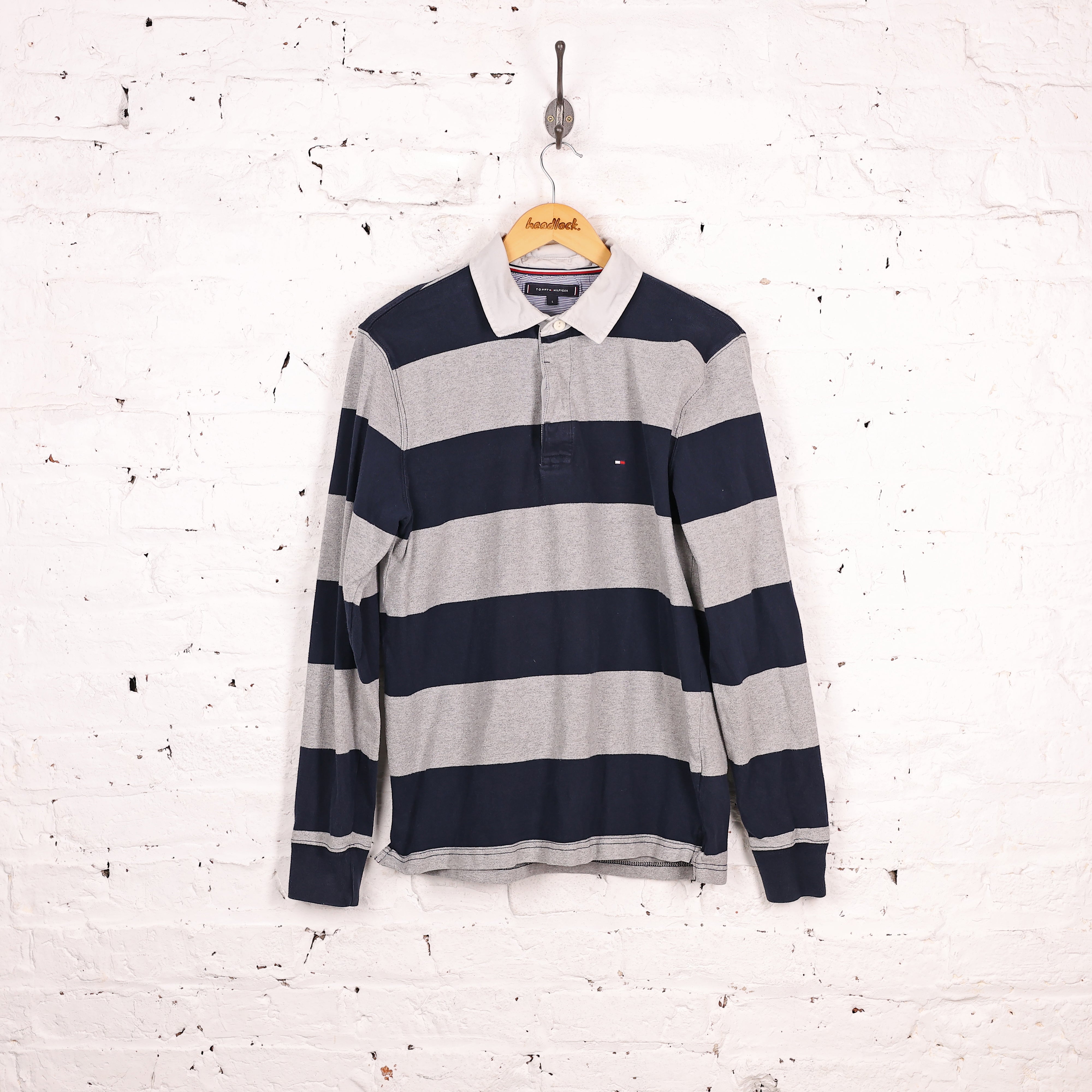 Good condition. Tommy Hilfiger long sleeve polo shirt in blue and grey with stitched logo on the chest.