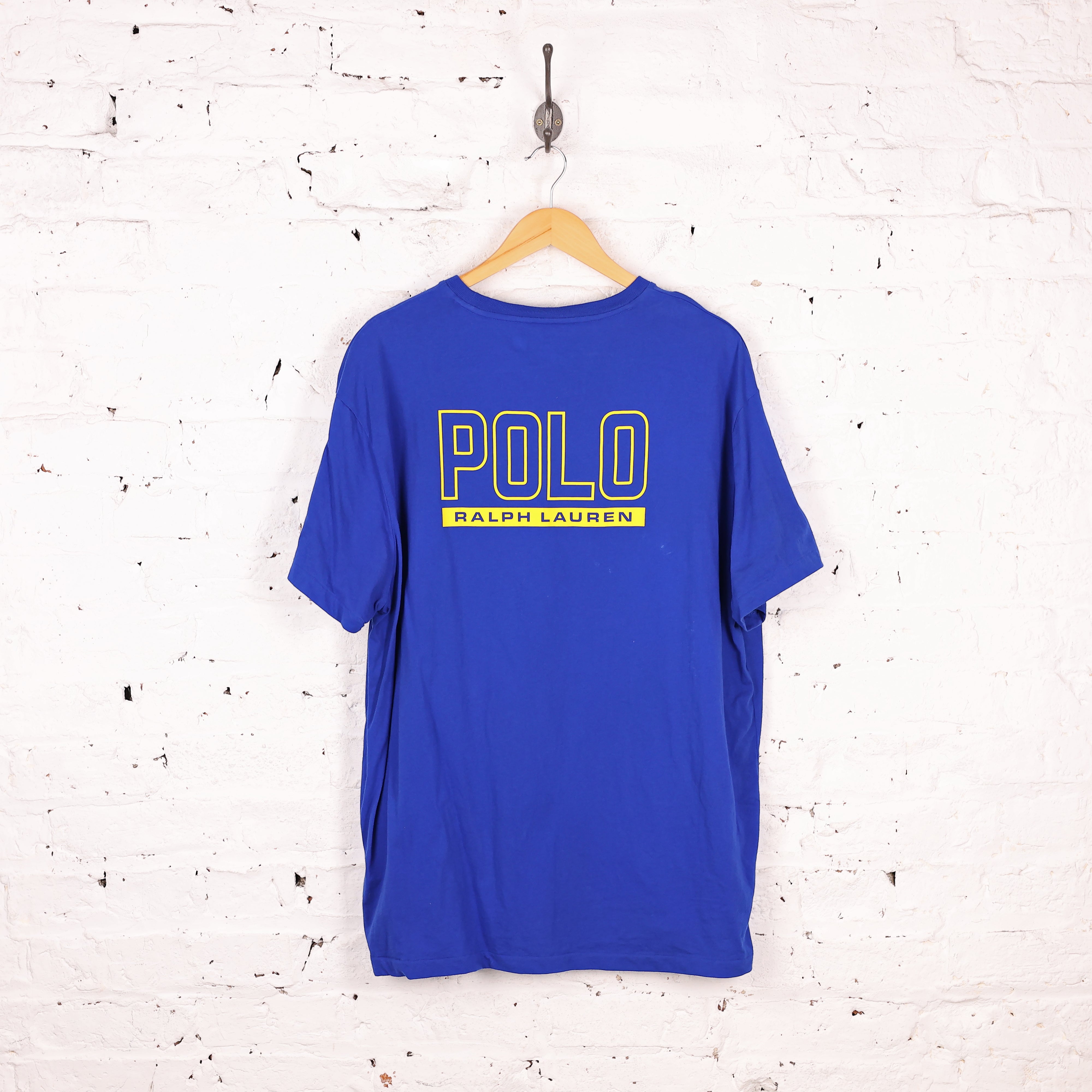 Excellent condition. Ralph Lauren polo T Shirt in blue with yellow lettering on the front and back.