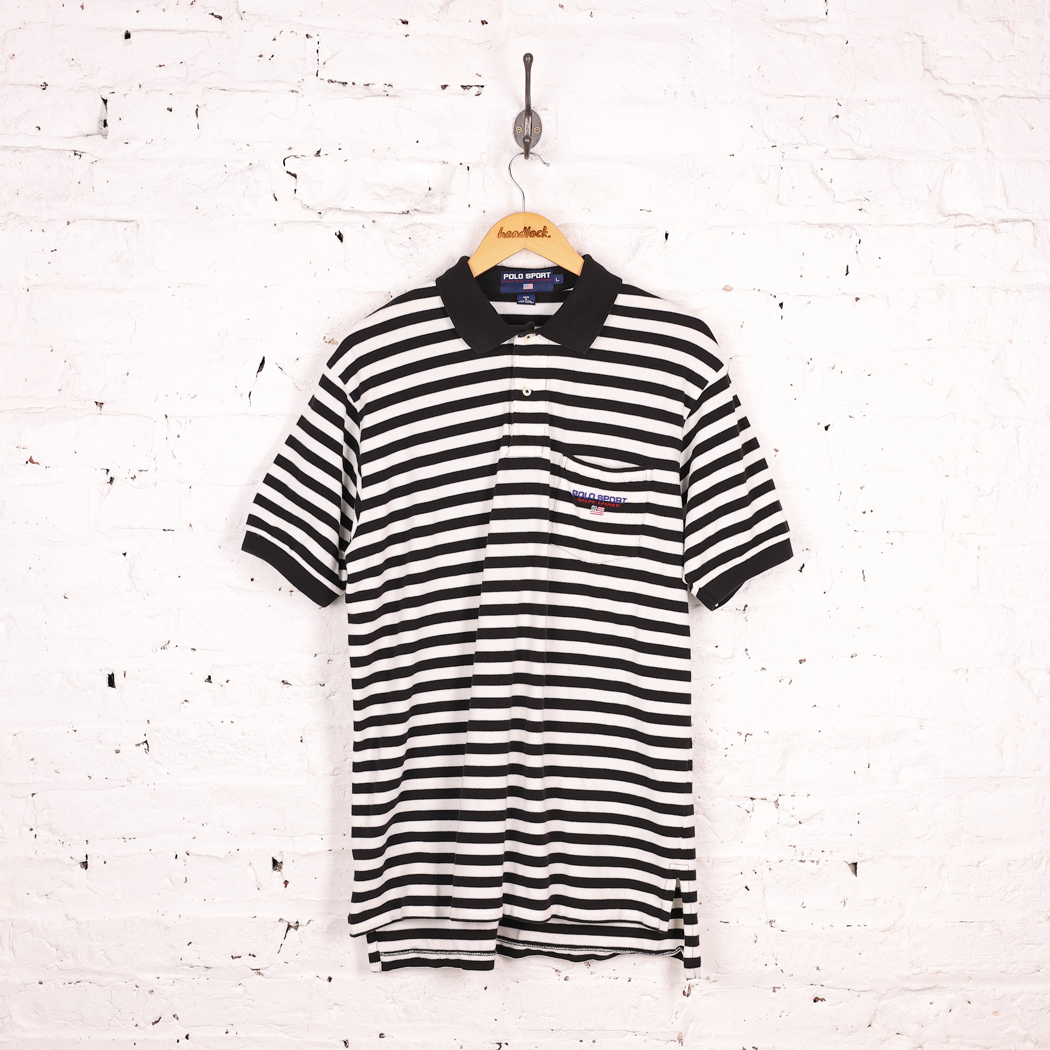 Good condition. Ralph Lauren Polo Sport polo in black and white stripe, stitched logo on the pocket.