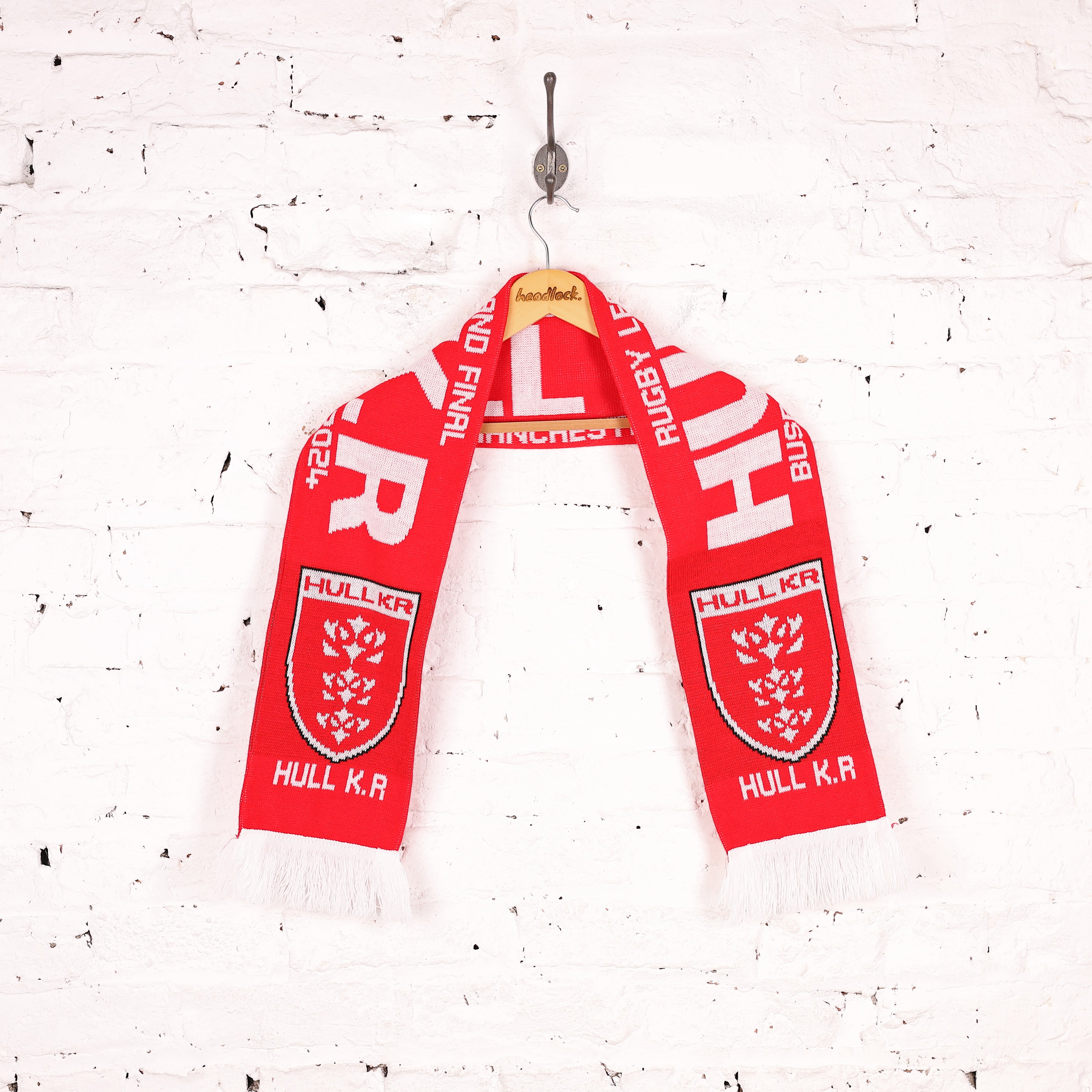 Good condition. Hull KR scarf from 2024 Super League Grand Final versus Wigan (9-2 defeat) in red and white colours with print style text and club badge.