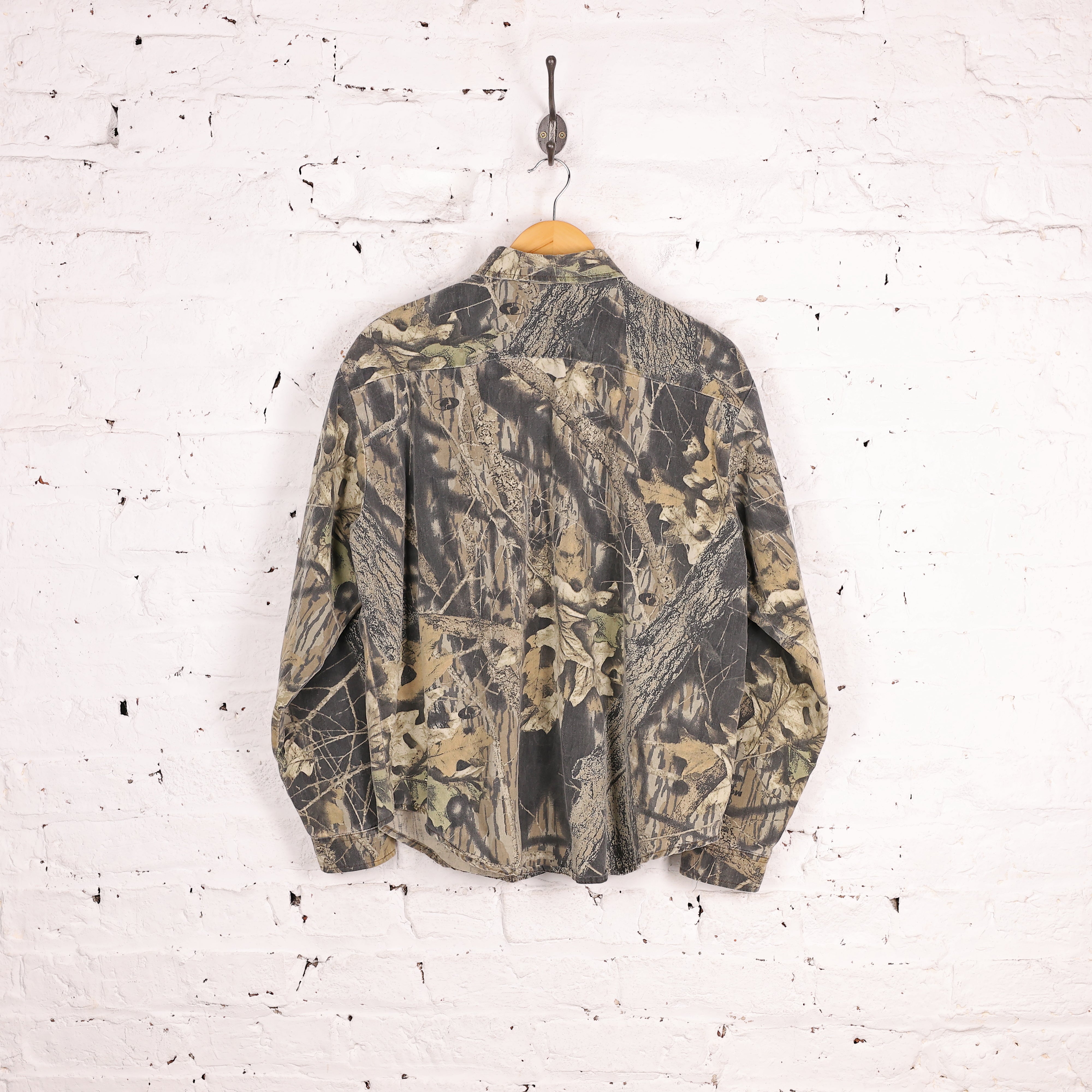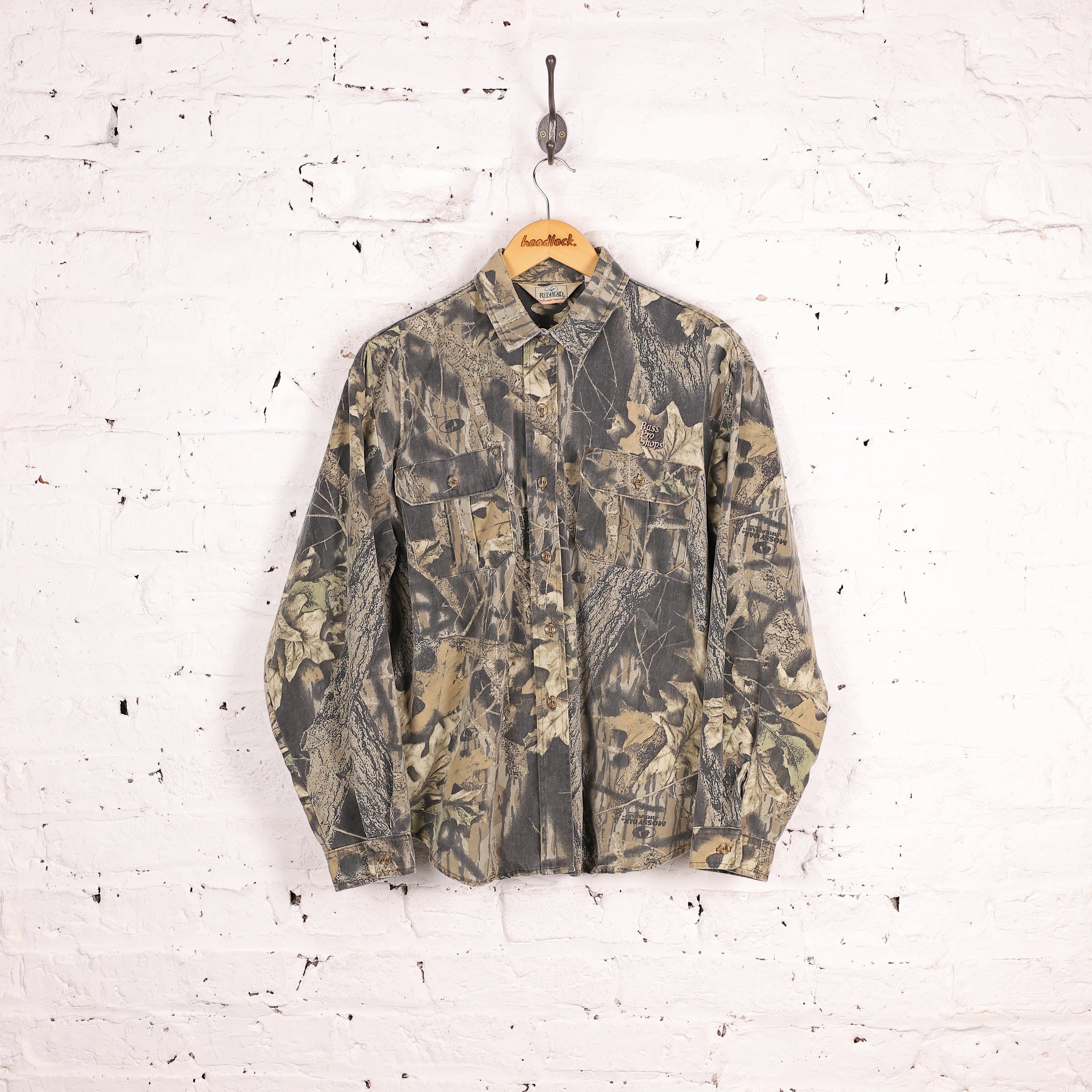Good condition. Redhead real tree camo shirt in green with two chest pockets and stitched Bass Pro Shops on the front.
