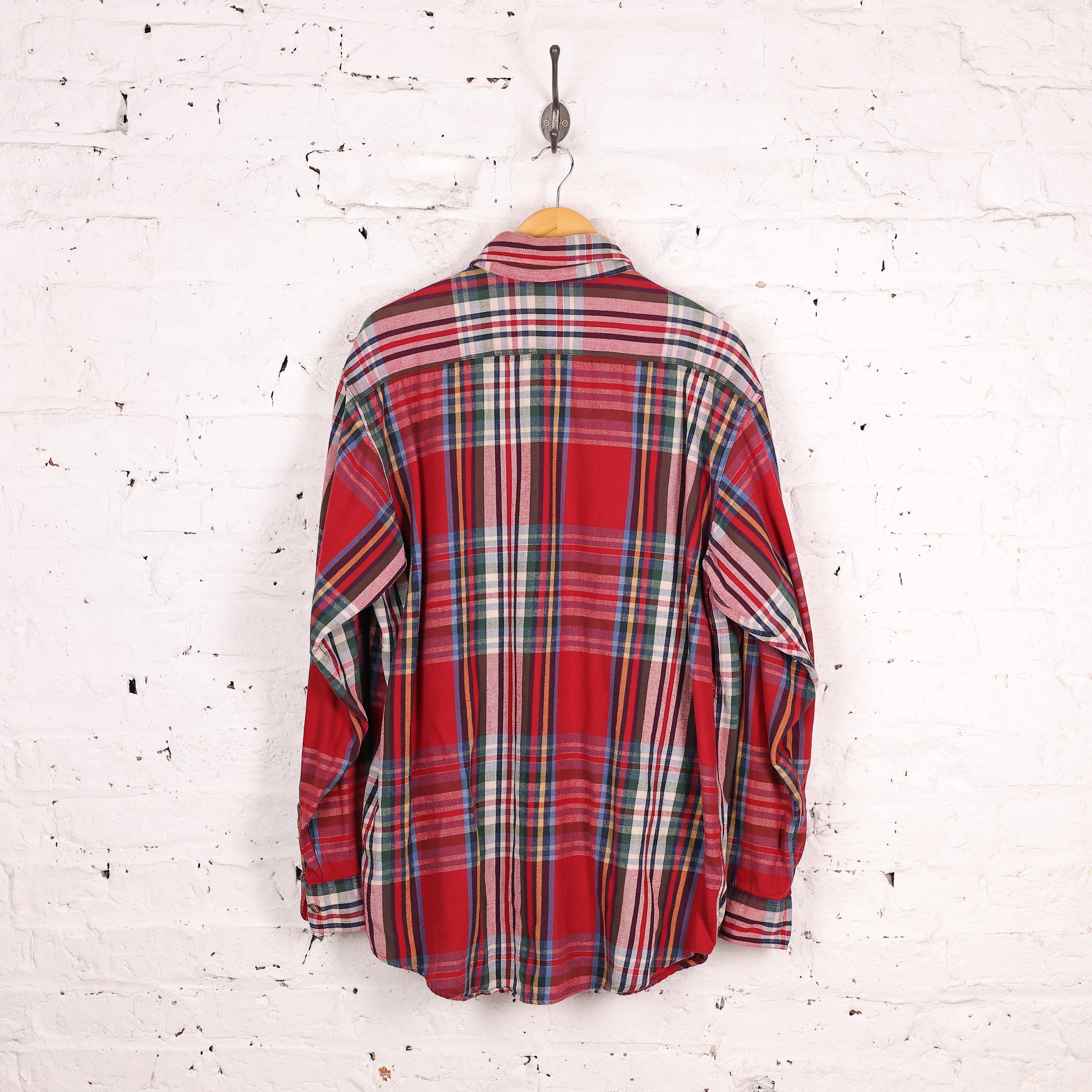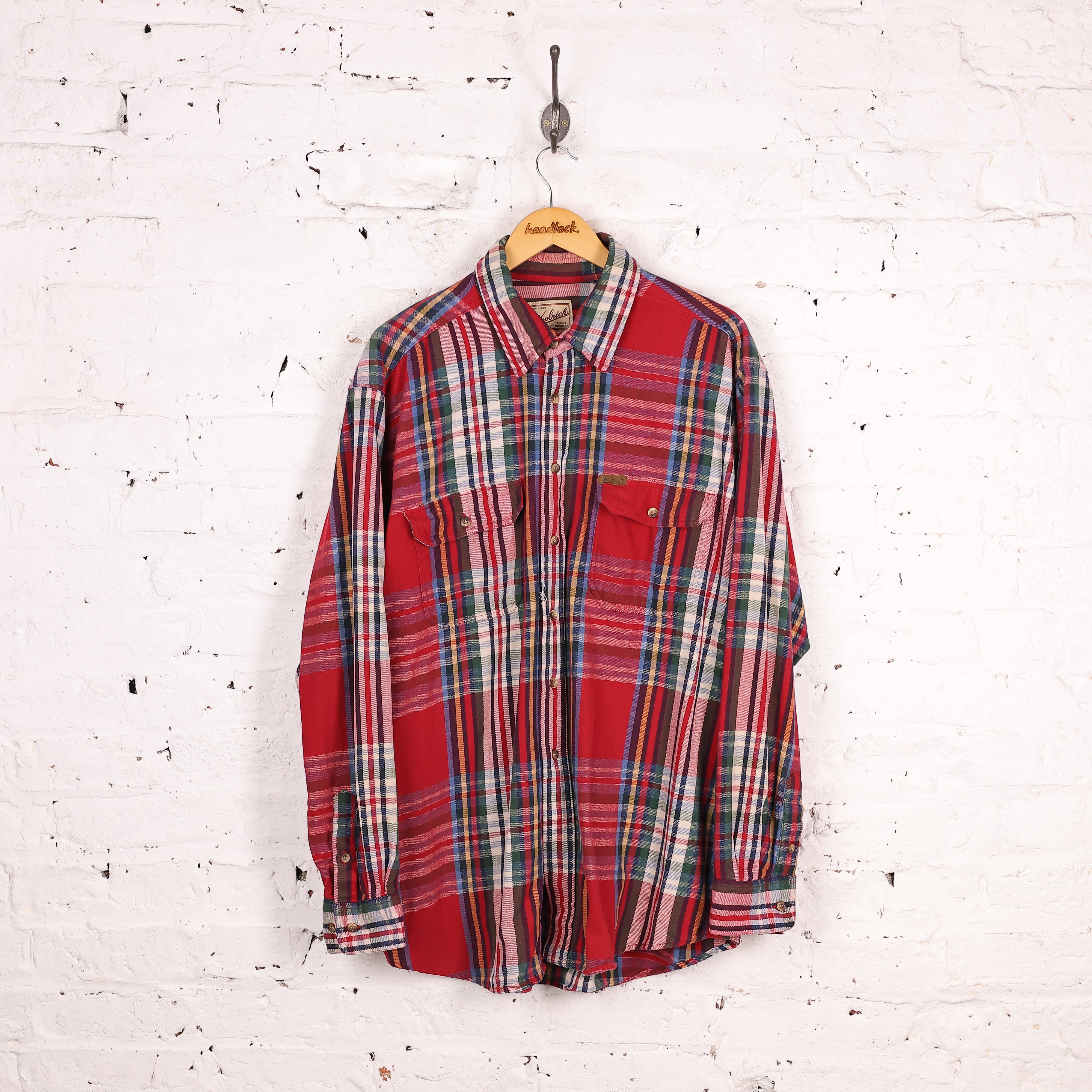 Good condition but slightly frayed near the buttons. Woolrich plaid check shirt in red and white check with two chest pockets.