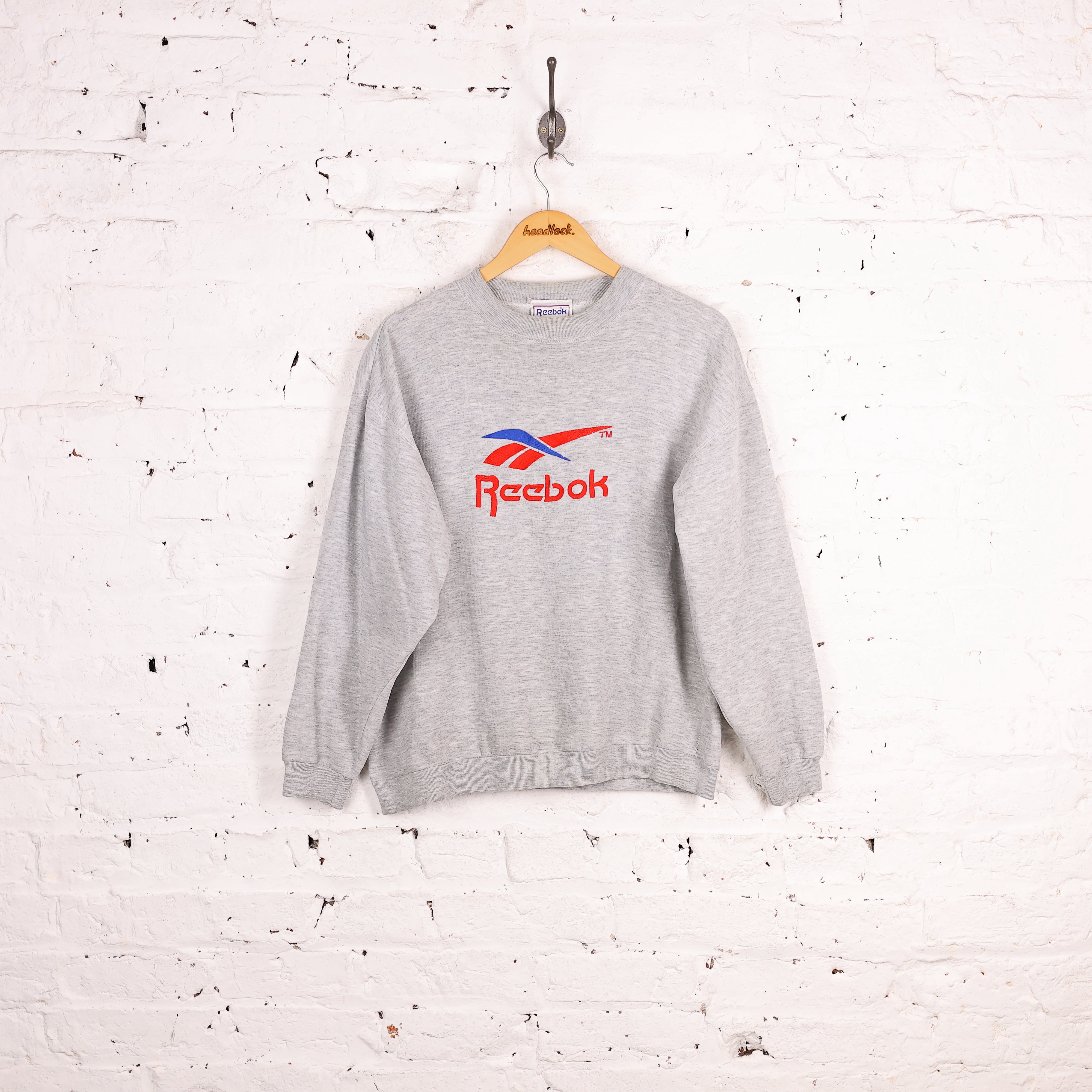 Good condition. Reebok 90s sweatshirt in grey with stitched red and blue logo on the chest.