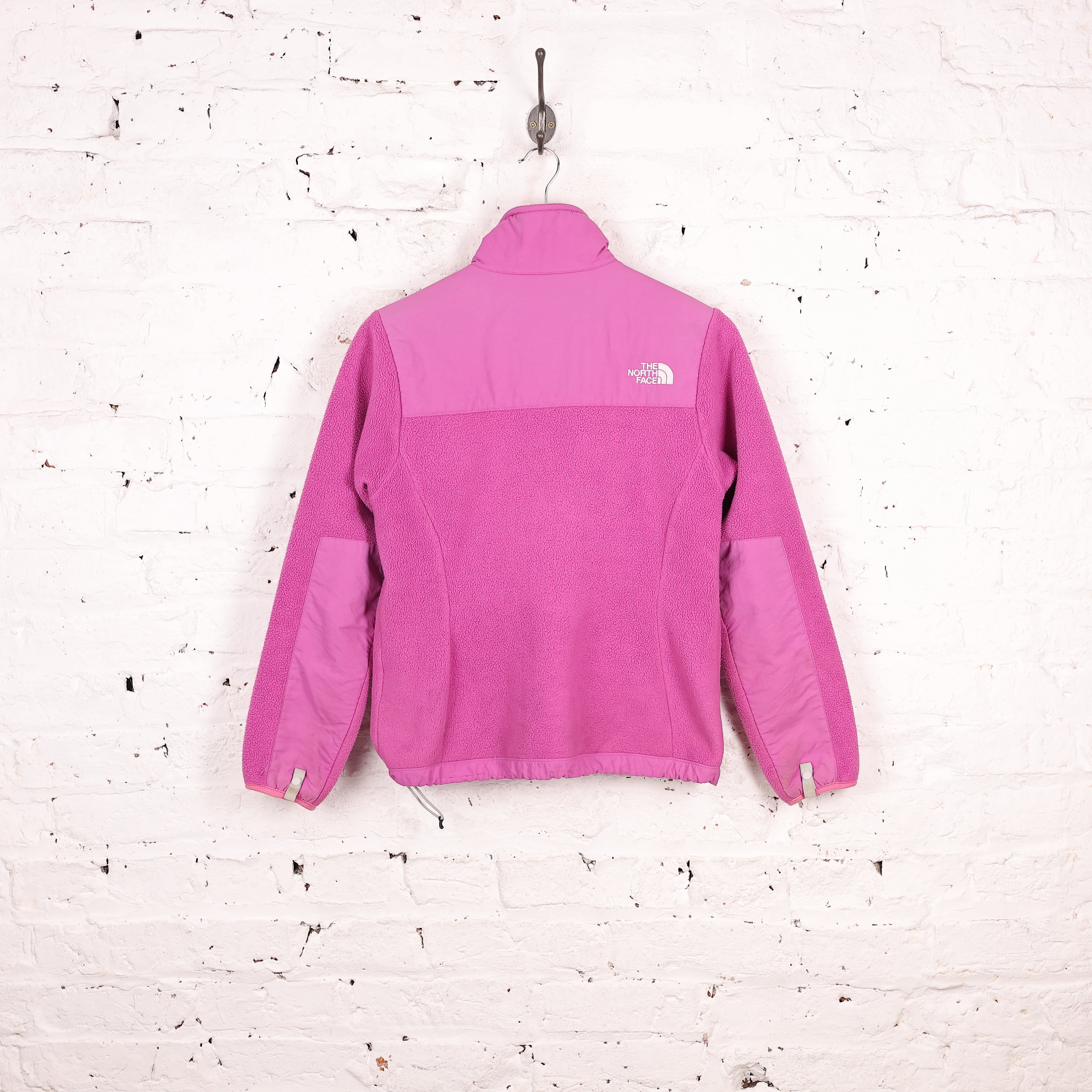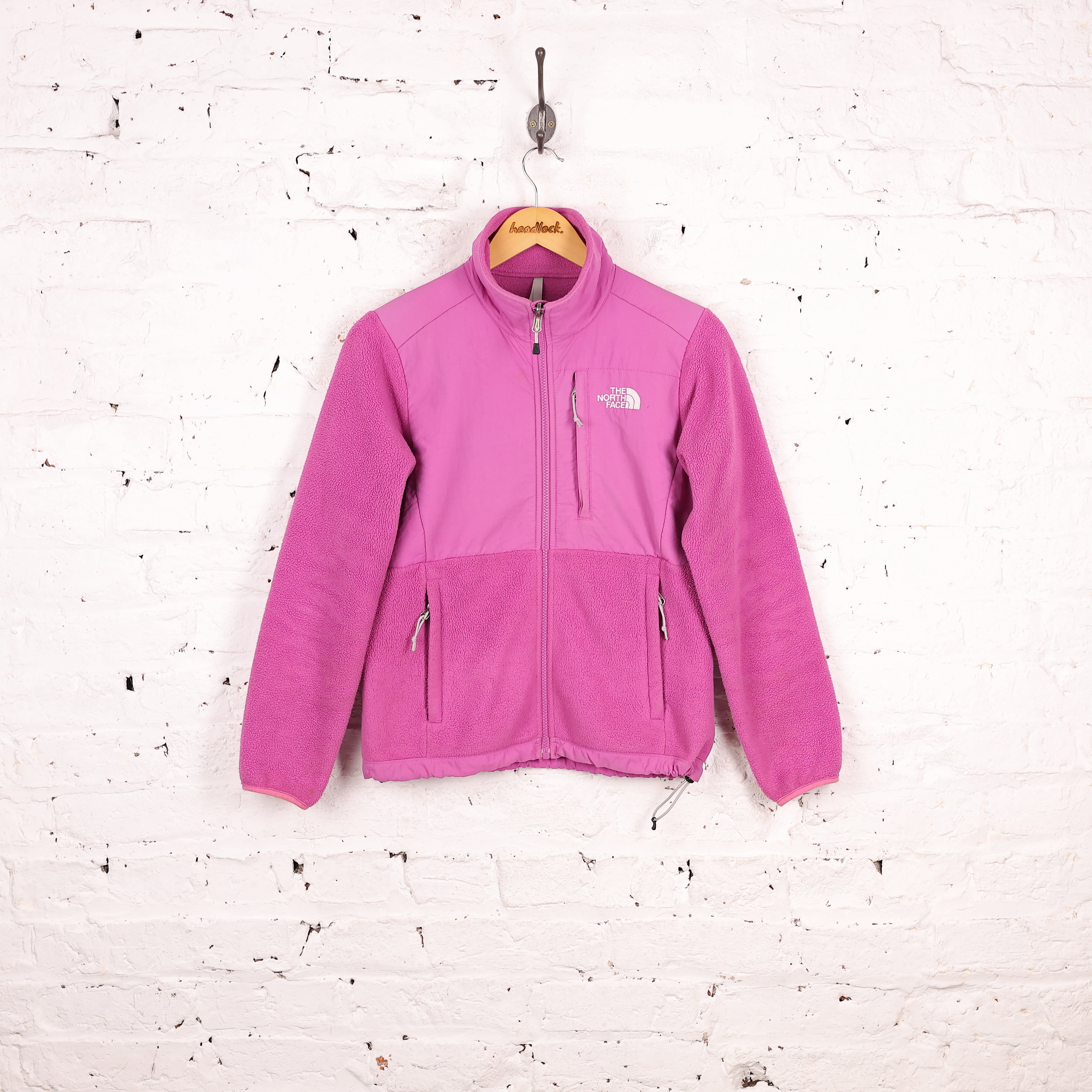 Good condition. The North Face Denali fleece in pink with zip pockets and stitched logo.