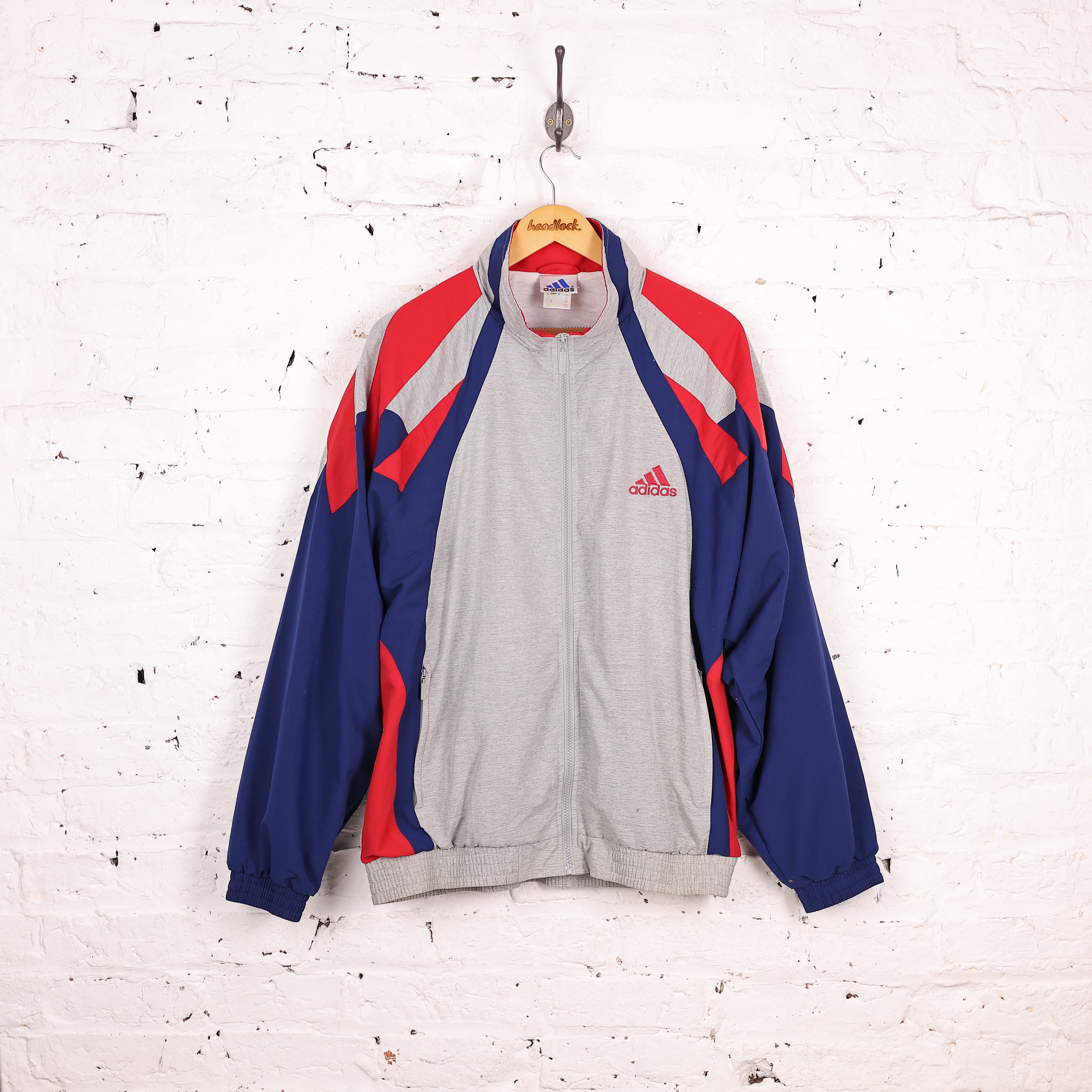 Good condition. Adidas 90s track top in grey, red and blue colours, stitched logo on the chest and with two zip pockets