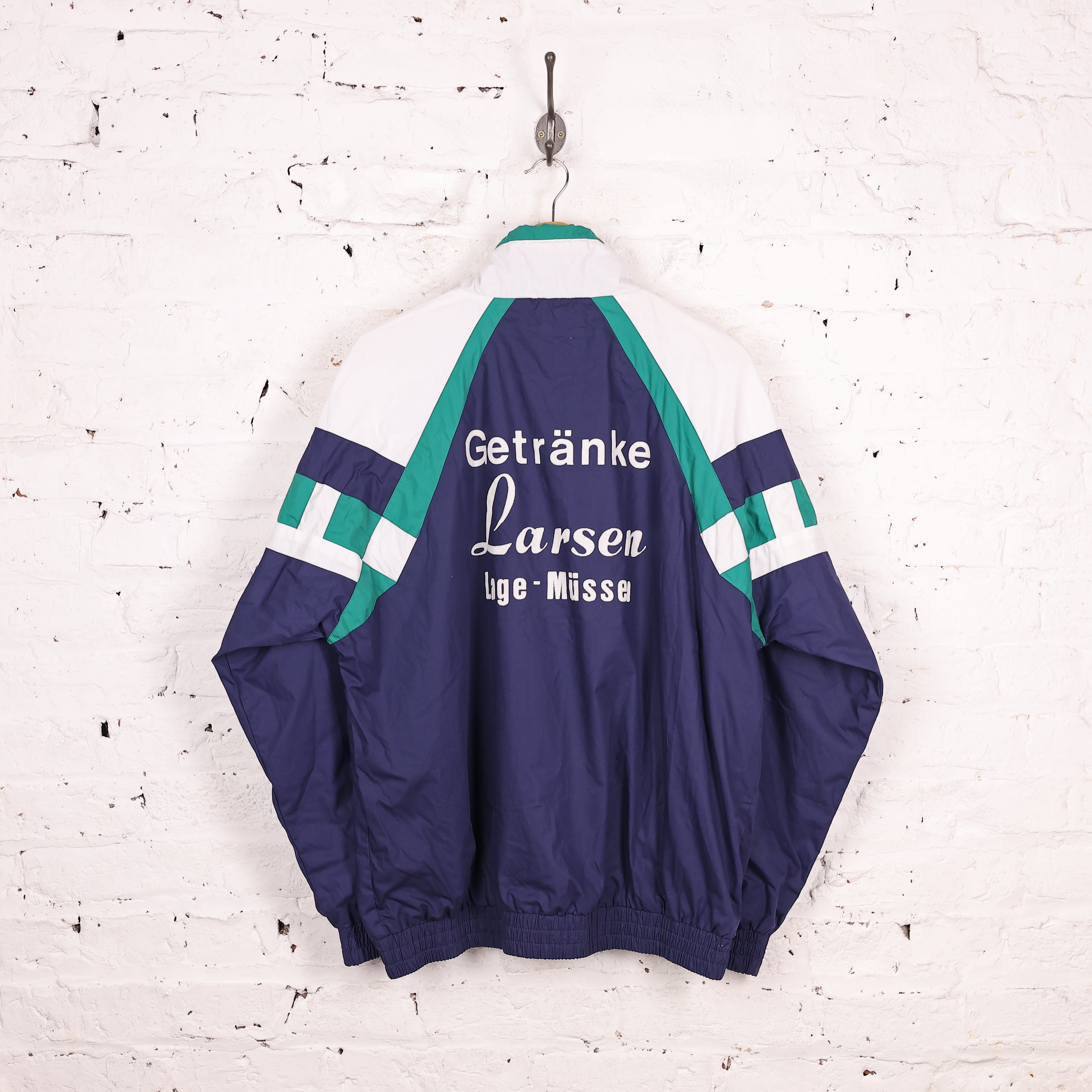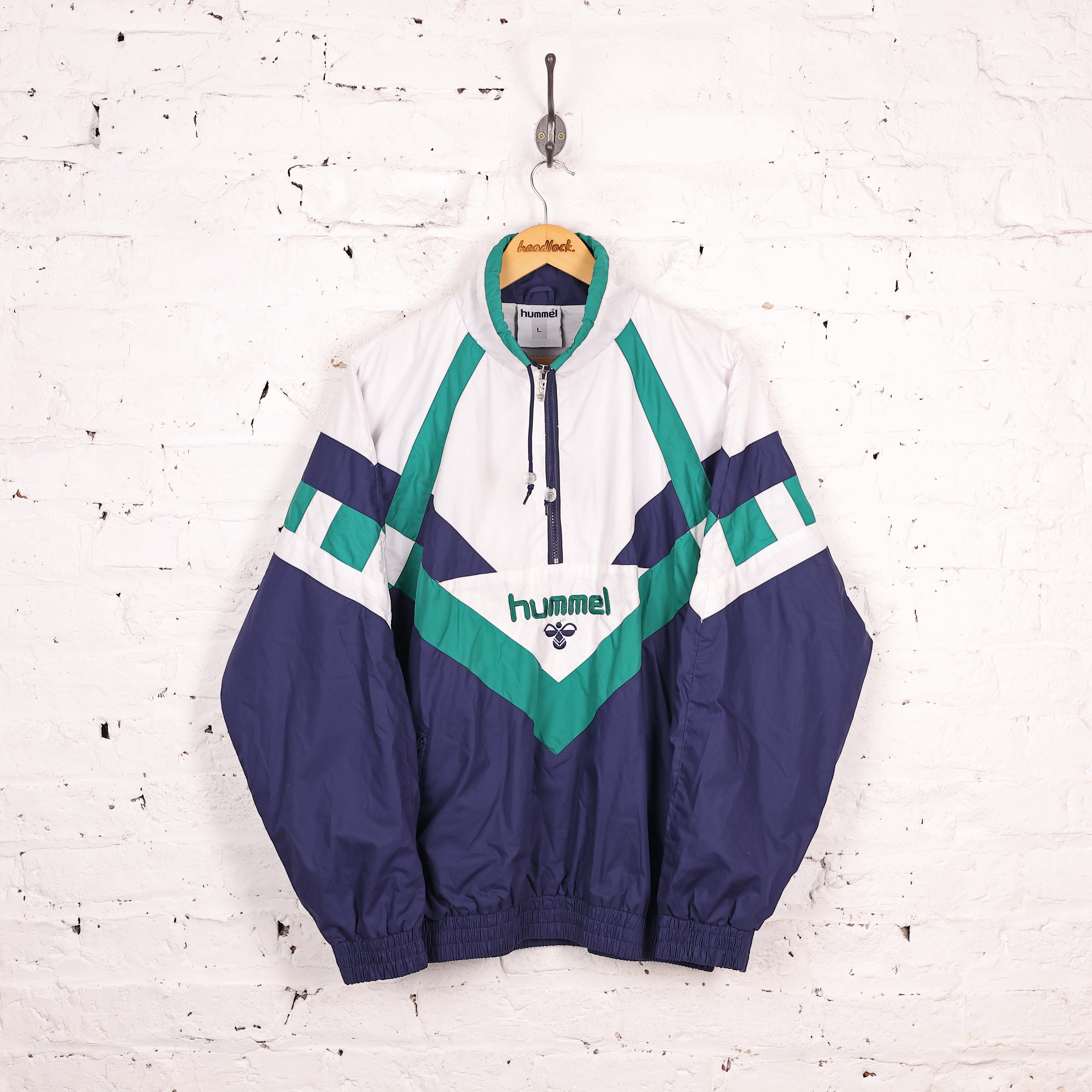 Good condition. Hummel 1/4 zip tracksuit top jacket in blue, white and green colours, zip pockets and stitched lettering on the chest.
