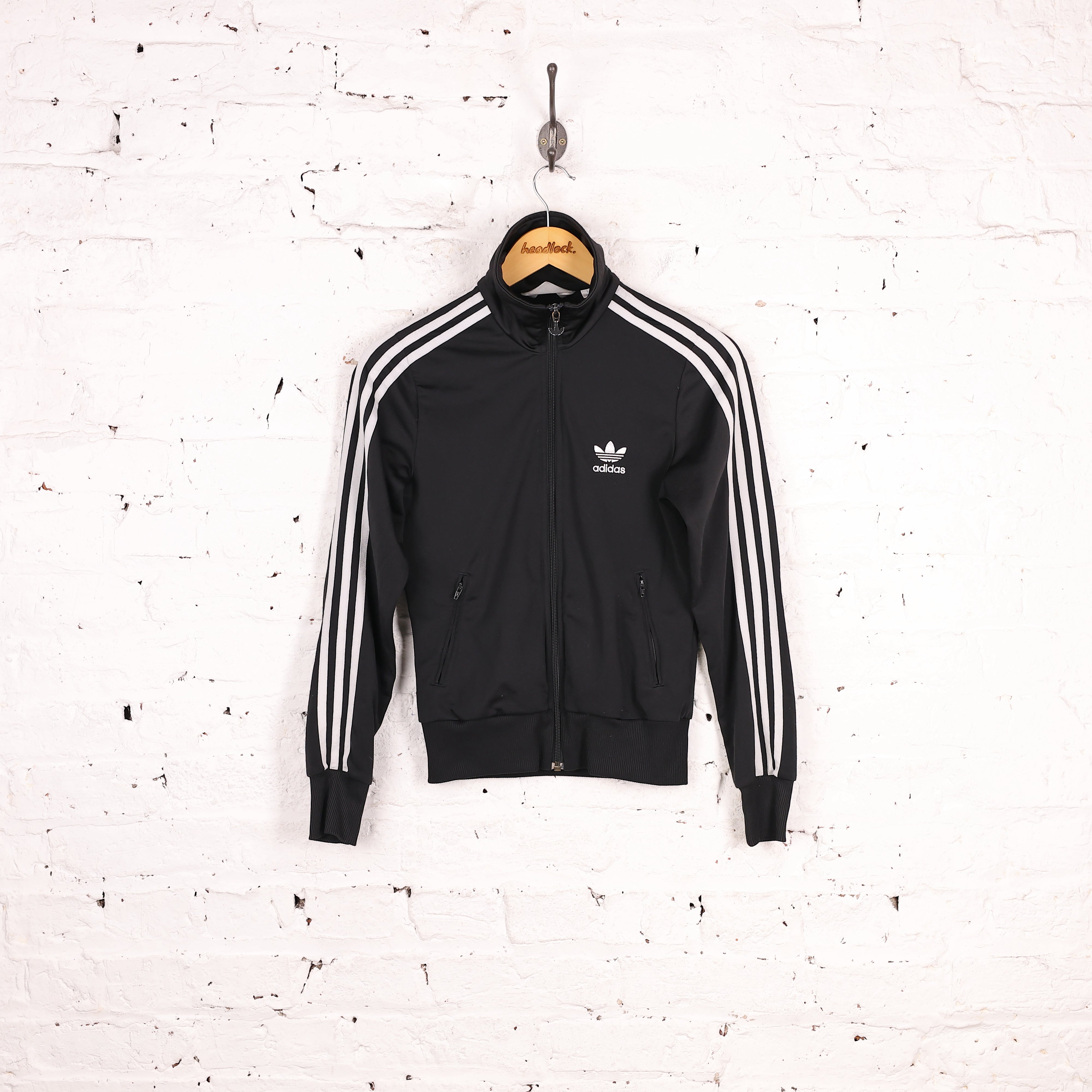 Good condition. Adidas tracksuit top in black with stitched trefoil on the chest, trefoil on the back, two pockets and three stripe down the arm.