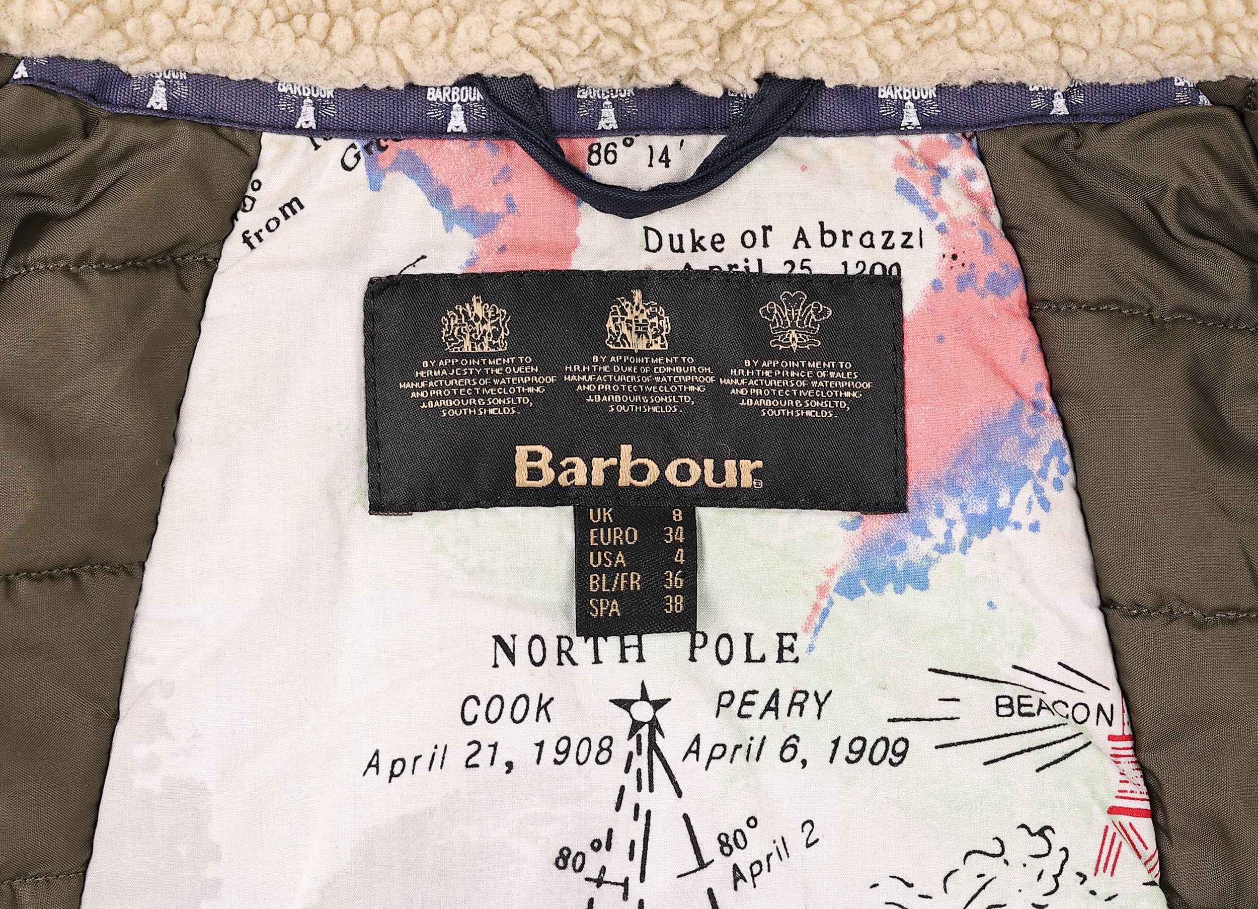 Good condition, small wear. Barbour Apsley parka jacket with map pattern inner lining, fleece lined hood, zip fasten and two outer pockets. UK Size 8