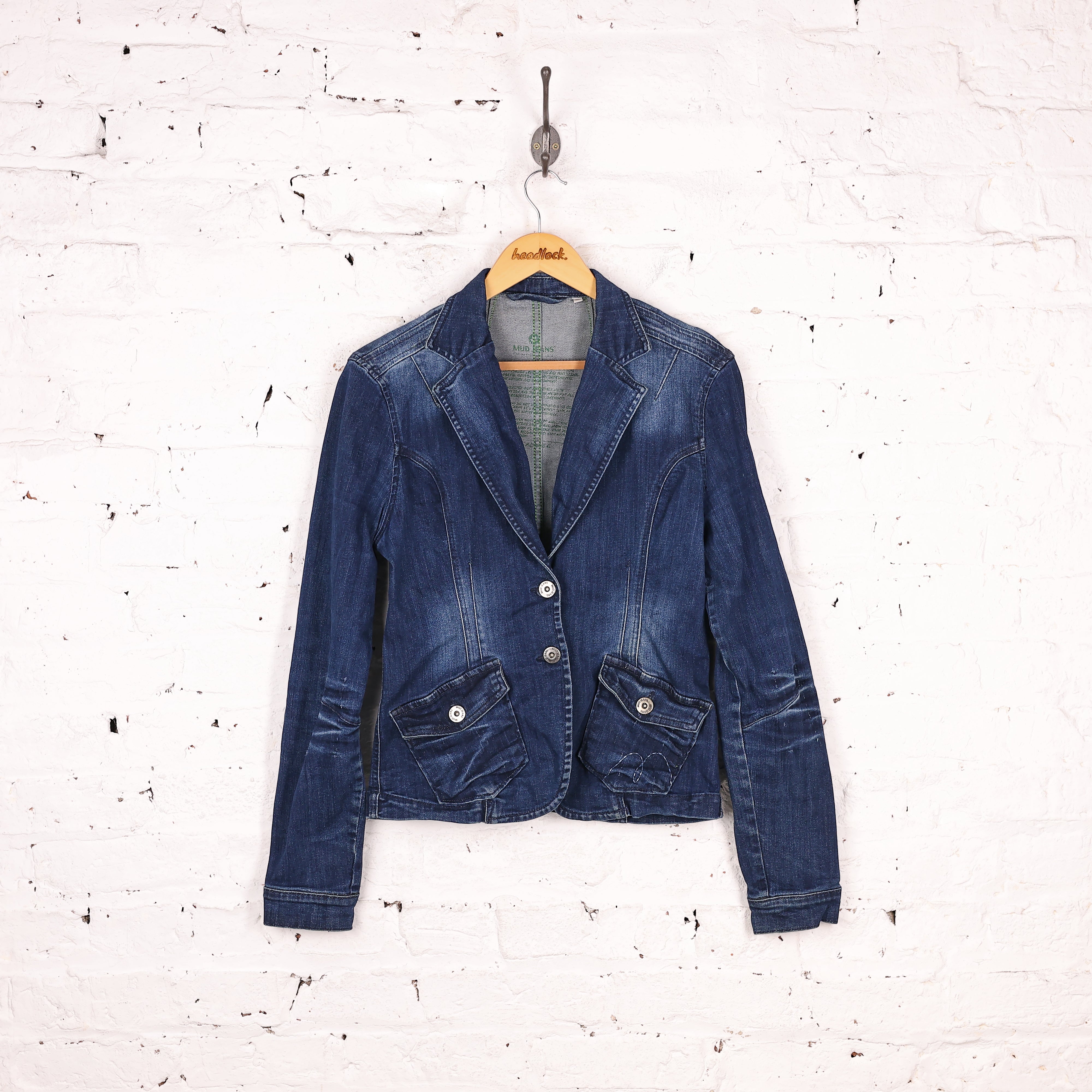 Good condition. Women's Y2K Blazer in dark blue denim, silver buttoning and two pockets.