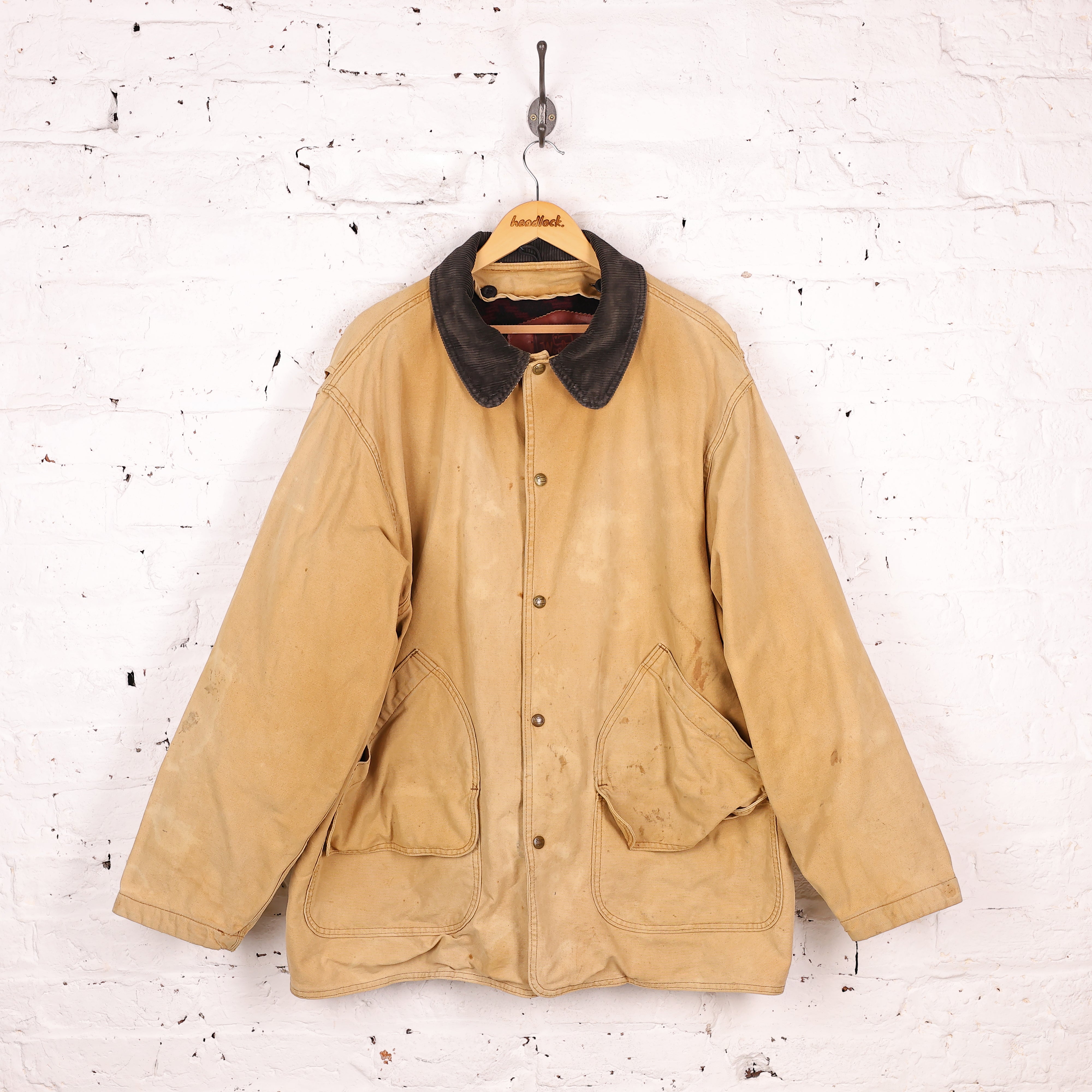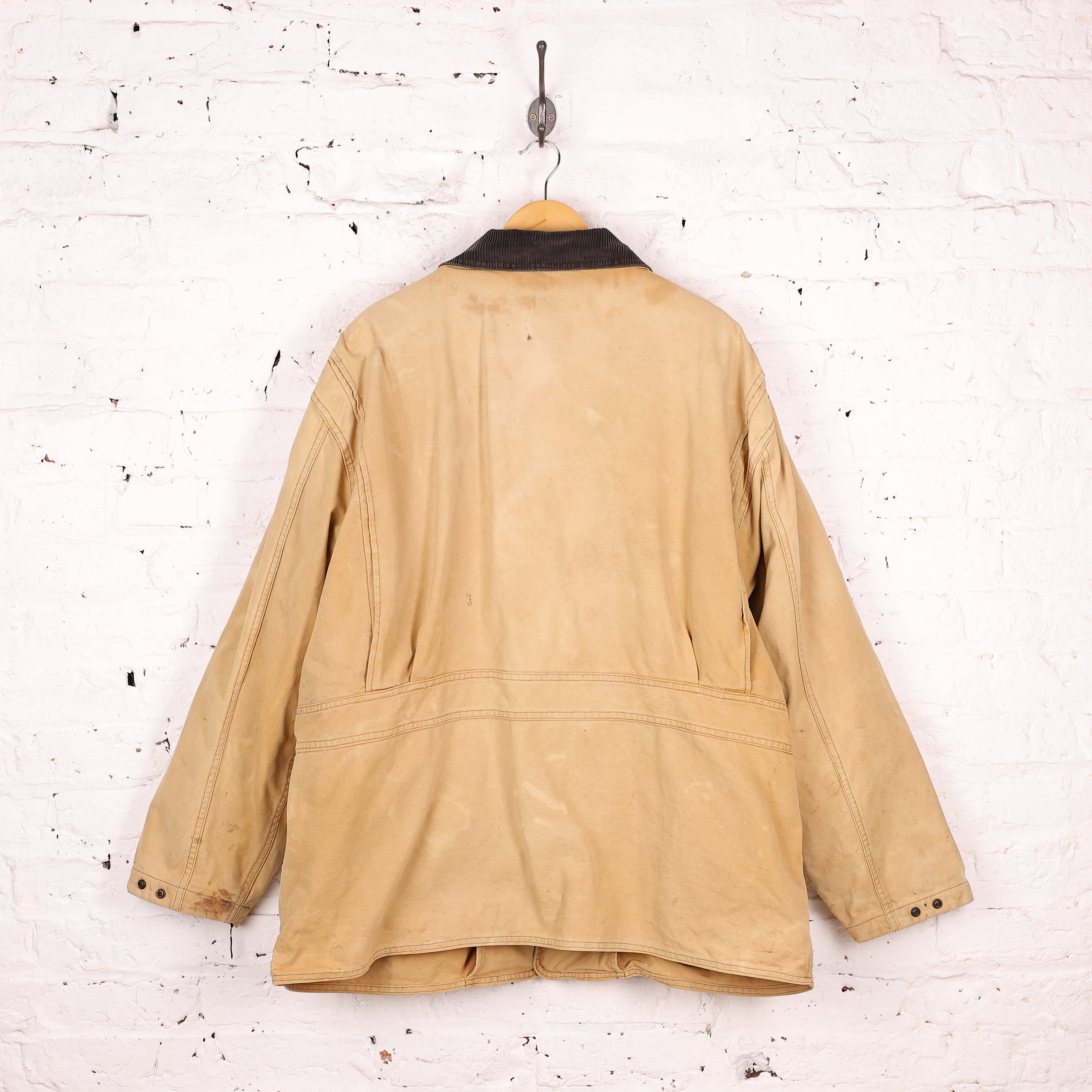 Fair condition, Marked outer fabric. Woolrich chore jacket in sand with stripe fleece lining, cord collar and popper detailed buttoning.