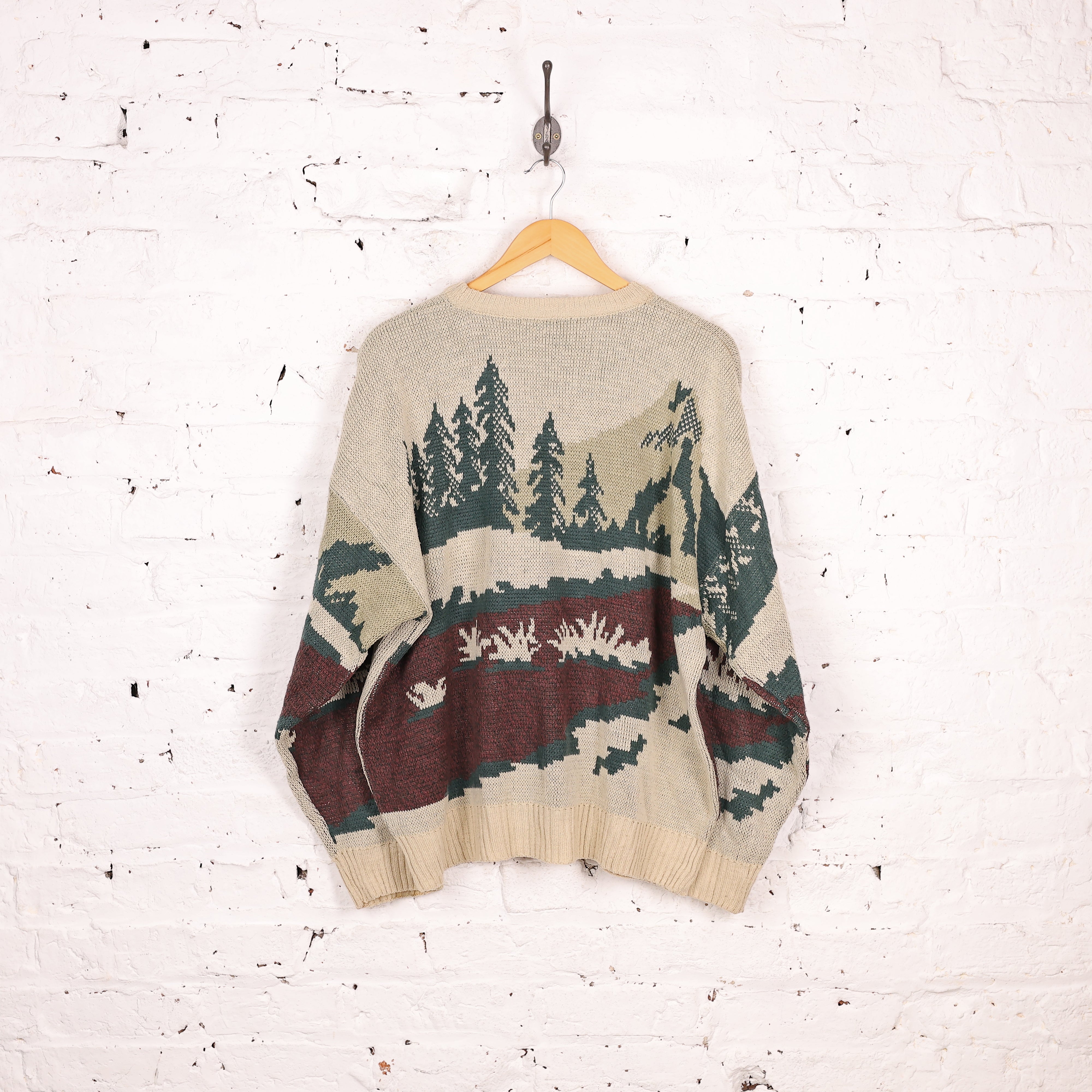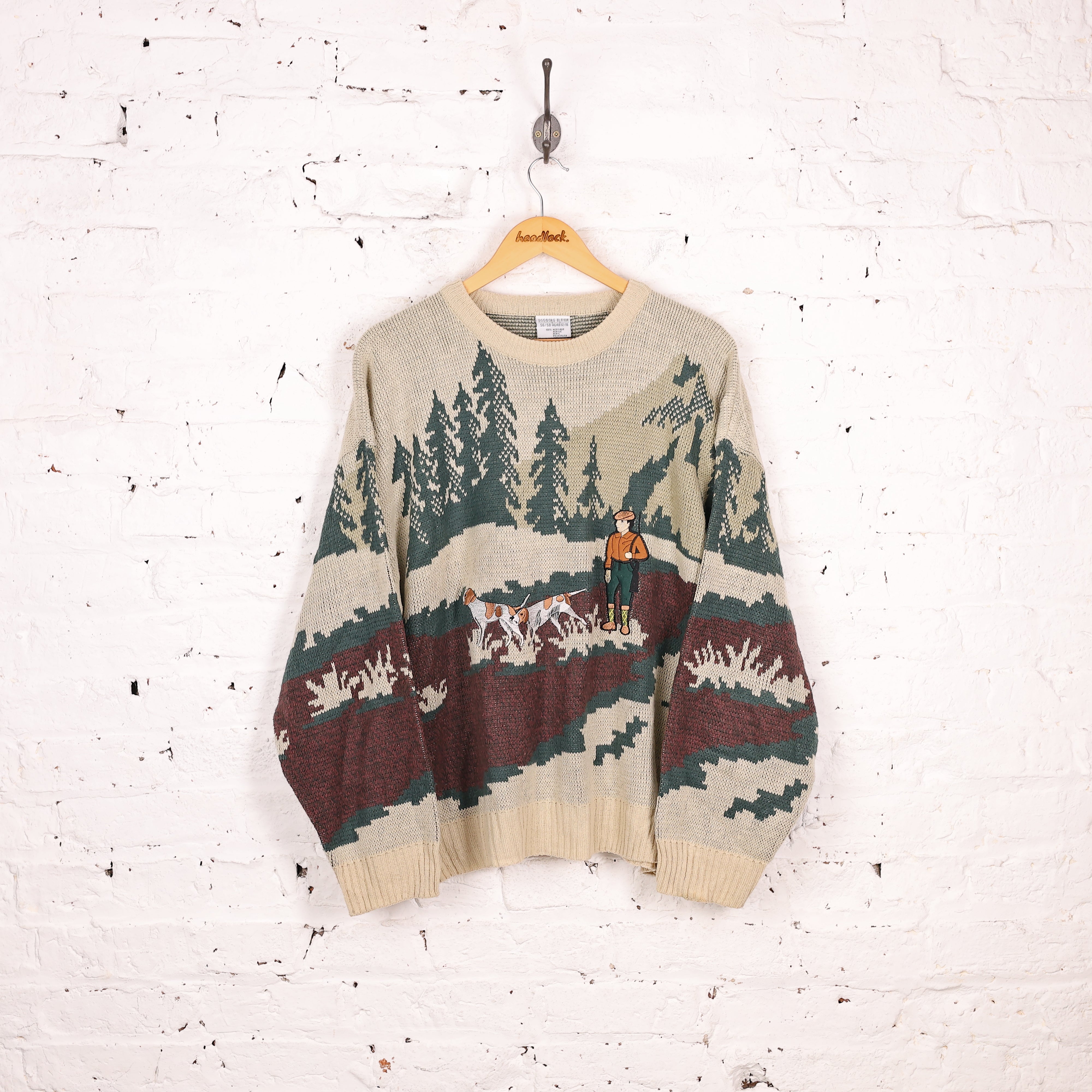 90s Hunting Dogs Pattern Picture Knit Jumper - Beige - XL