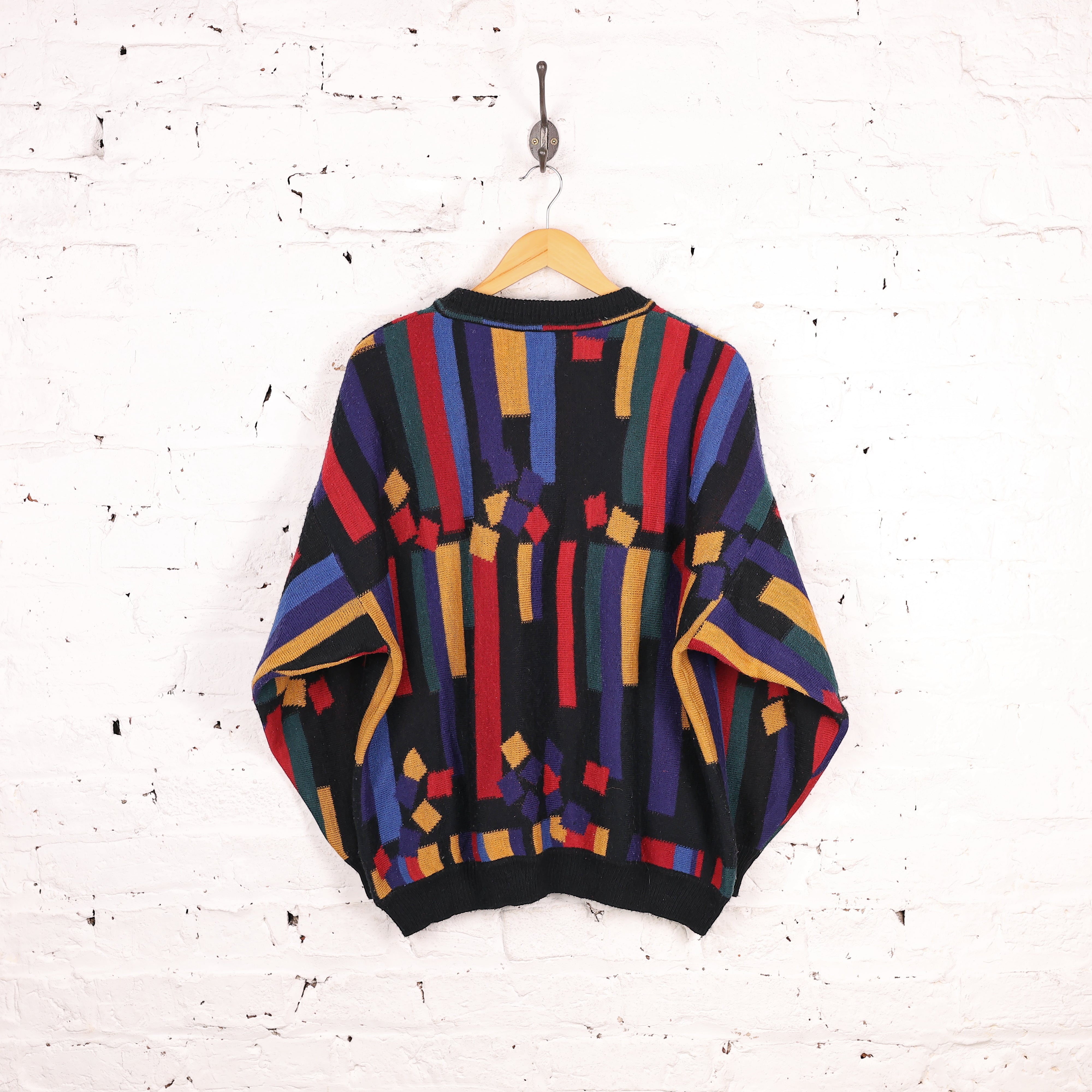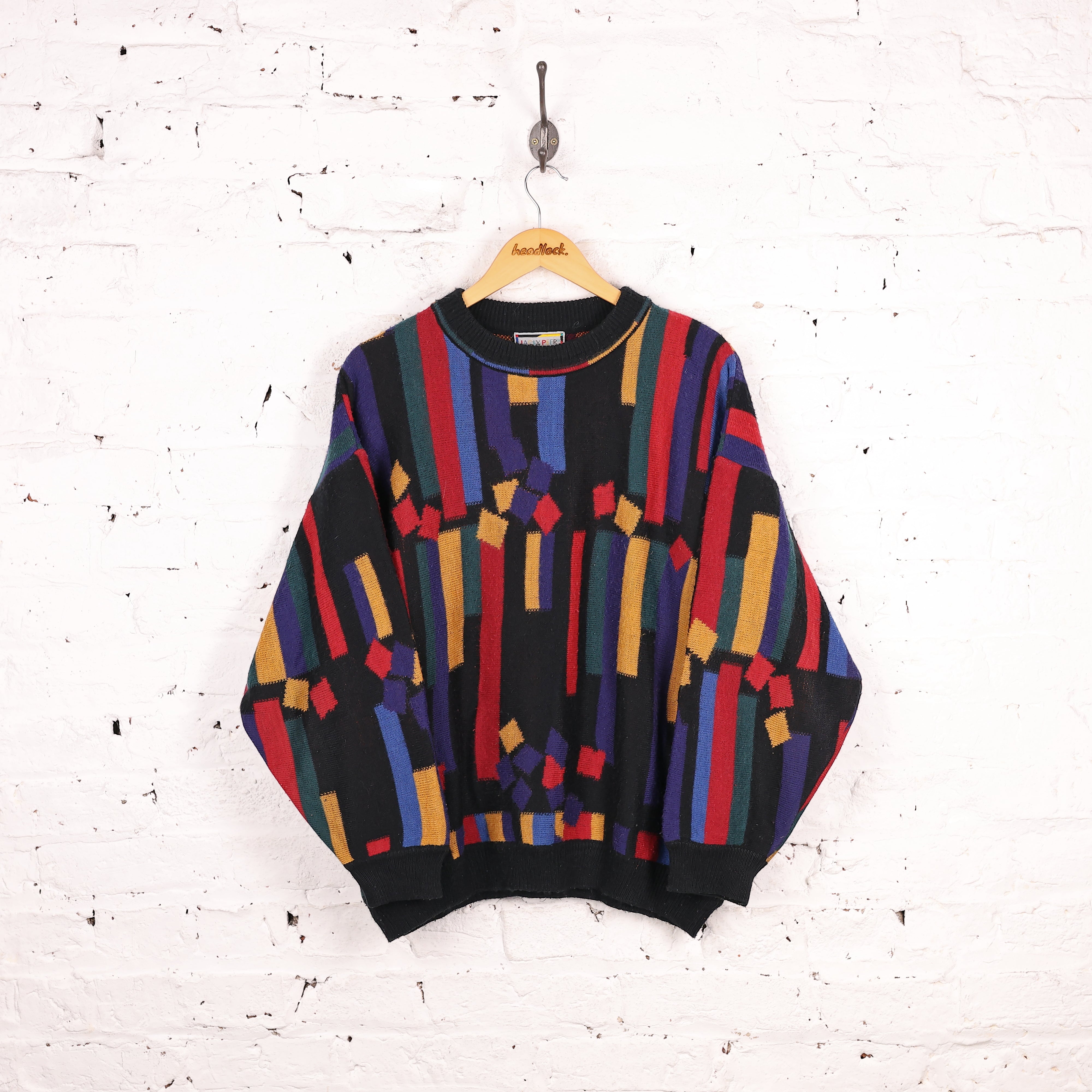 Good condition. 90s pattern knit jumper in black with rectangular multicolour pattern.
