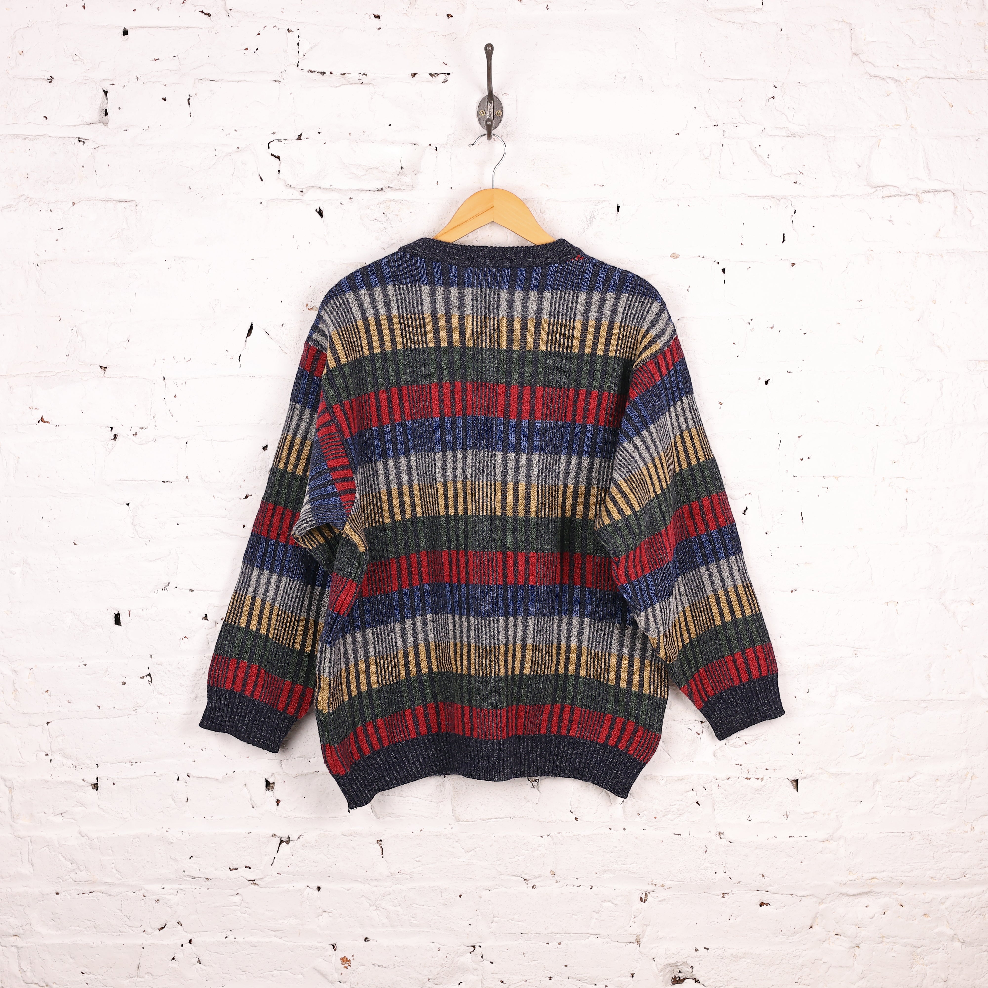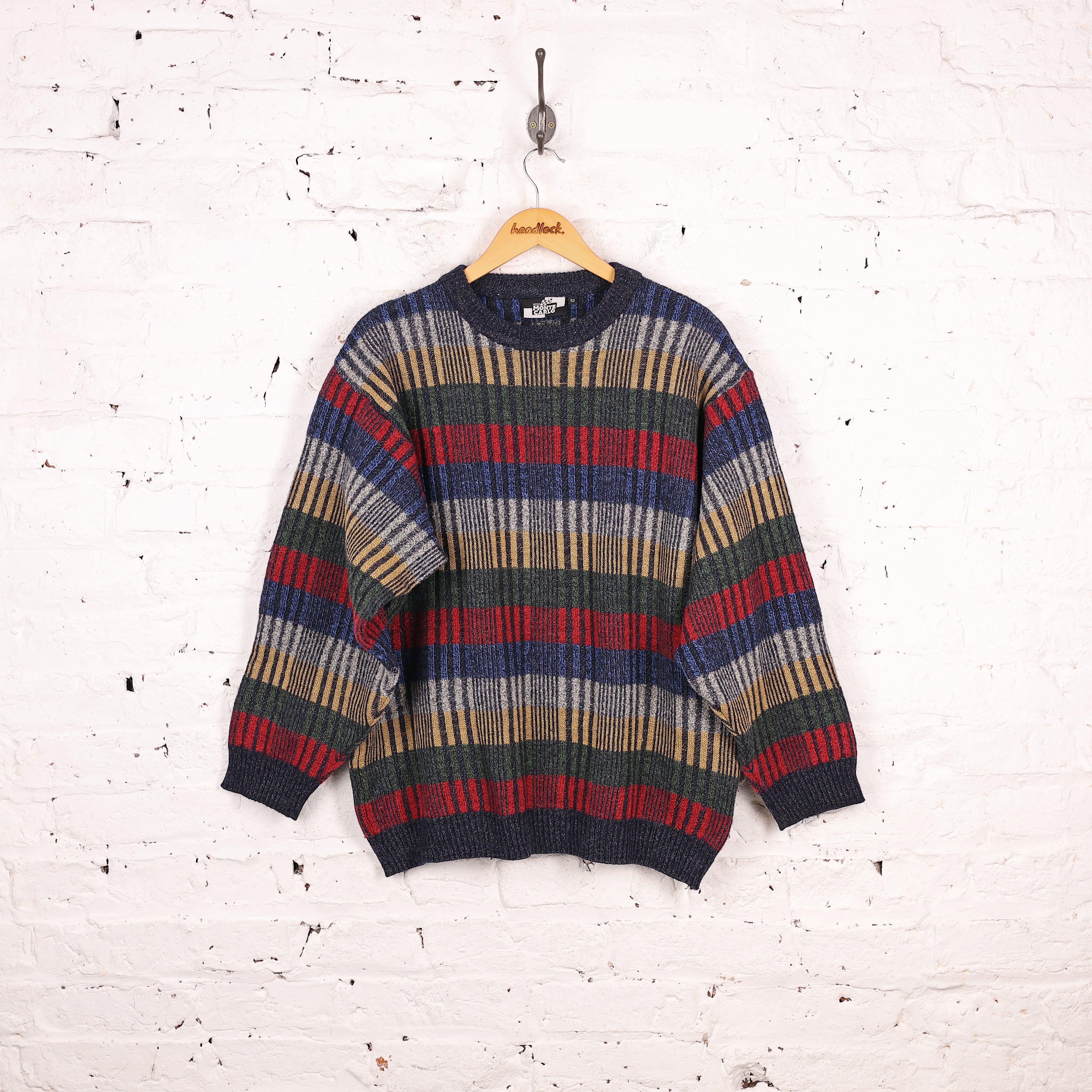 Good condition. Grey, red, blue and yellow striped pattern knit jumper in crew neck and loose fit.