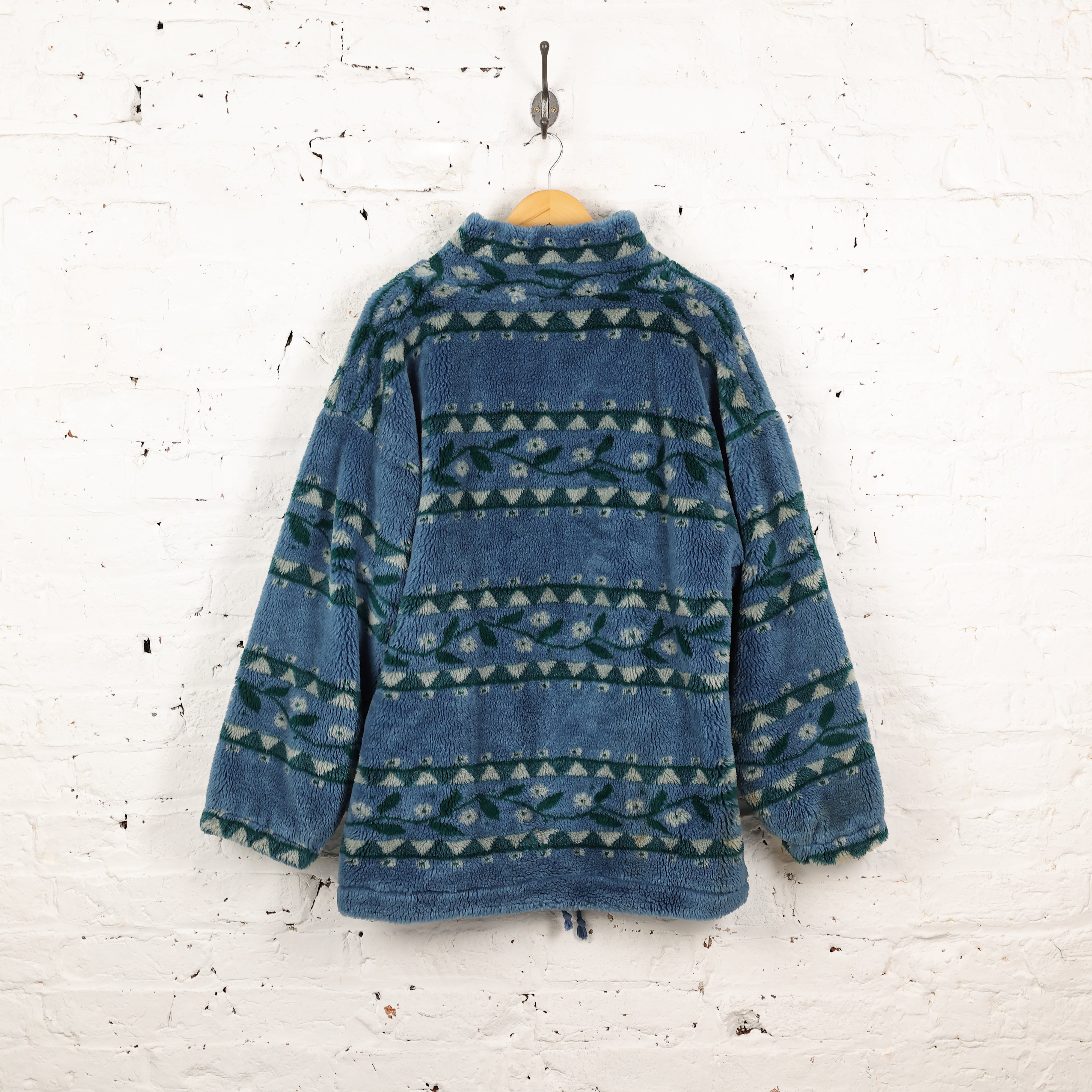 Good condition. 90s pattern fleece in blue and green colours and with two zip pockets. Thick pile fleece with inner lining.