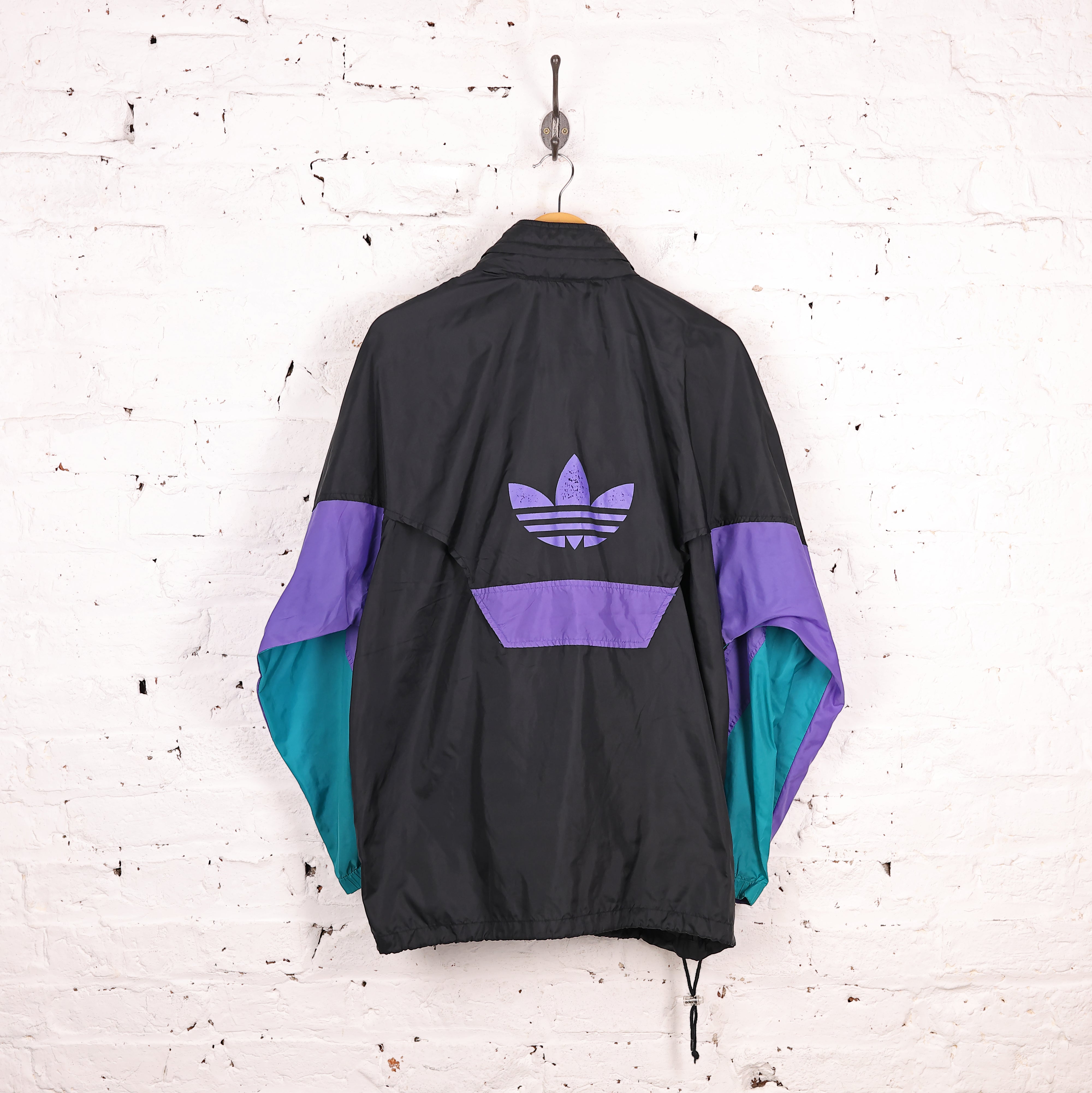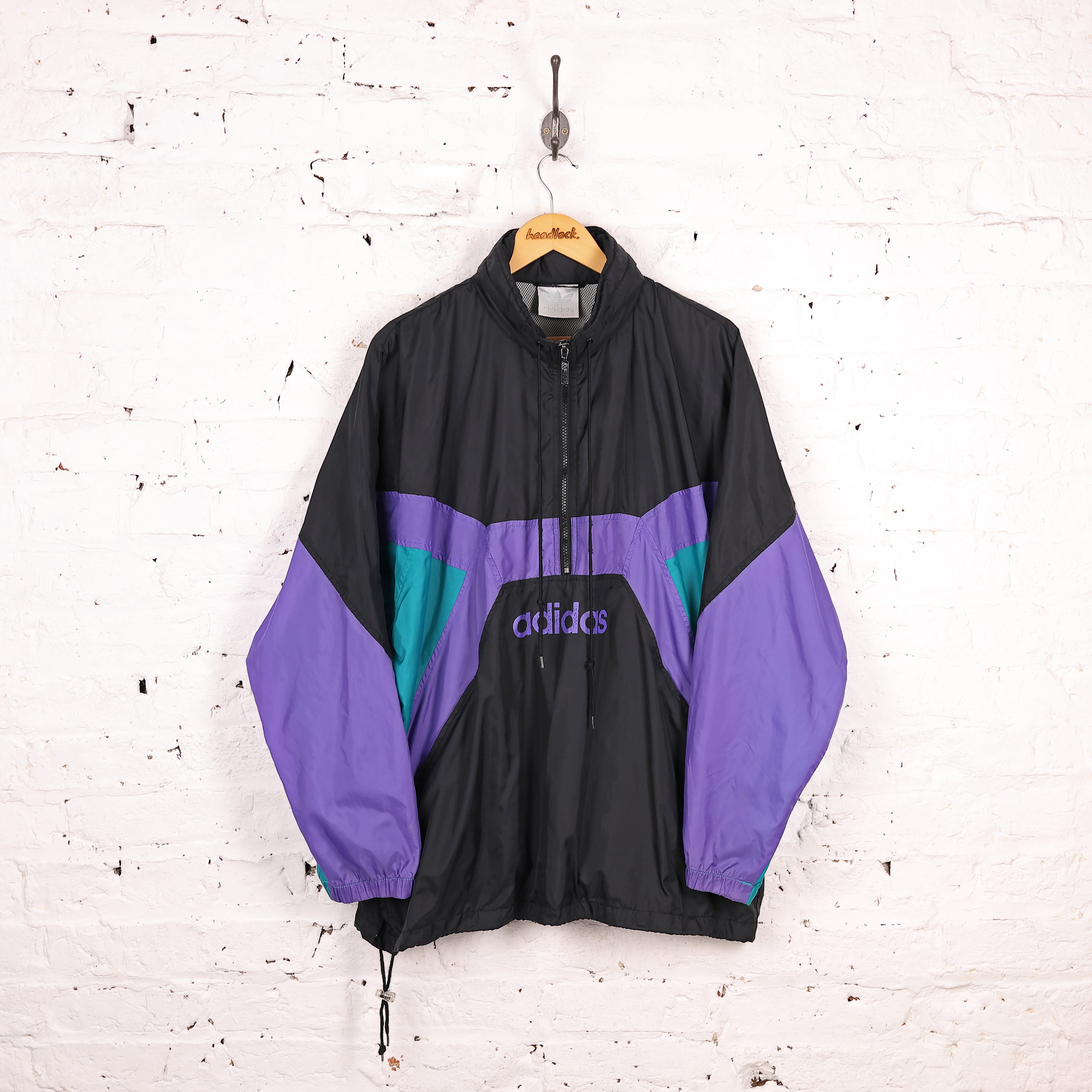Good condition. Adidas shell tracksuit top in black, purple and green with drawstring collar and two zip pockets.