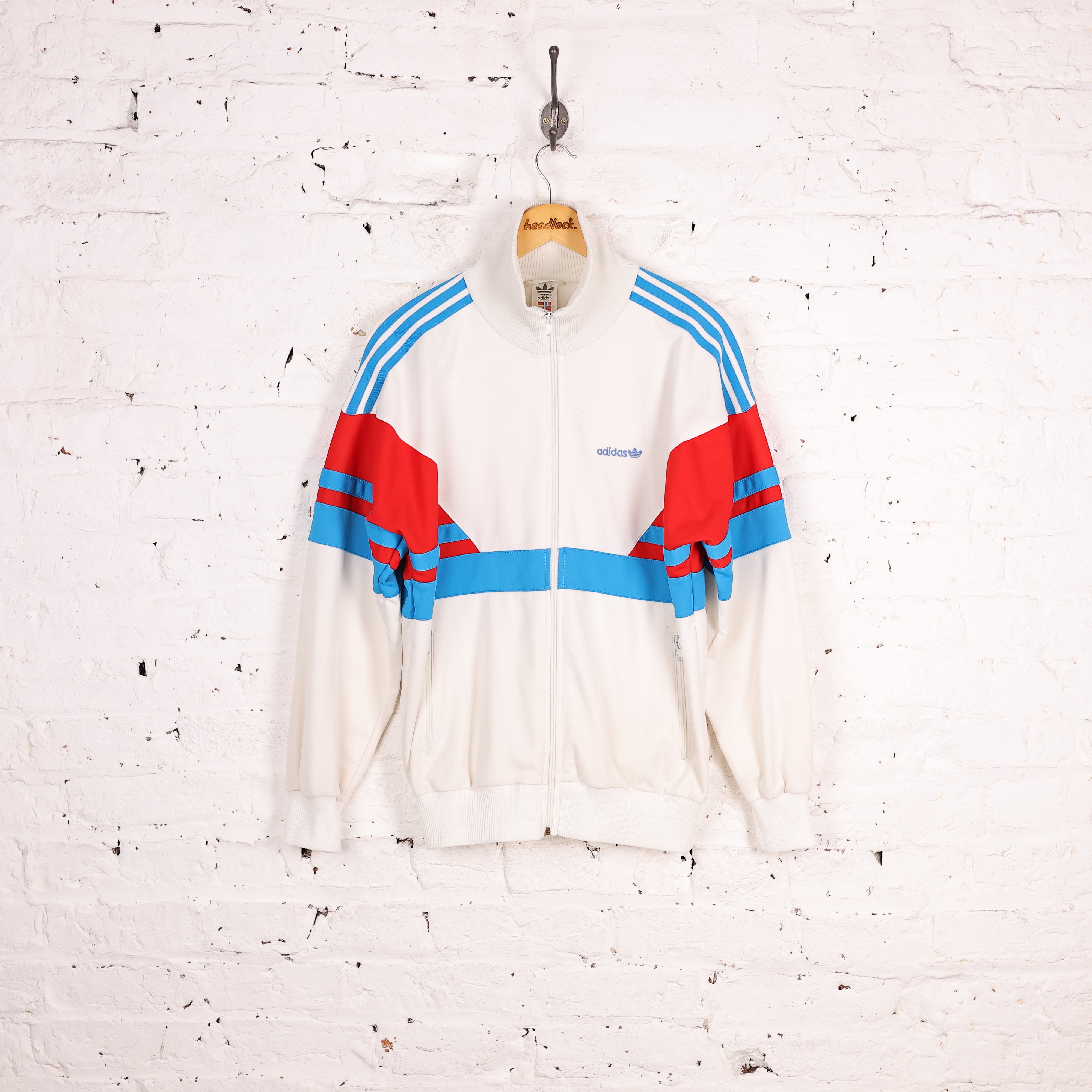 Good condition. Adidas tracksuit top in white, blue and red colours, made in West Germany with stitched logo and zip pockets.