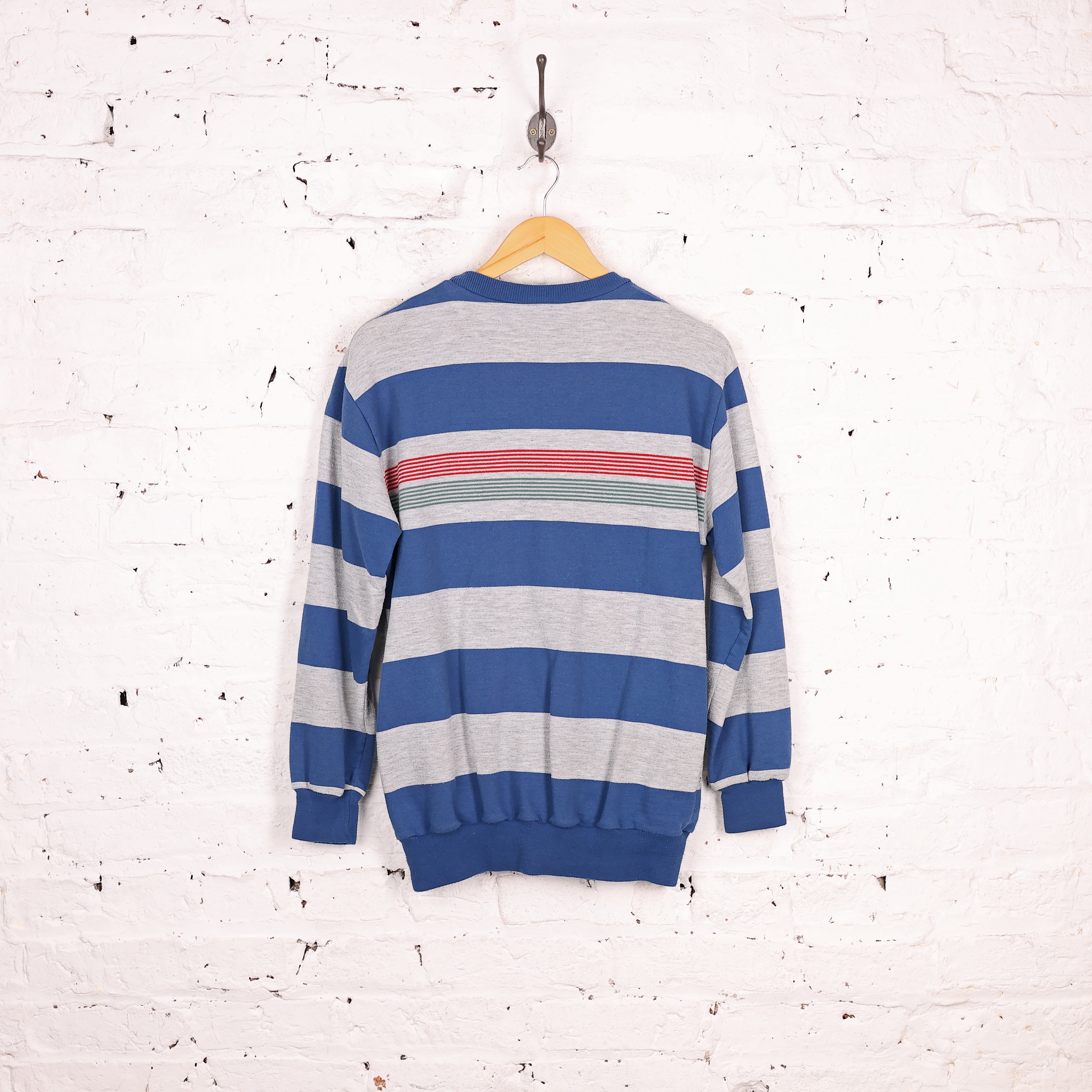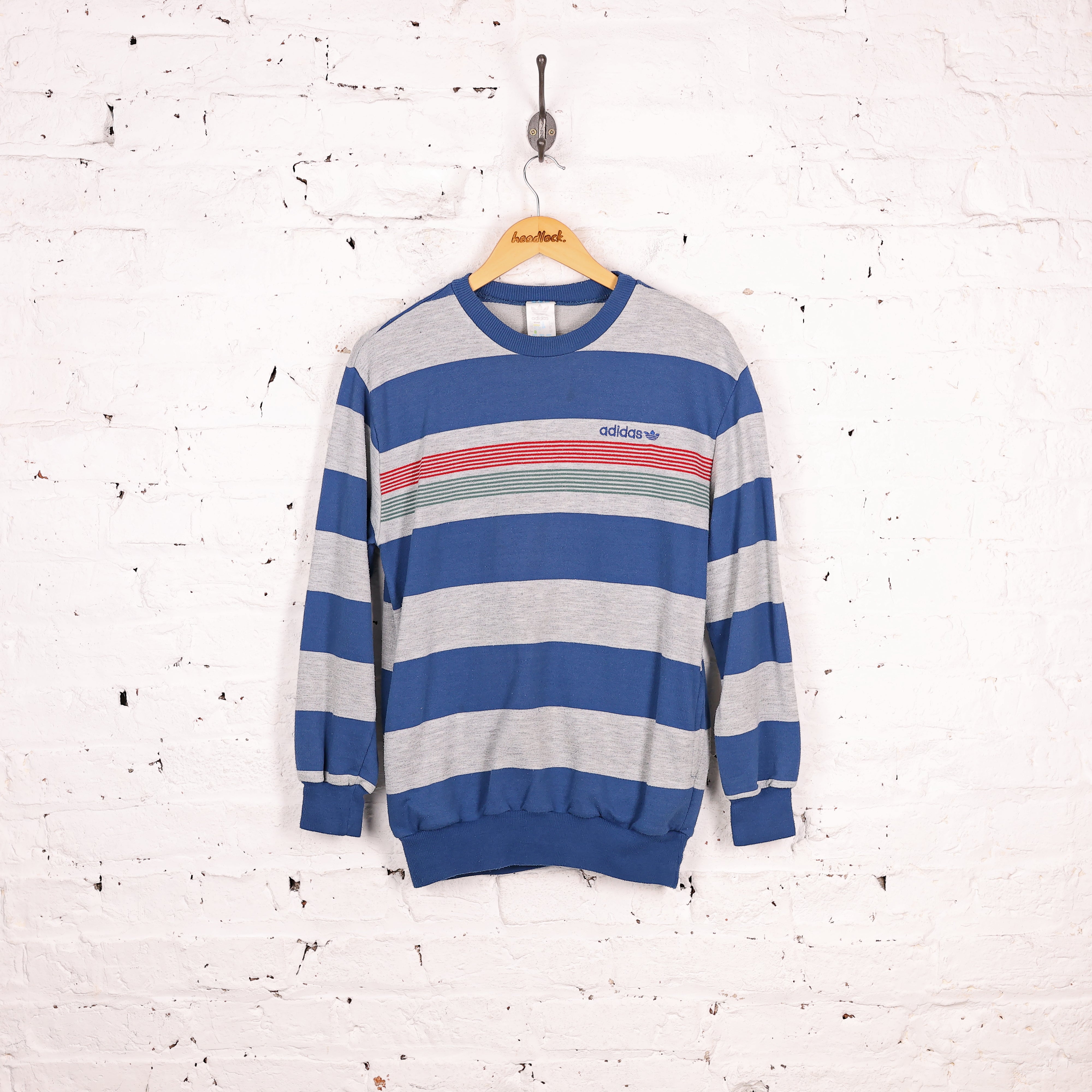 Good condition, bobbled fabric. Adidas 90s sweatshirt in blue and grey striped with stitched logo on the chest and with two side pockets.