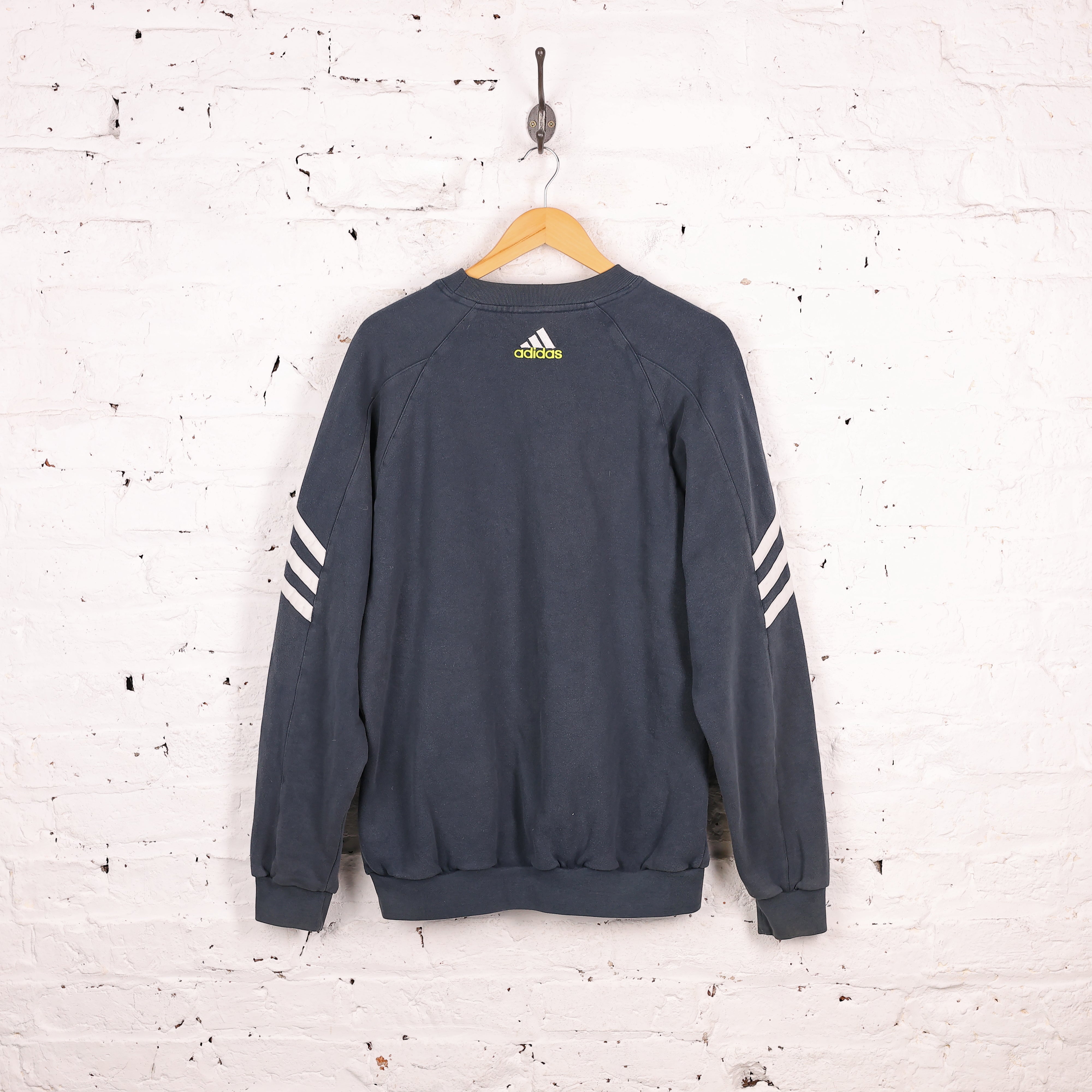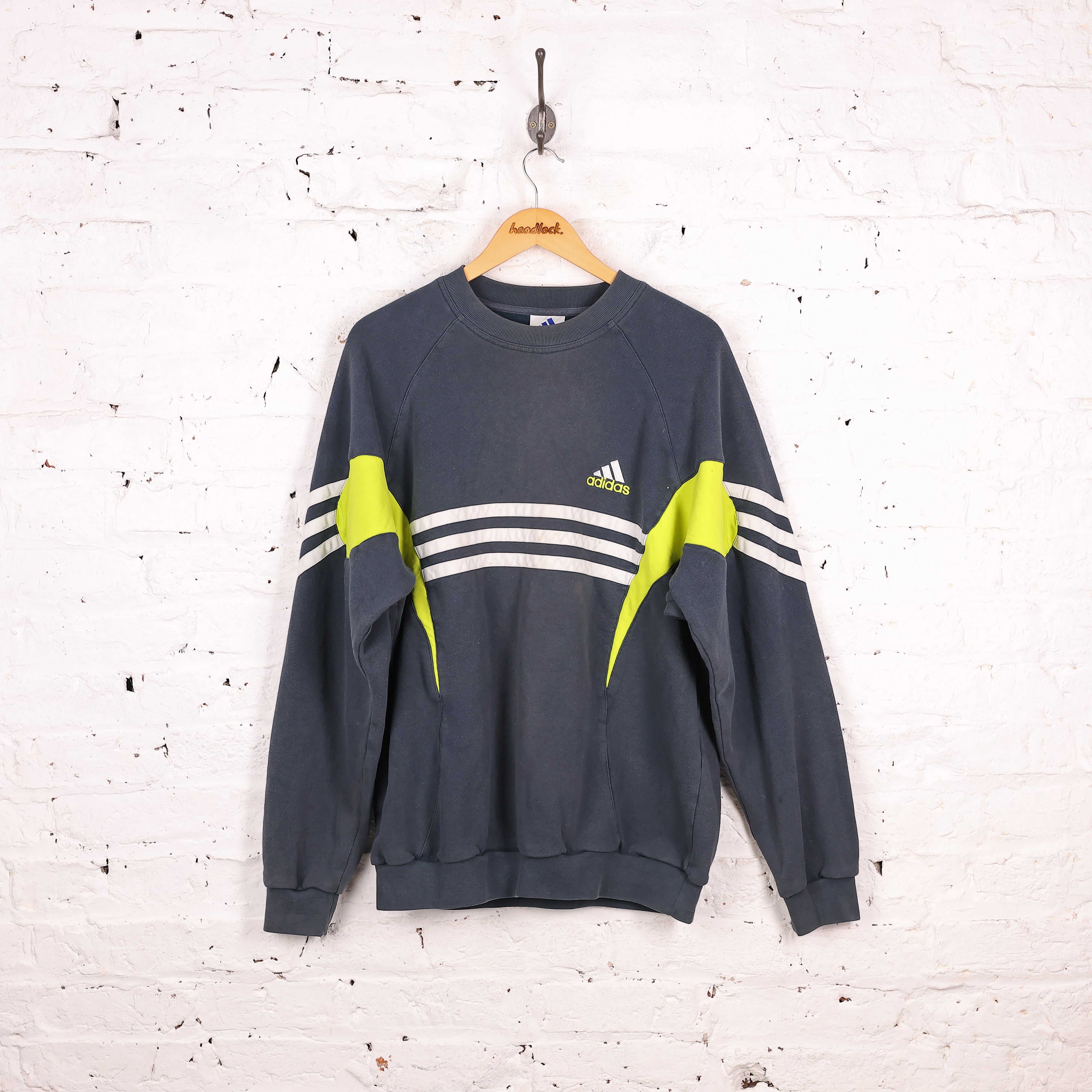 Good condition, slightly bobbled fabric. Adidas sweatshirt in green with stitched logo and three stripe across the chest, original 90s adidas