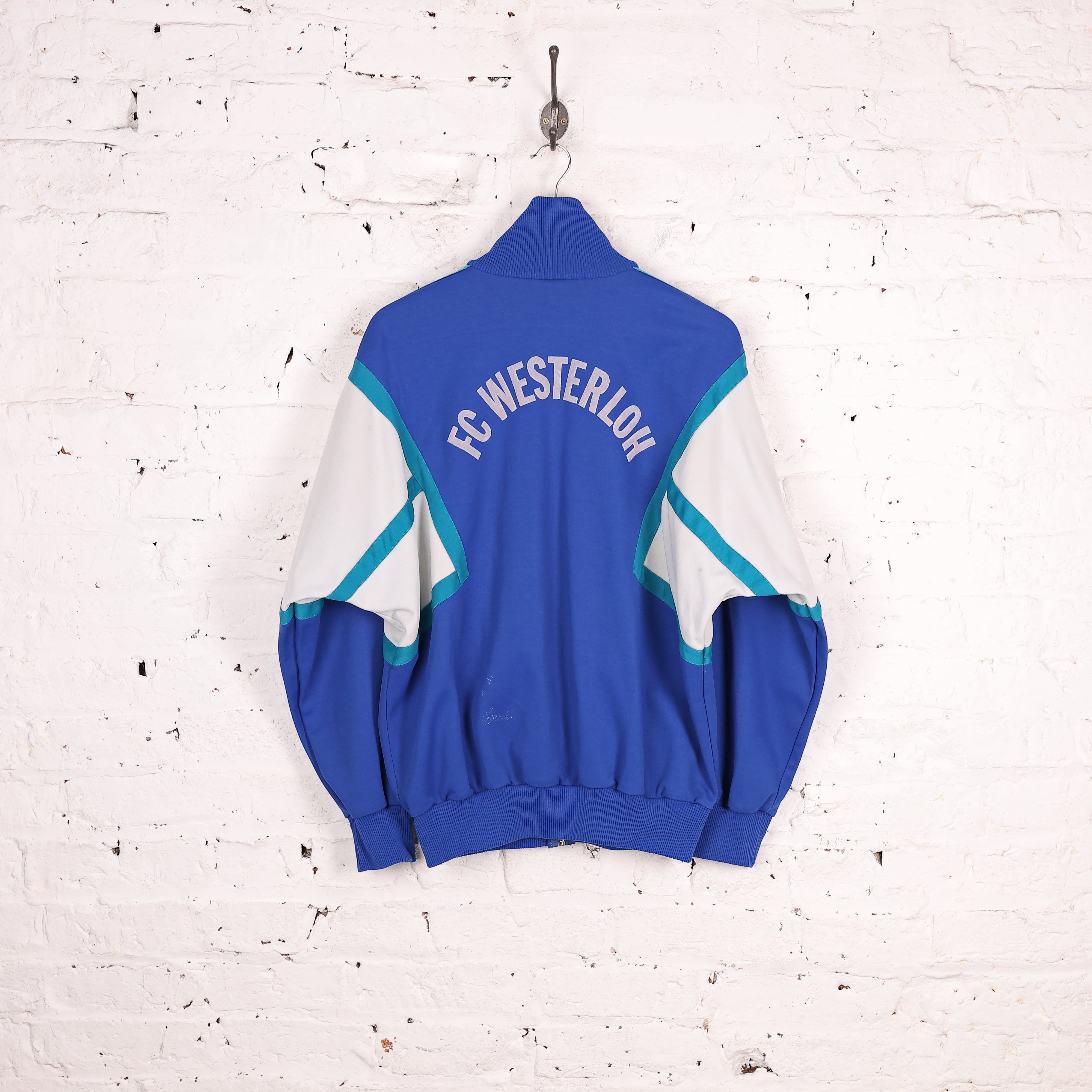 Good condition, Early 90s Adidas tracksuit top in blue, green and white colours with stitched logo and zip pockets. F.C Westerloh felt lettering on the back.