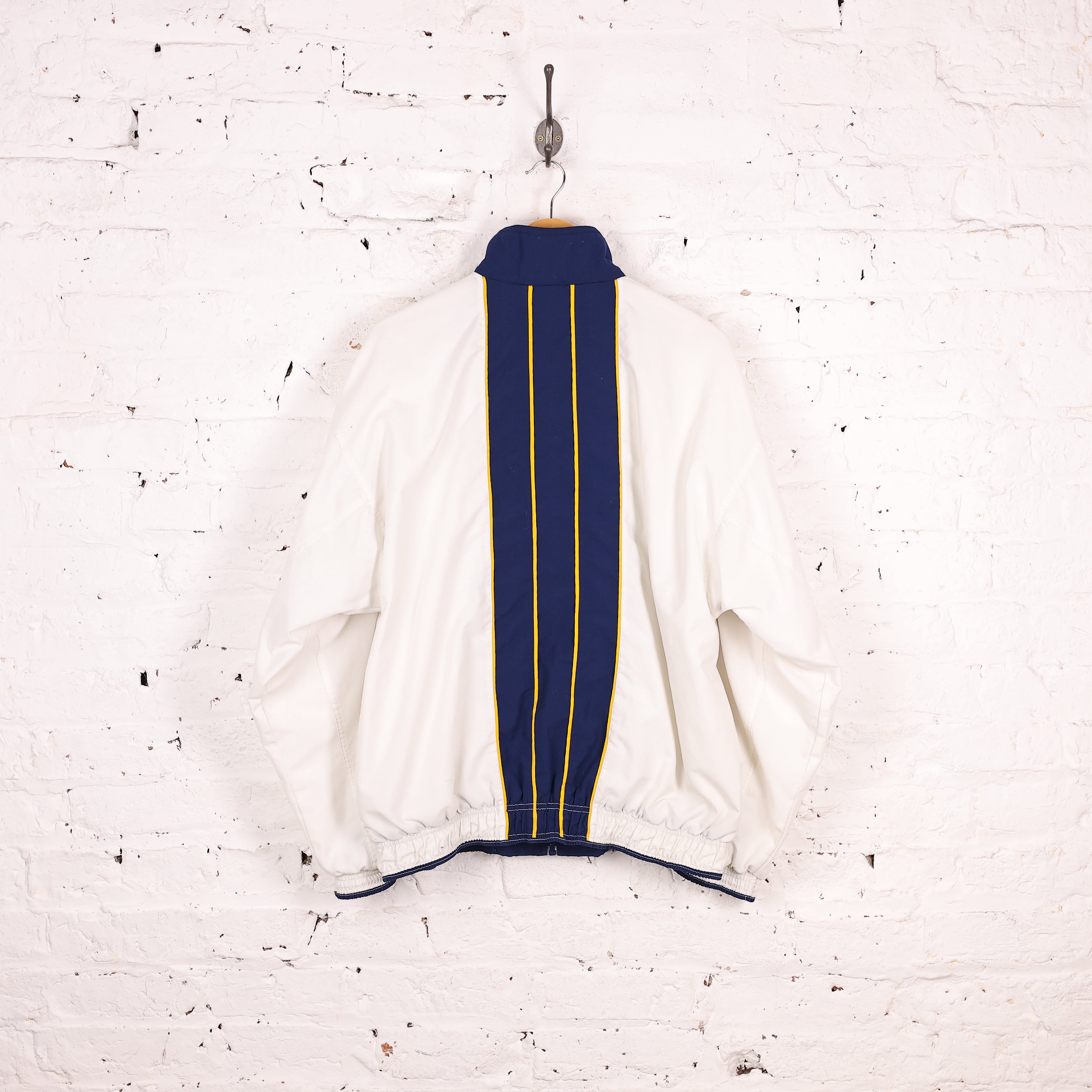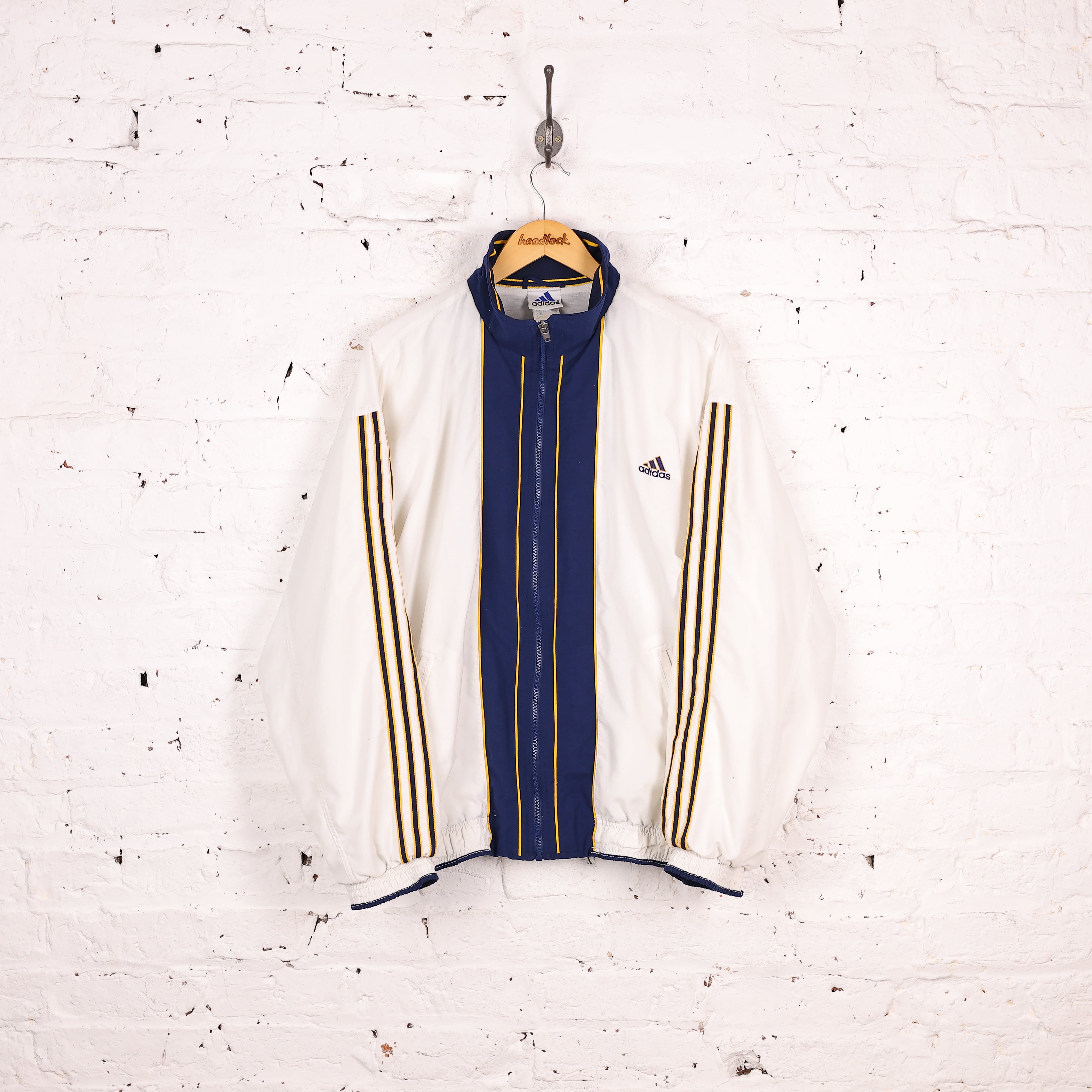 Good condition. Adidas 90s tracksuit top in white, blue and yellow colours. Stitched logo on the front with two pockets.