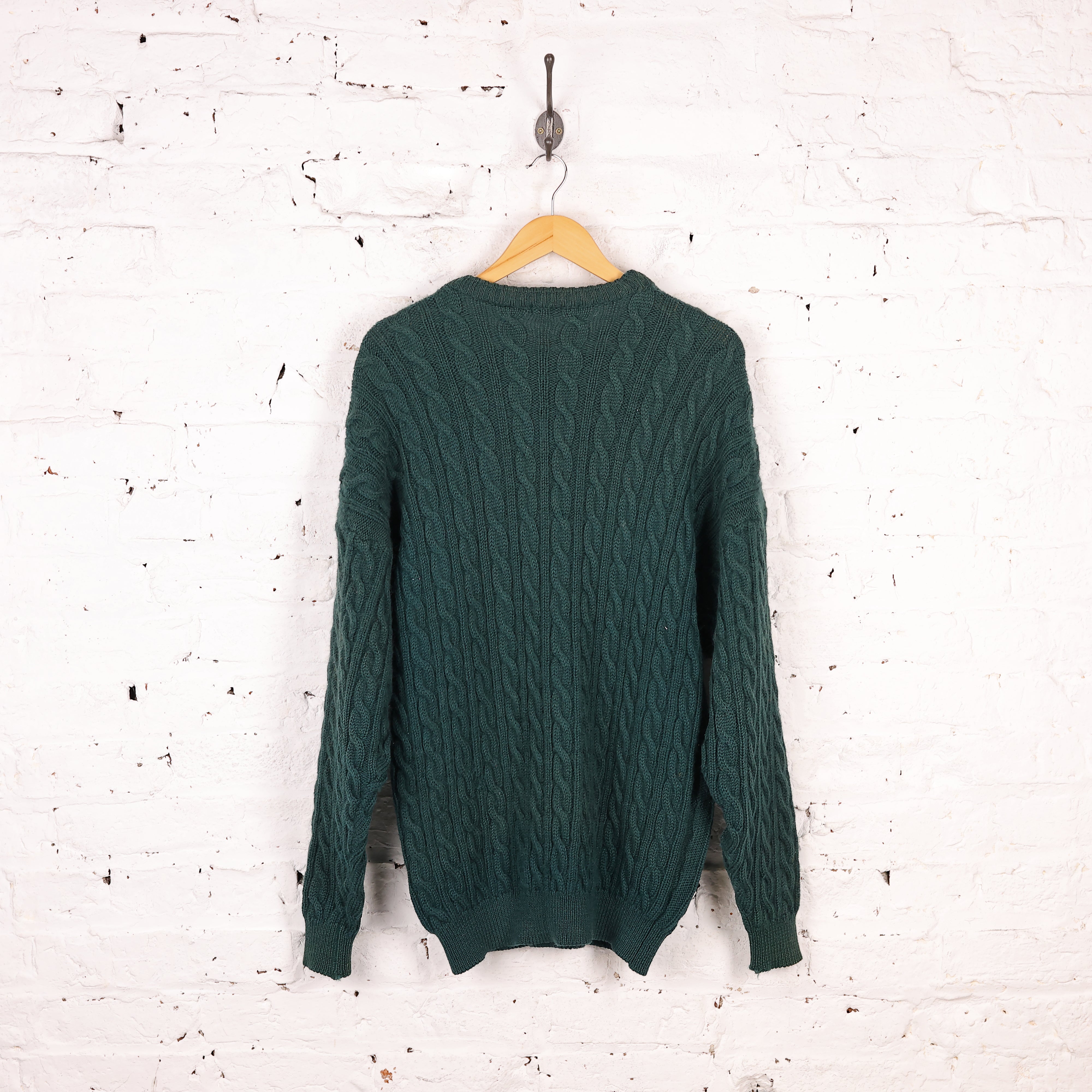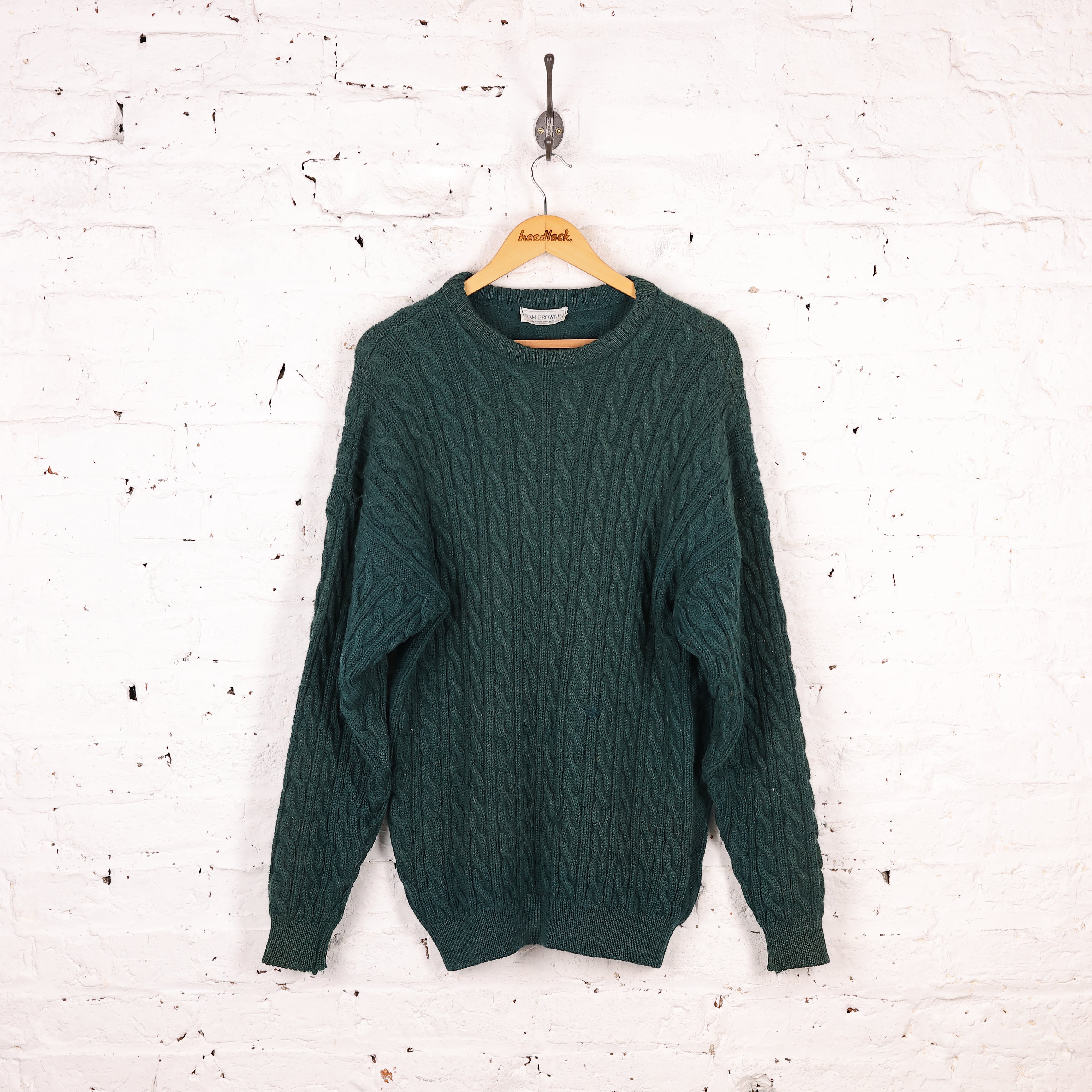 Good condition, some very small repairs. Cable knit jumper in green, crew neck made from 100% Irish Wool