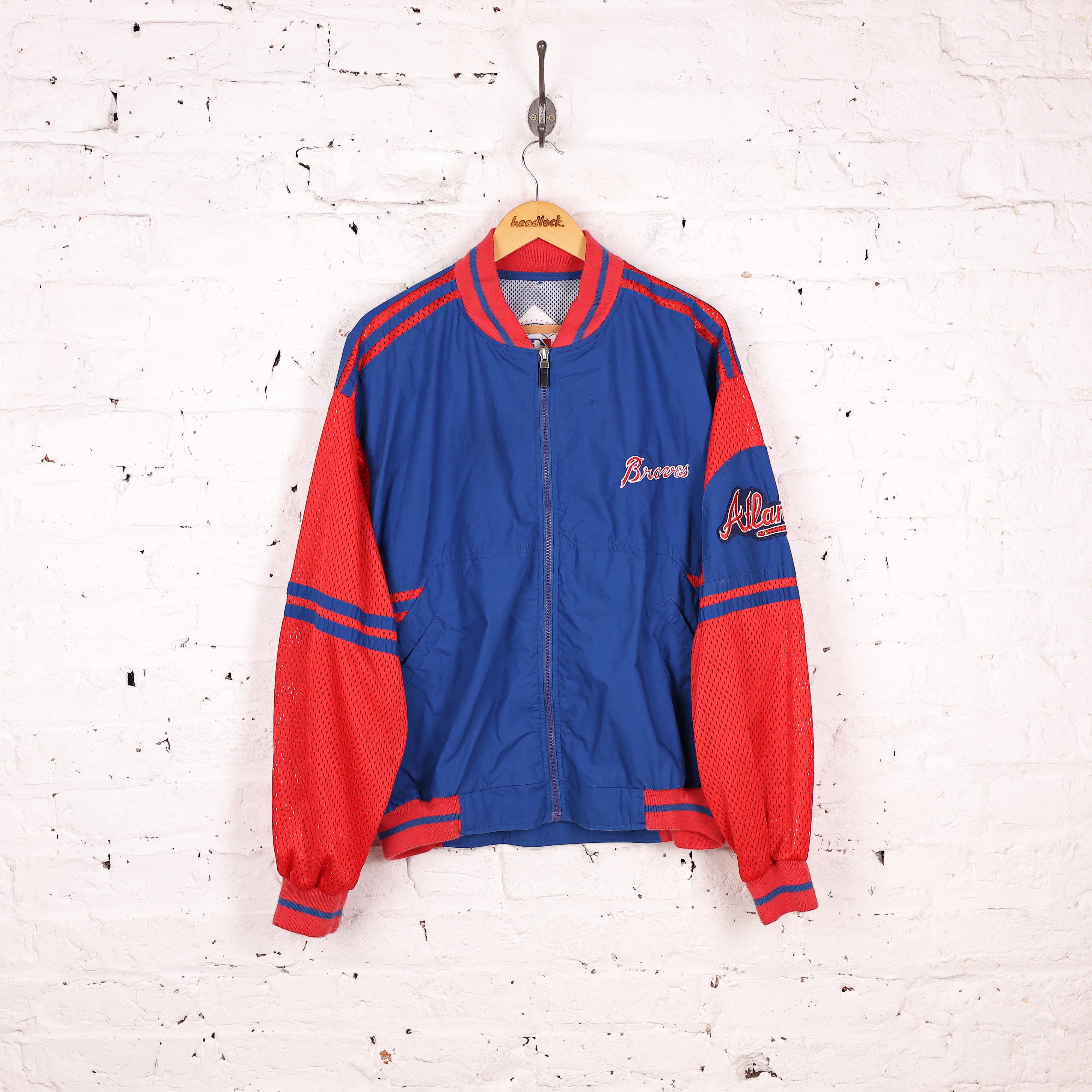 Good condition. 90s Atlanta Braves Baseball jacket, in blue and red colours with mesh sleeves and stitched badges and lettering. Genuine Merchandise