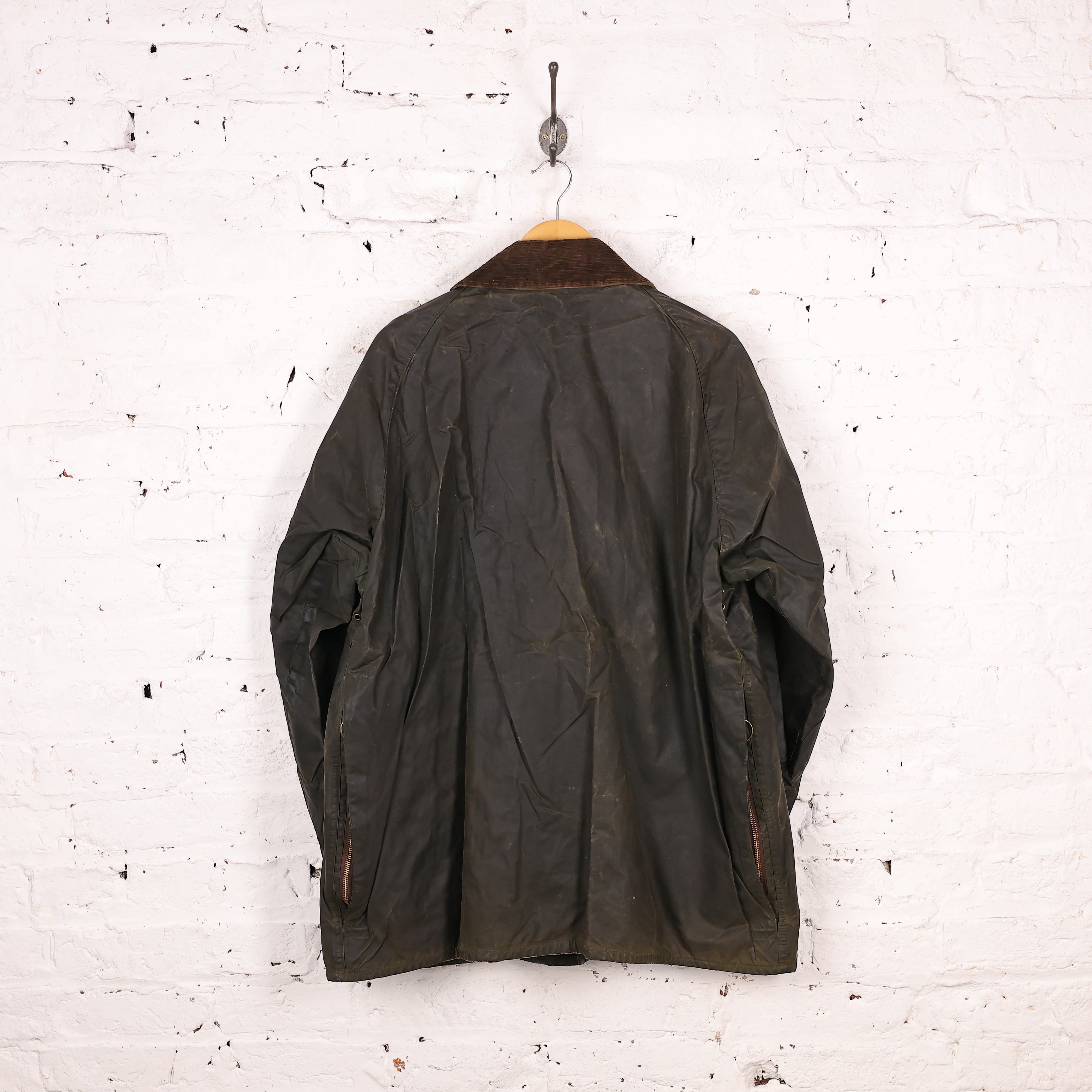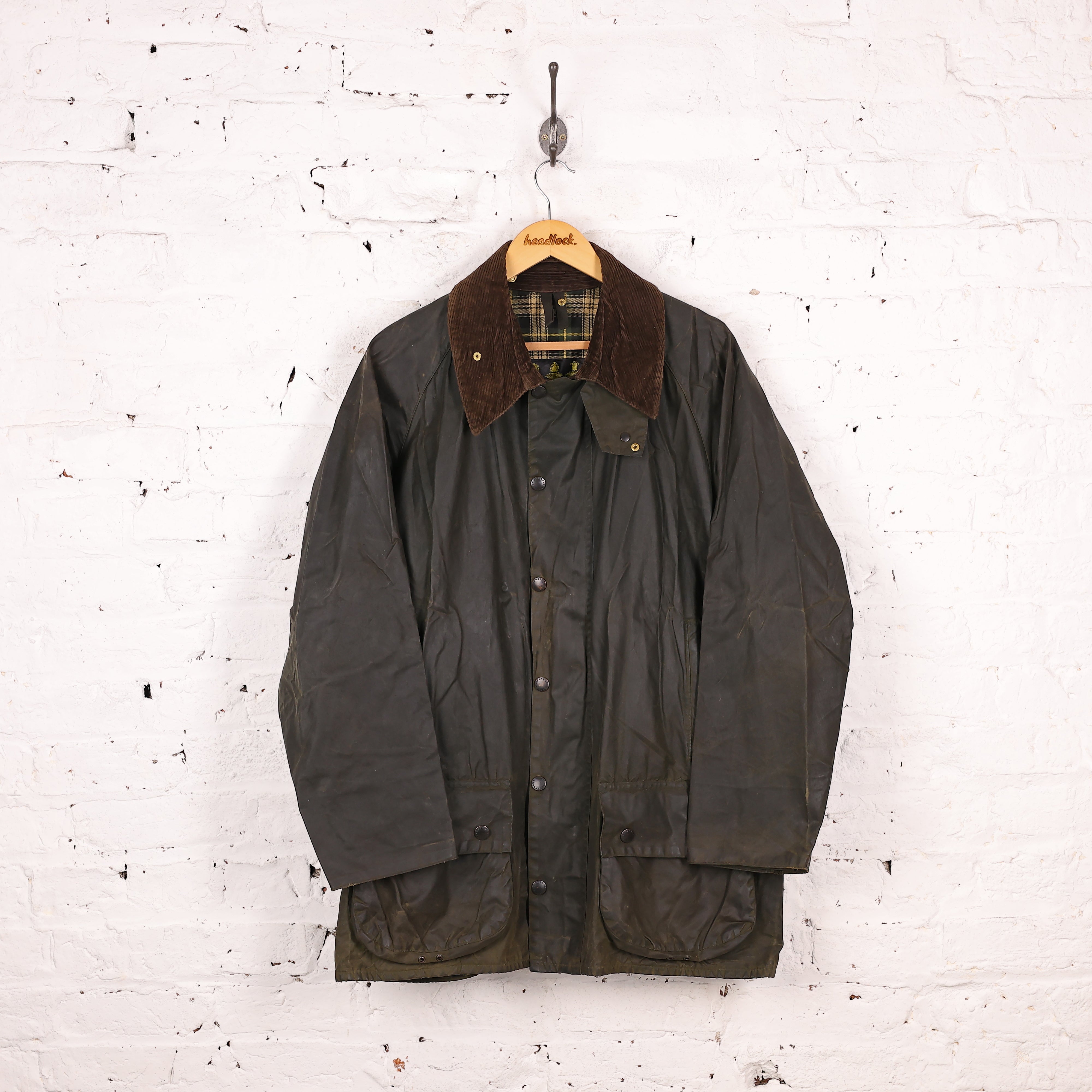 Good condition, small wear. Barbour Beaufort wax jacket in green with cord collar, check inner lining and four pockets. 46" chest.