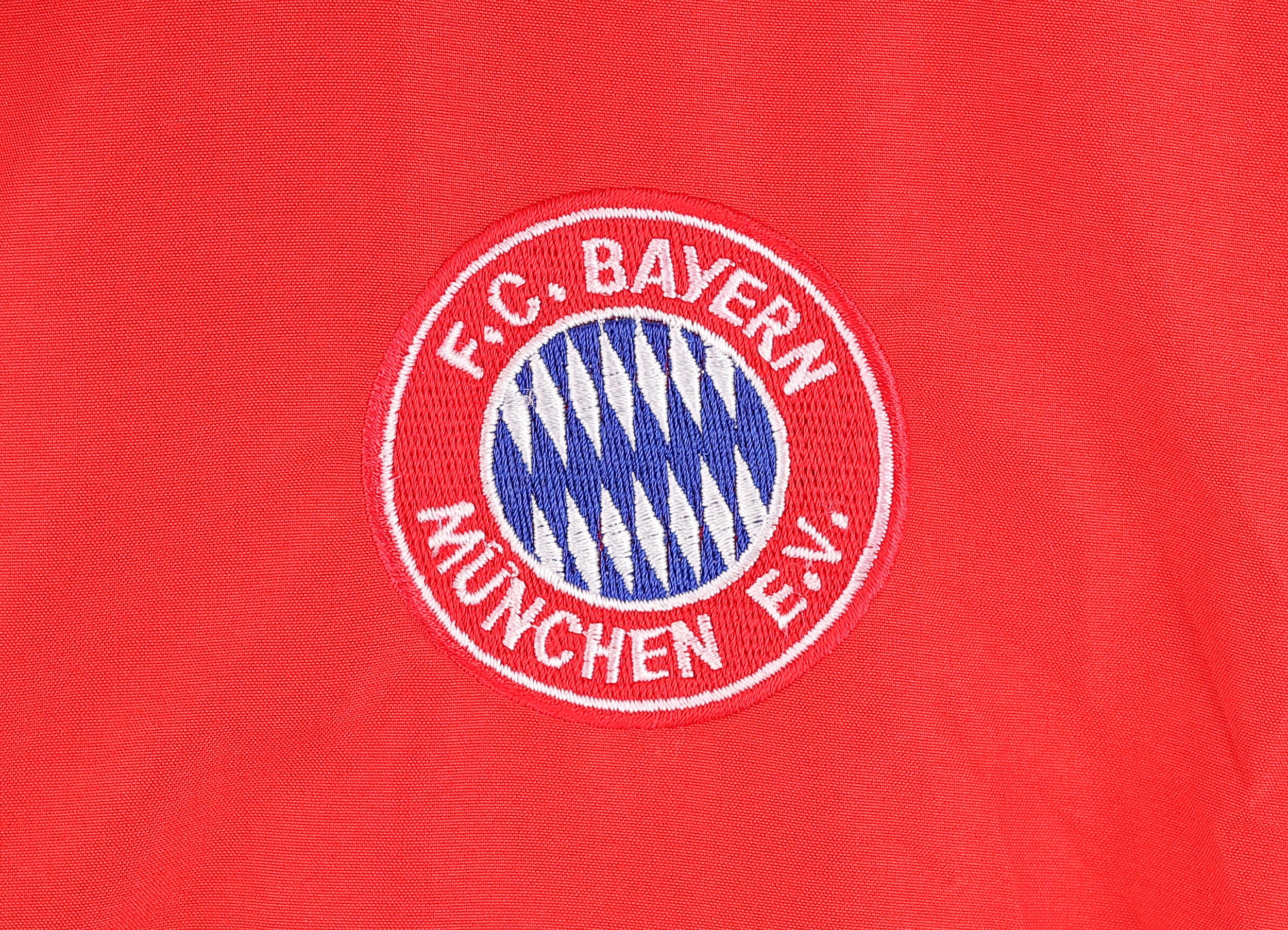Good condition. Bayern Munich tracksuit top in blue and red colours, stitched badges, three stripe down the front and with two zip pockets.