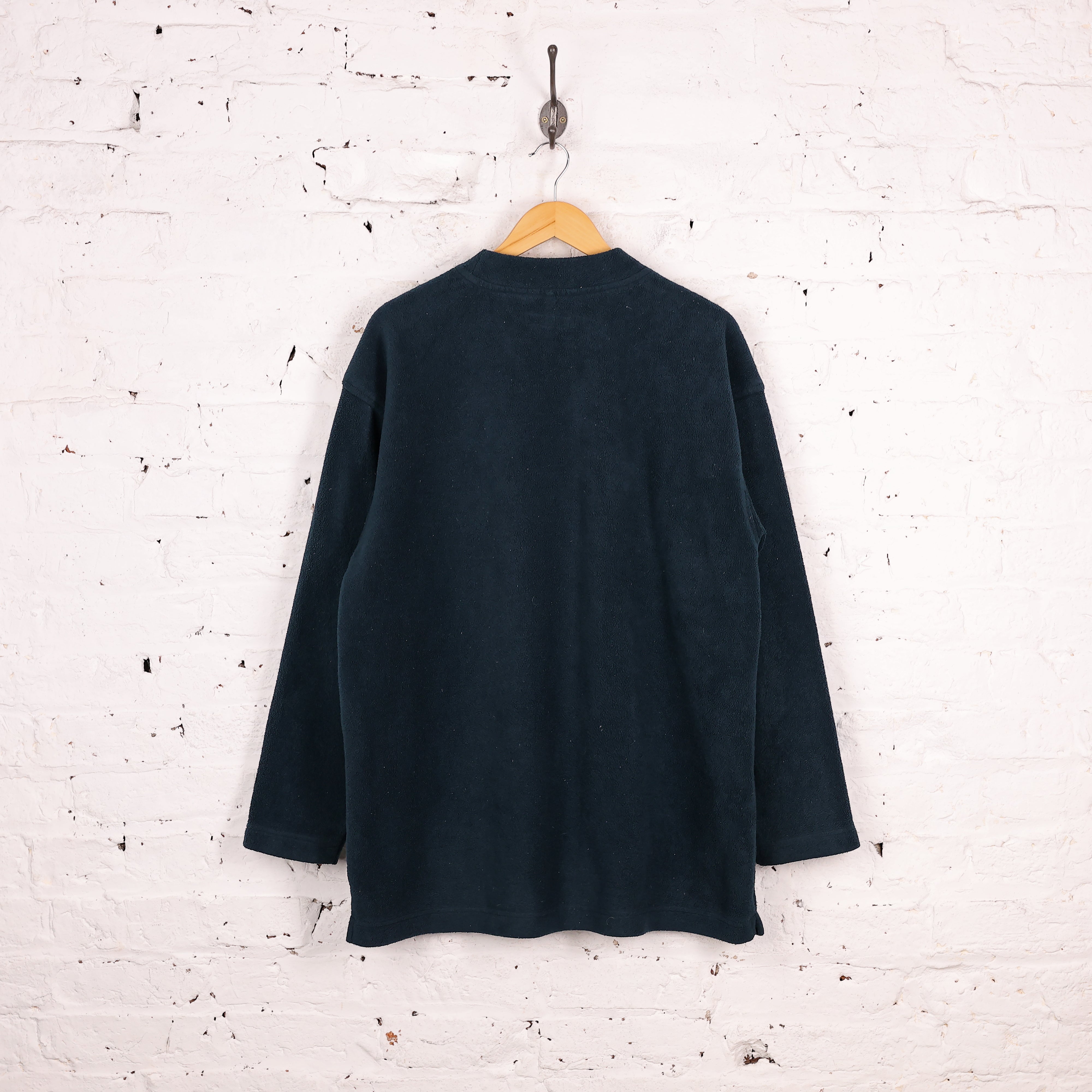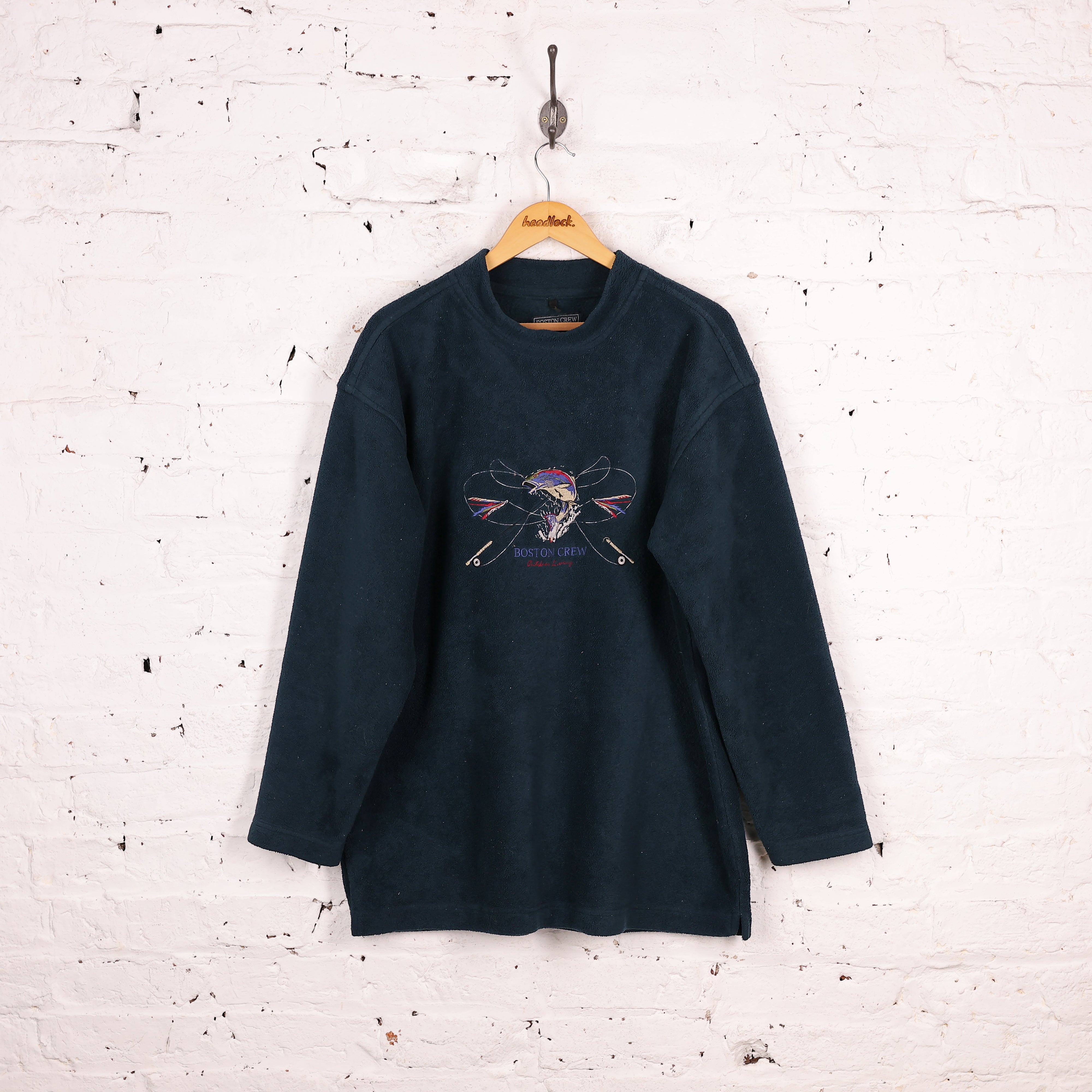 Good condition. Bottle green fleece with high neck and stitching fish/fishing image on the chest.
