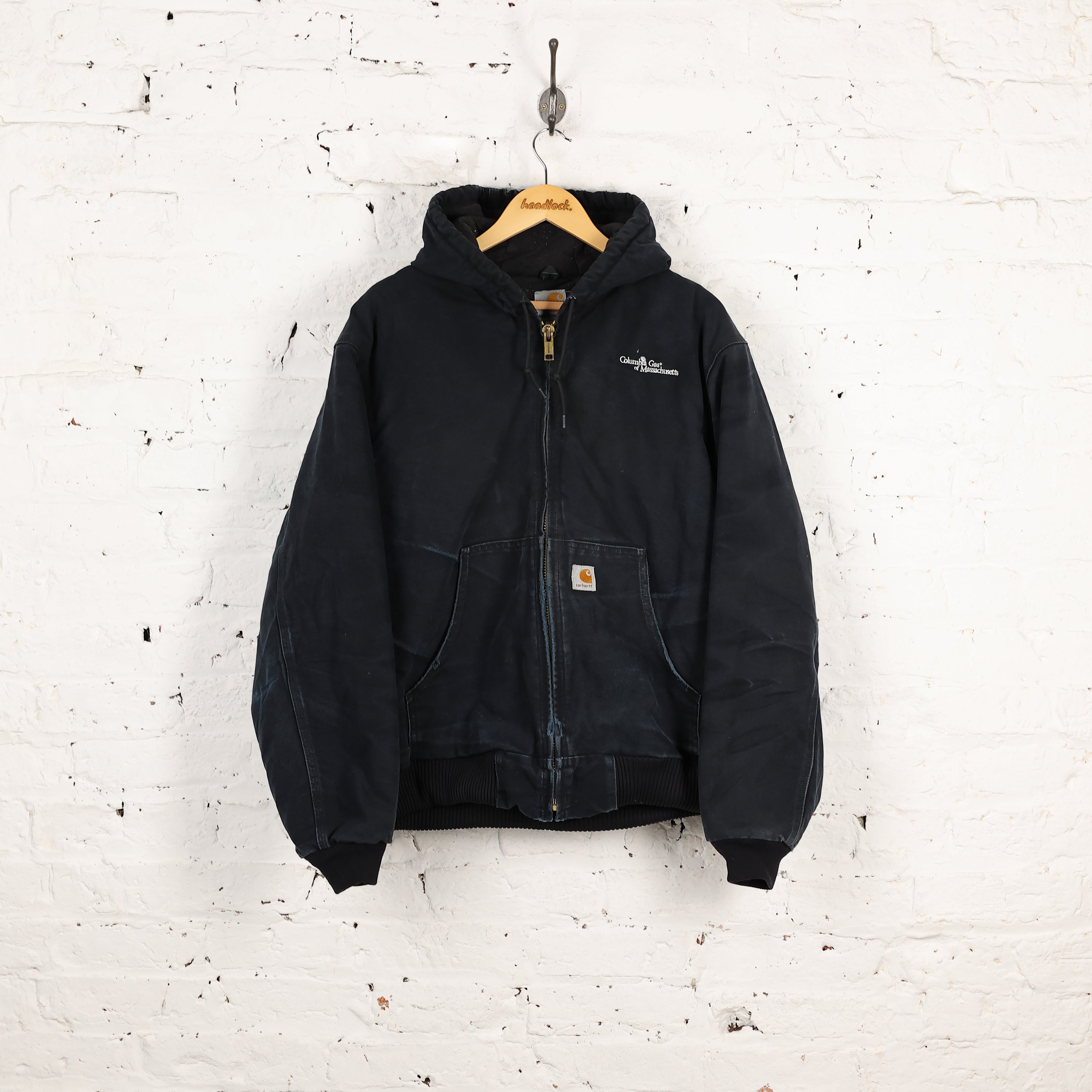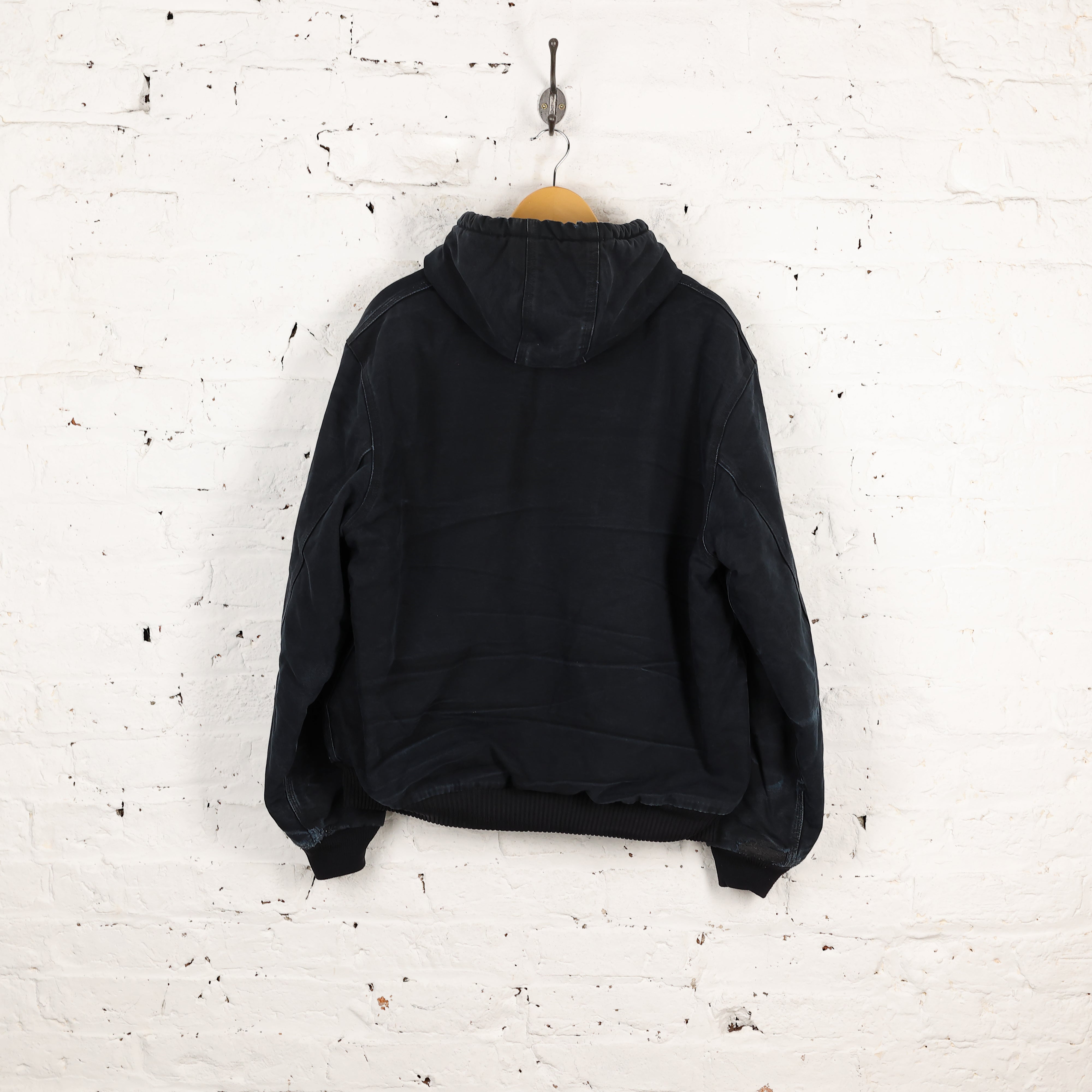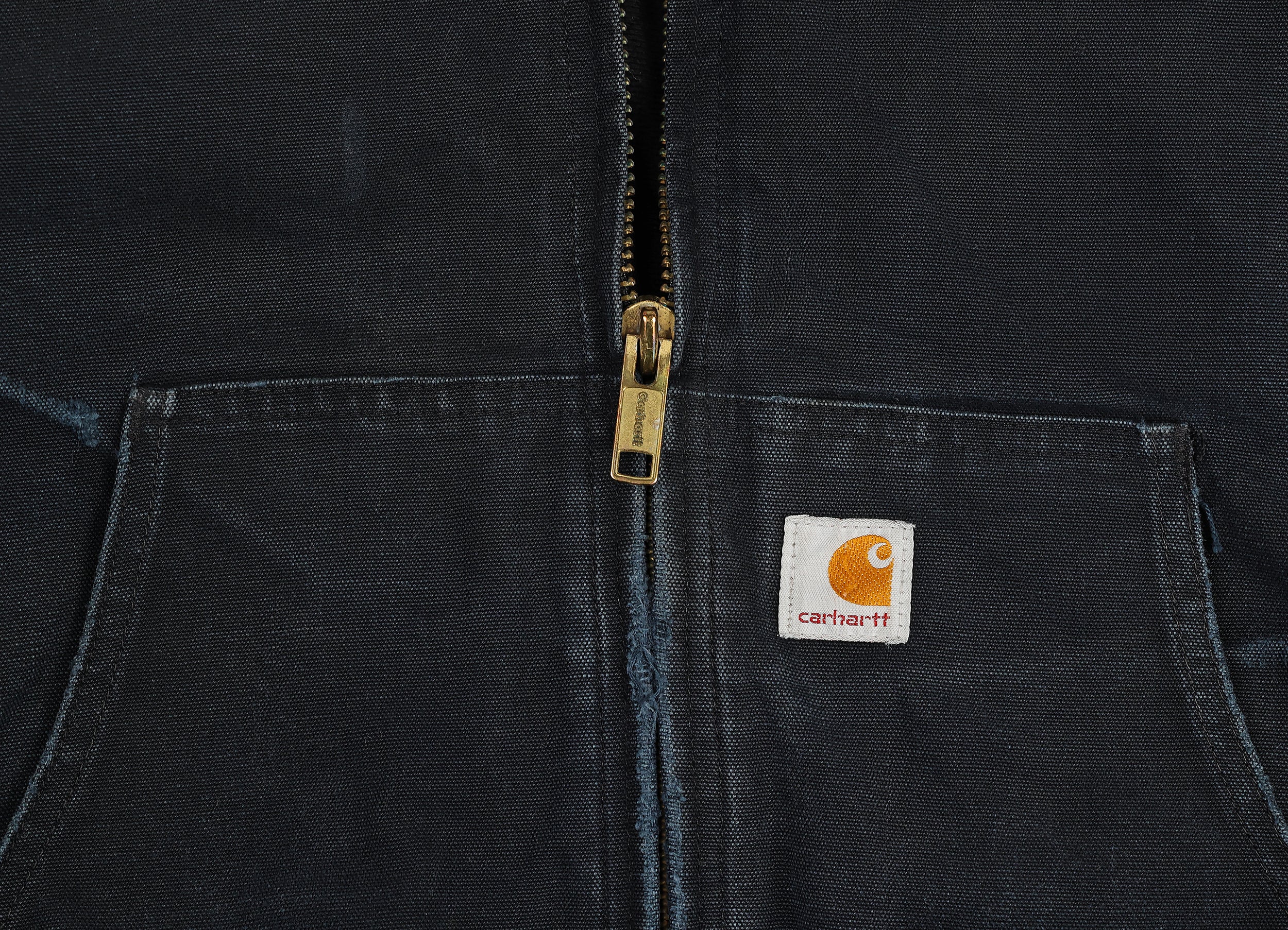 Good condition, but frayed to the front pocket and edges (pockets/zip). Carhartt hooded work jacket with blanket fleece lining and stitched tab logo.