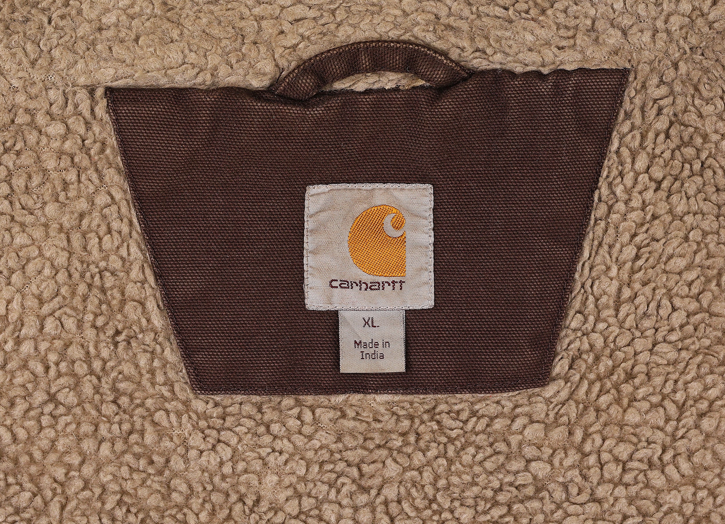 Good condition, but some frayed holes to the front and slight wear. Carhartt work jacket in brown with front pockets, fleece inner lining and stitched tab logo.