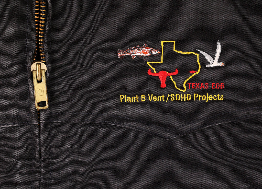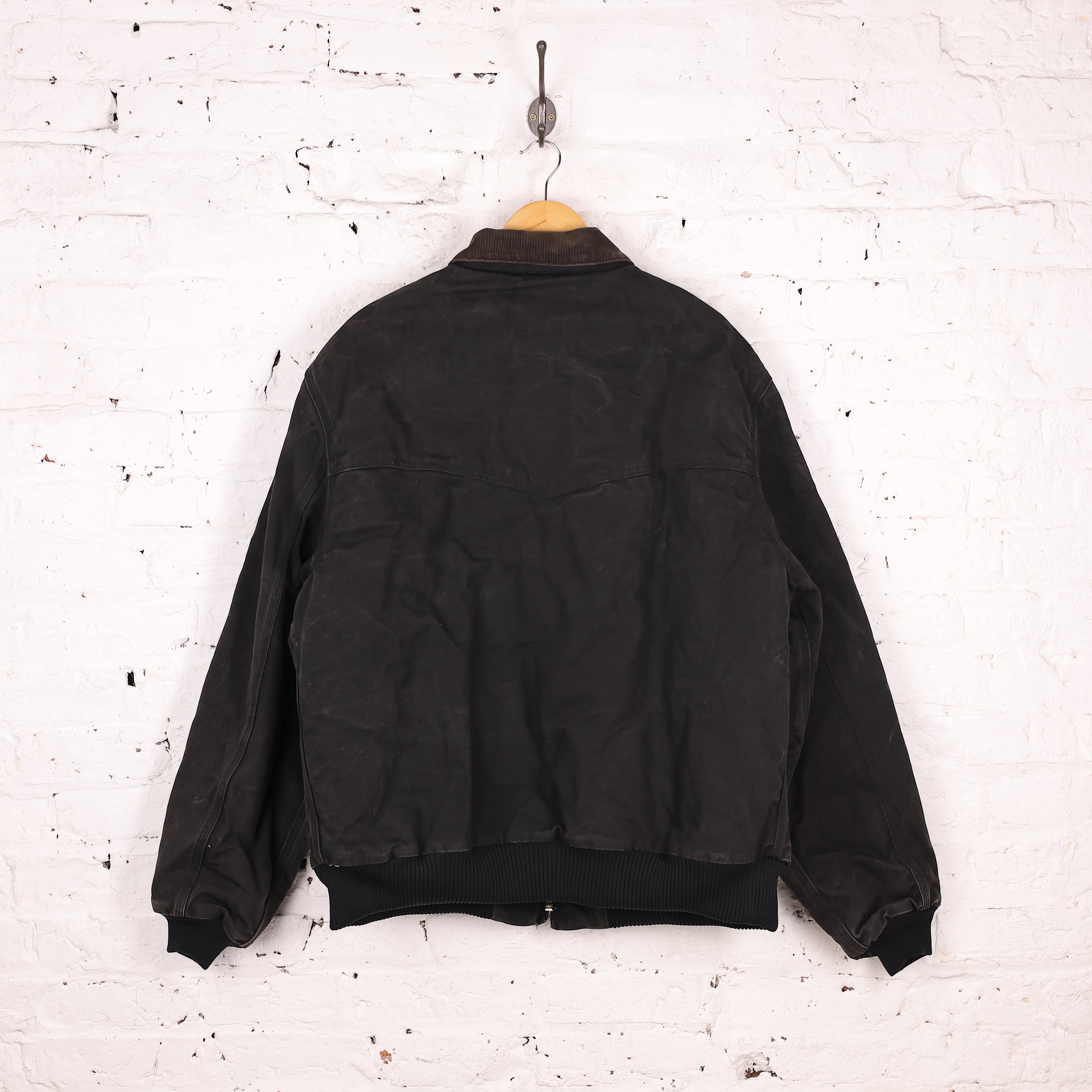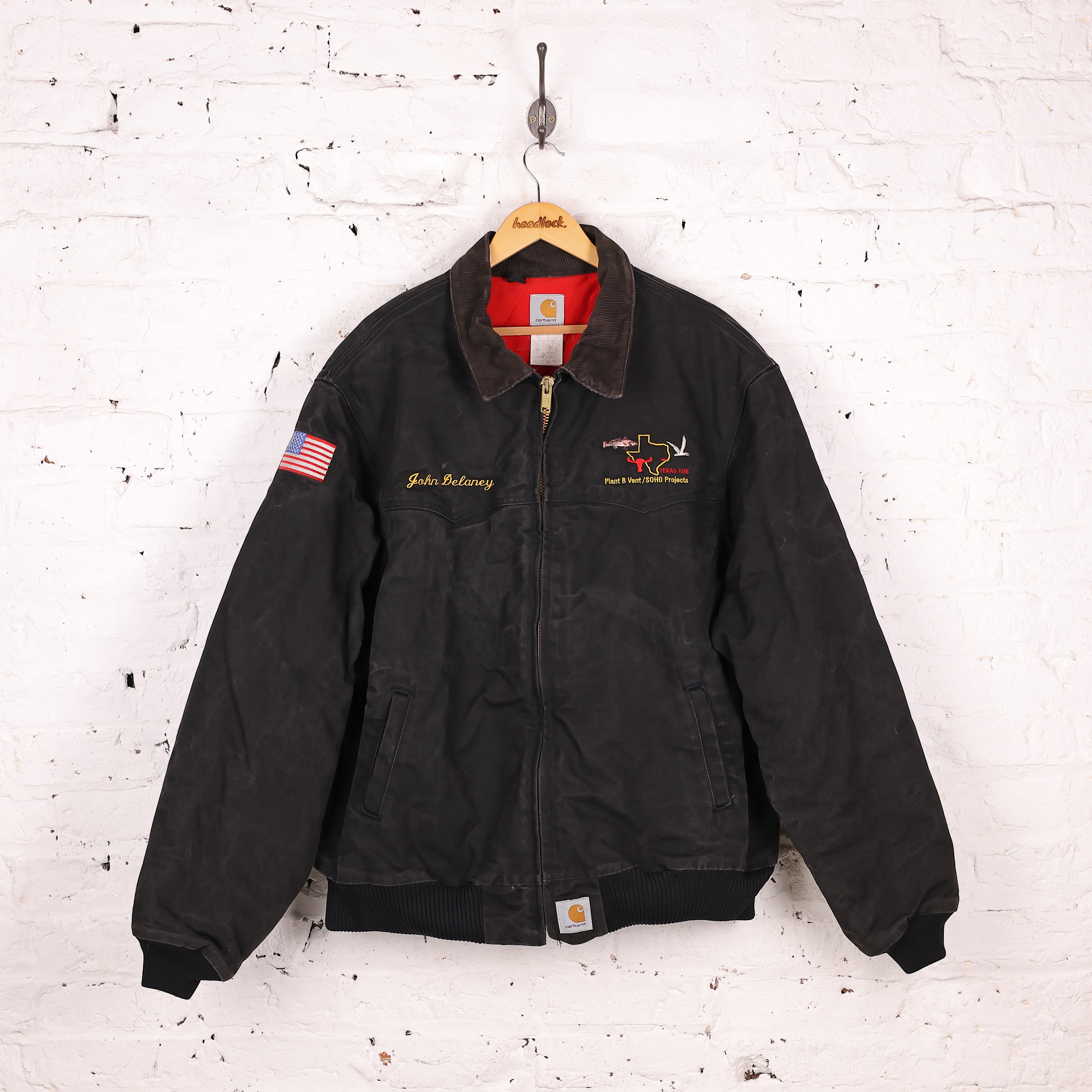 Good condition, some slight wear. Carhartt work jacket in black, faded fabric with stitched logos, American flag on the arm, two pockets and red blanket fleece lining.