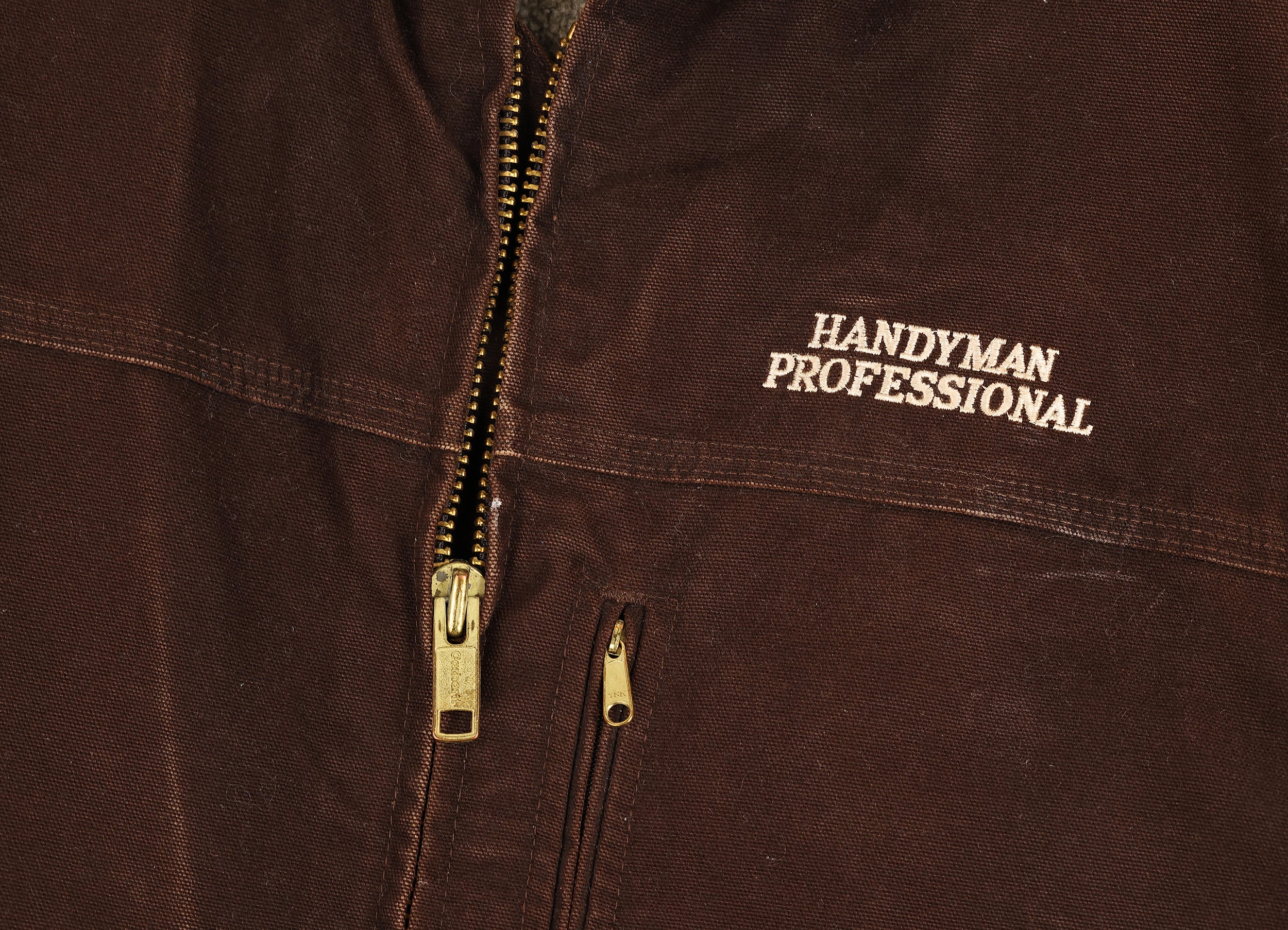 Excellent condition. Carhartt work jacket with two pockets, fleece inner lining and stitched "Handyman Professional" on the front