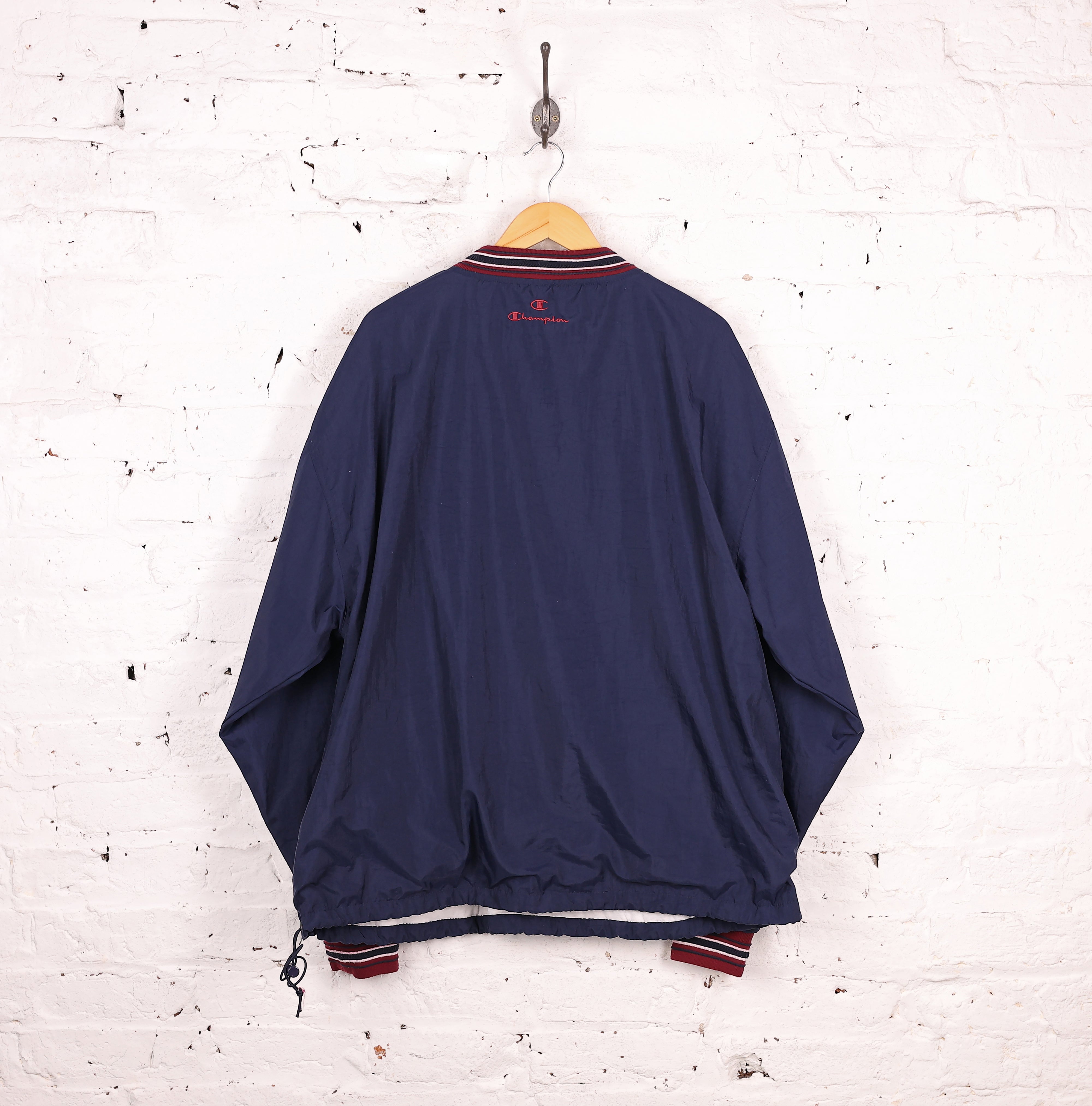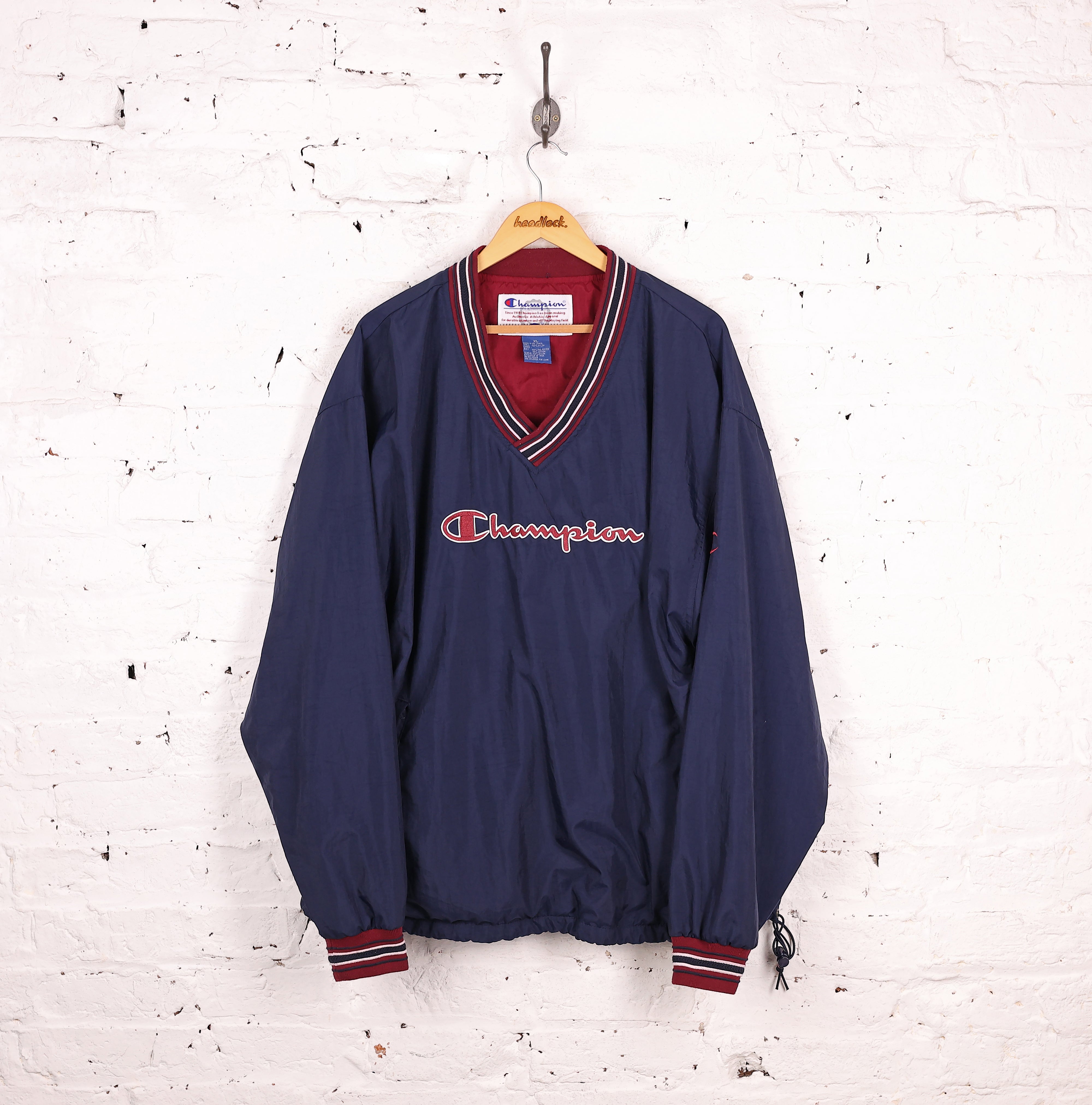 Good condition. Champion drill top in blue with stitched lettering, V neck and two side pockets.