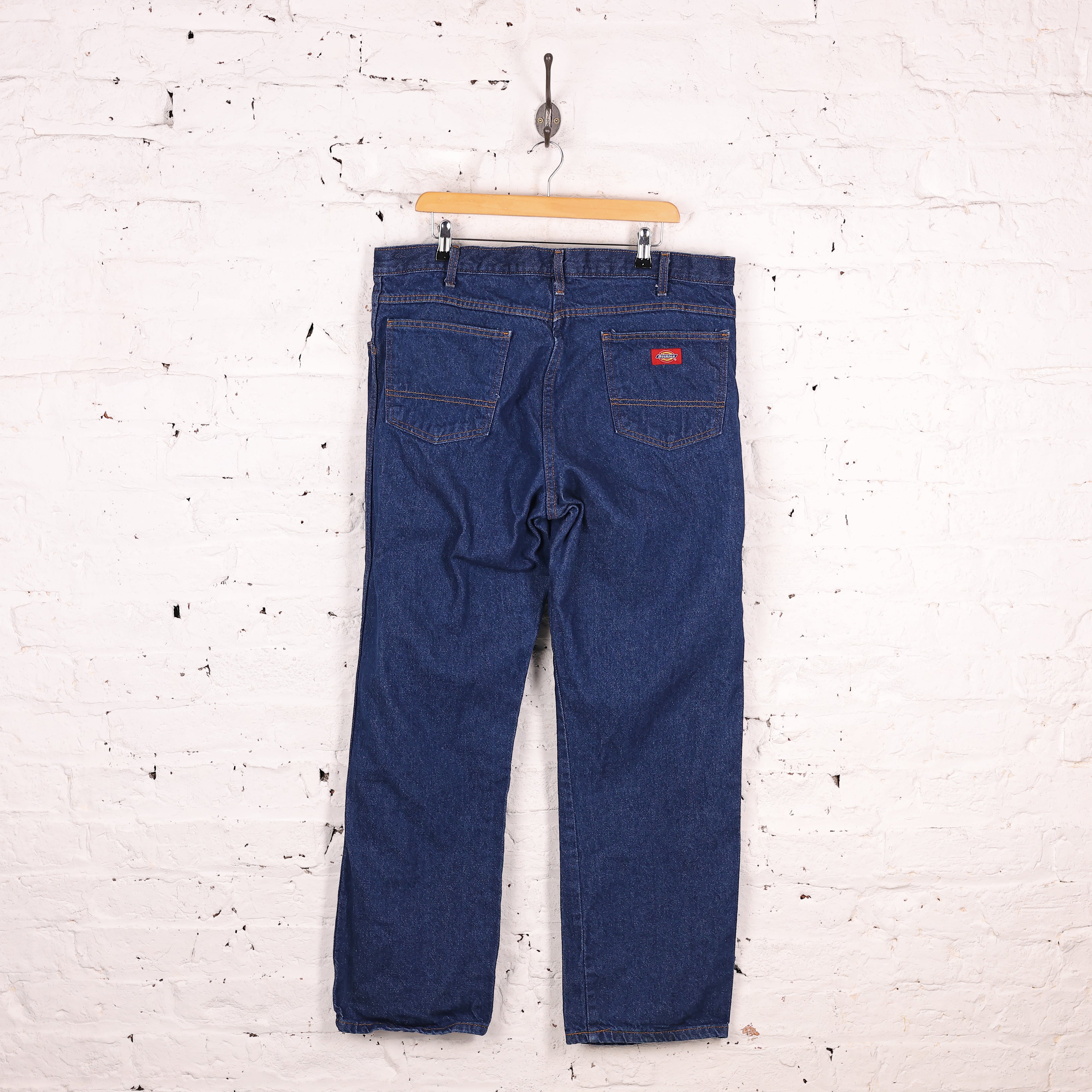 Excellent condition. Dickies work jeans in mid-dark blue denim, zip flies and tab on the back pockets. Waist: 38" Leg: 30"