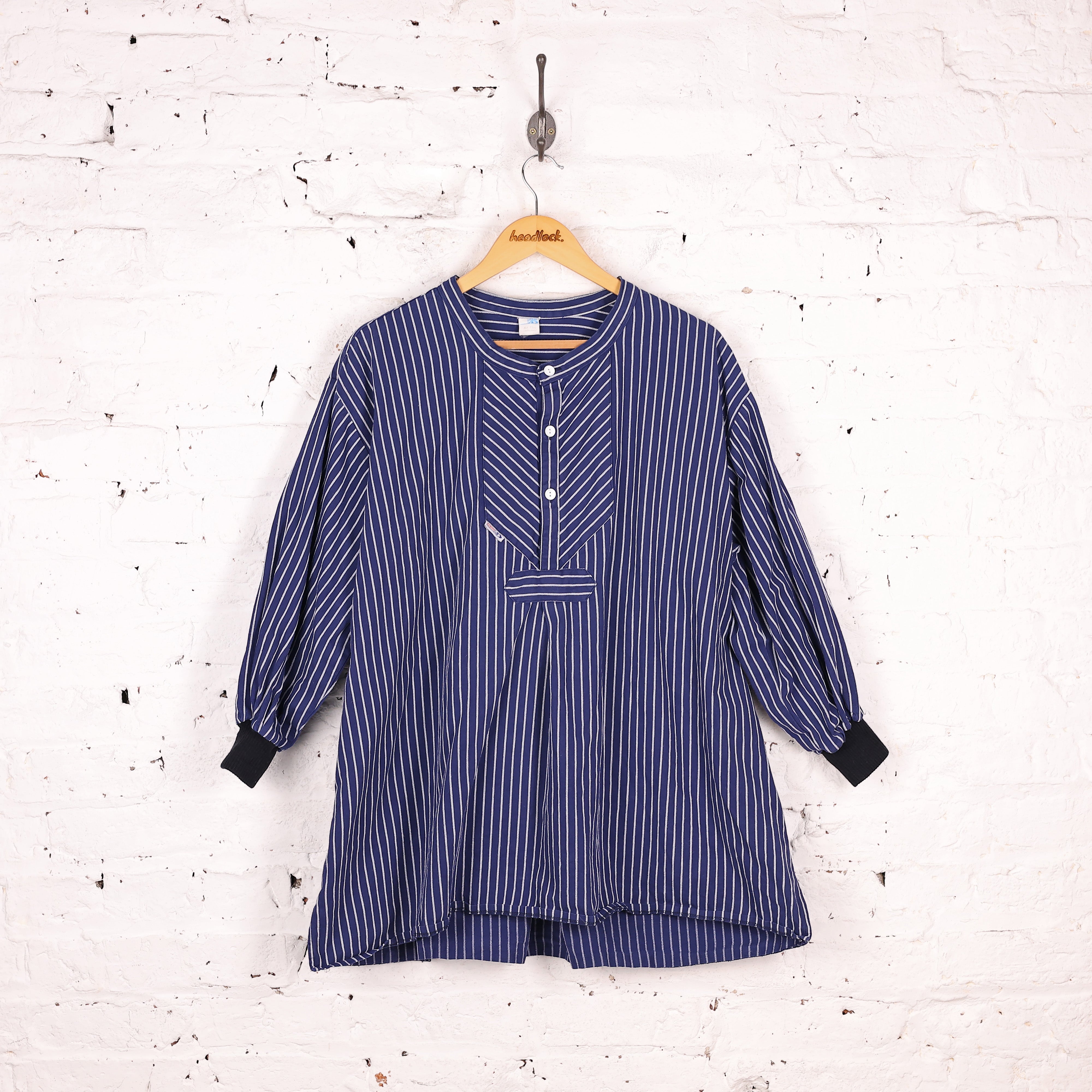 Good condition. Fisherman striped shirt with grandad collar, white buttoning and elasticated cuffs.