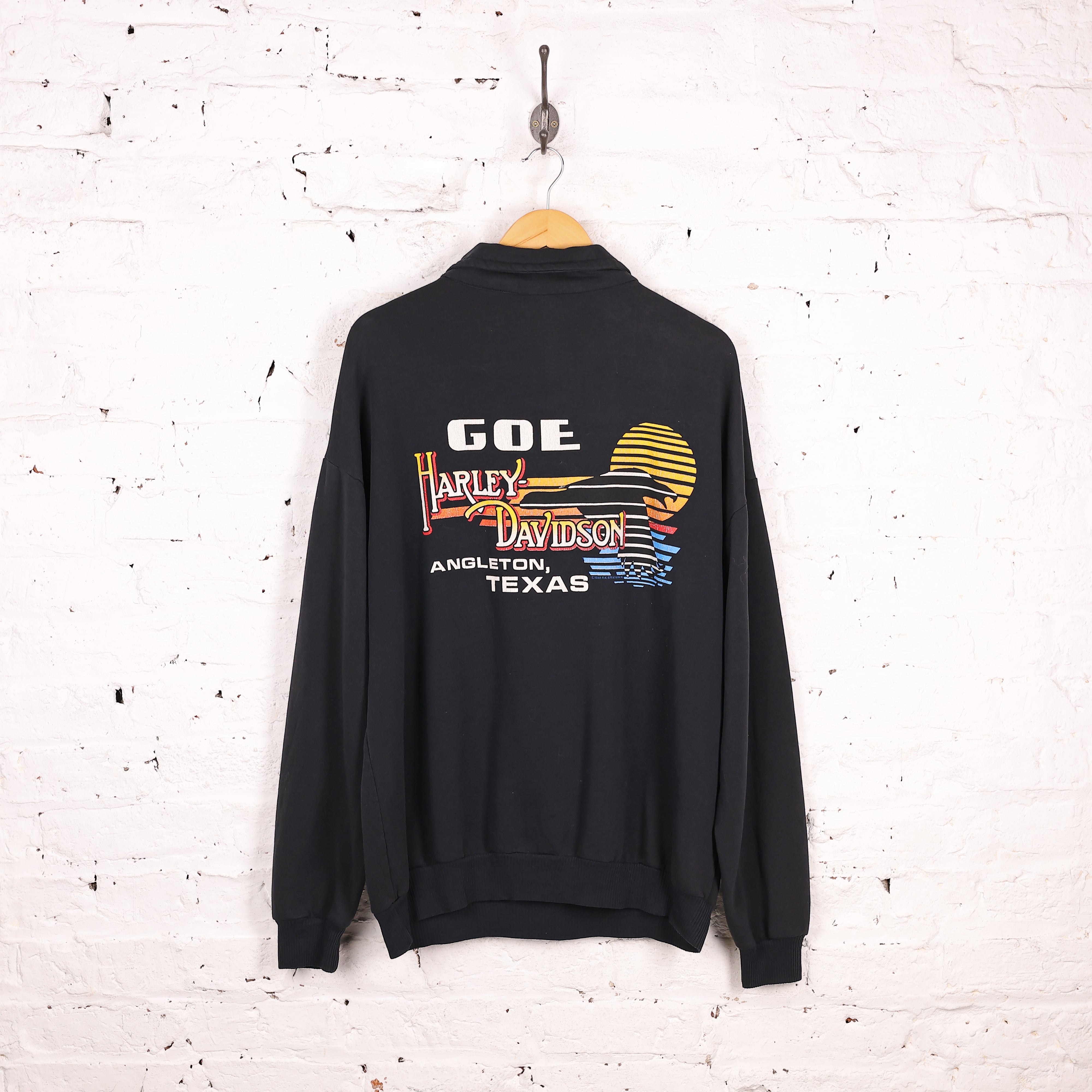 Good condition, some small pulls. Harley Davidson 1/4 zip sweatshirt from 1990 with Eagle image on the front and Texas dealership on the back. From 1990
