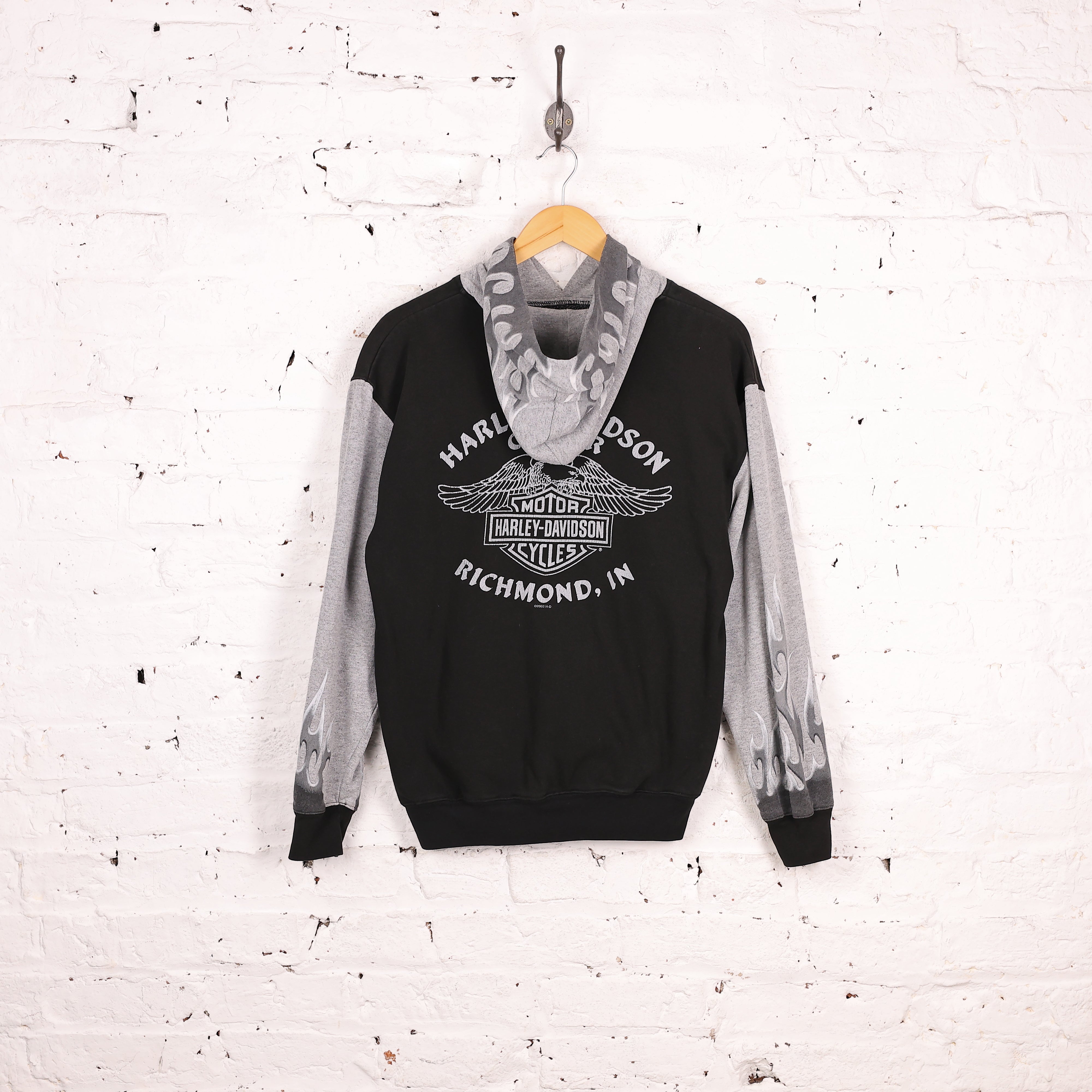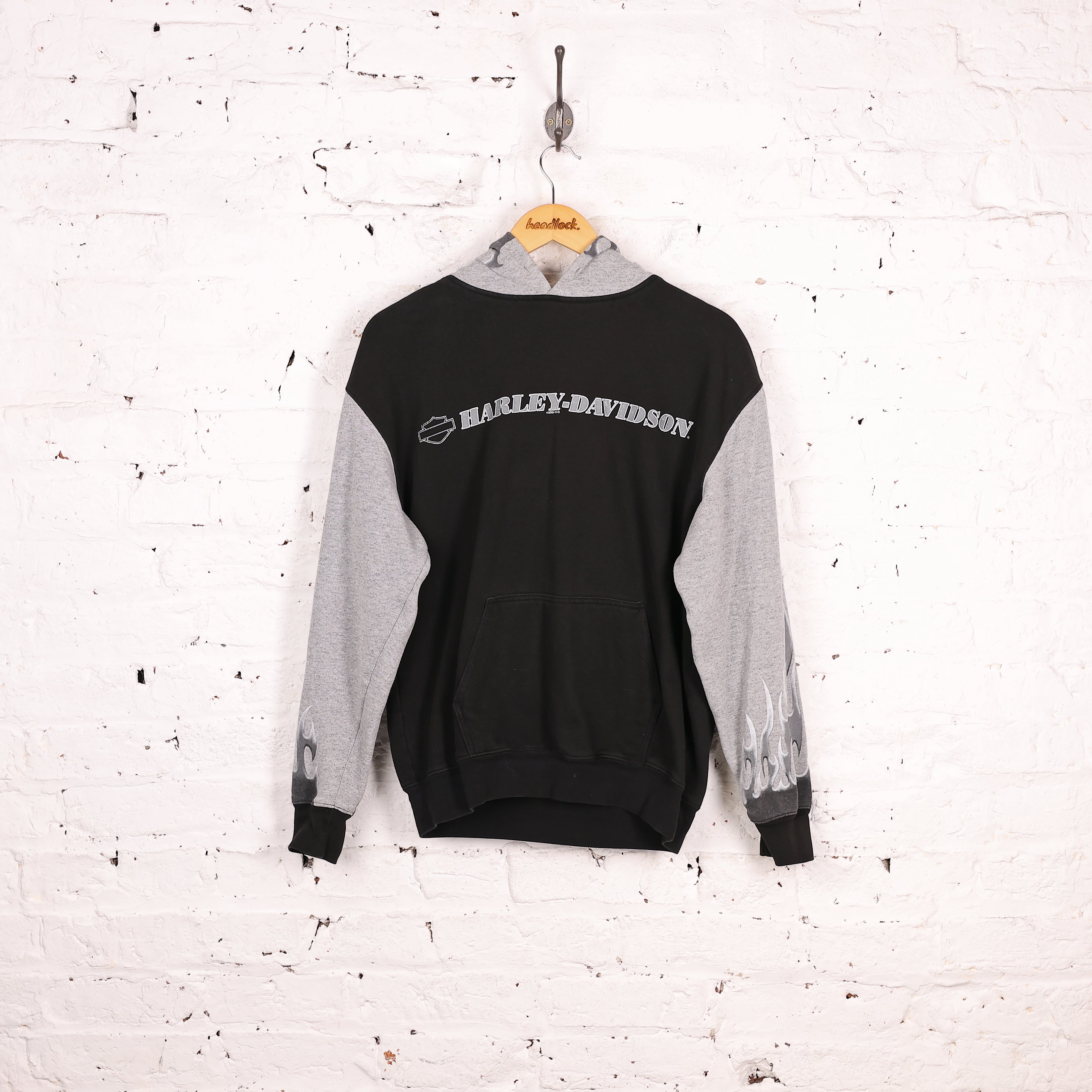 Good condition, no drawstring. Harley Davidson hoodie in black and grey with spell out logo across the chest.